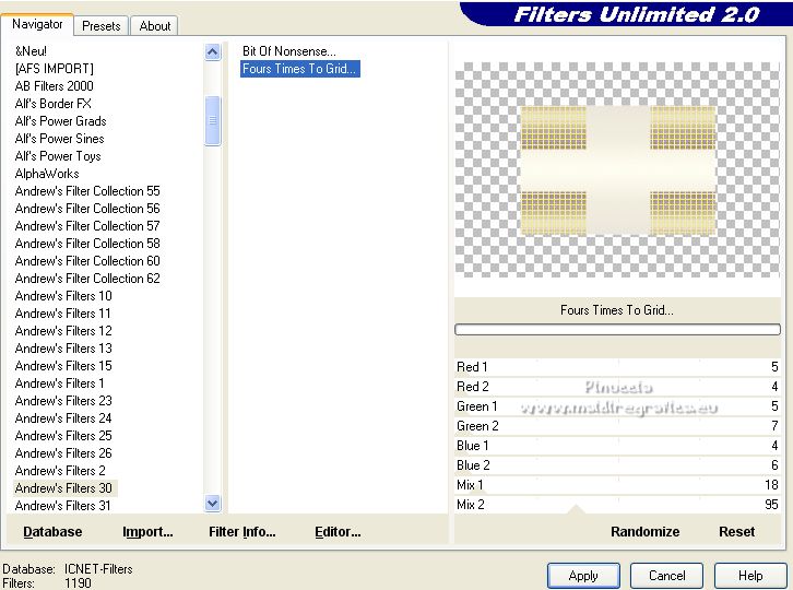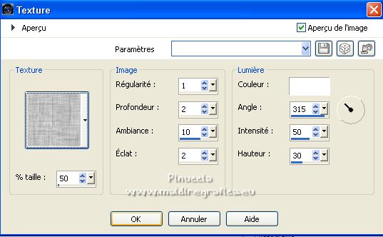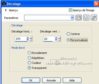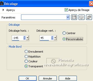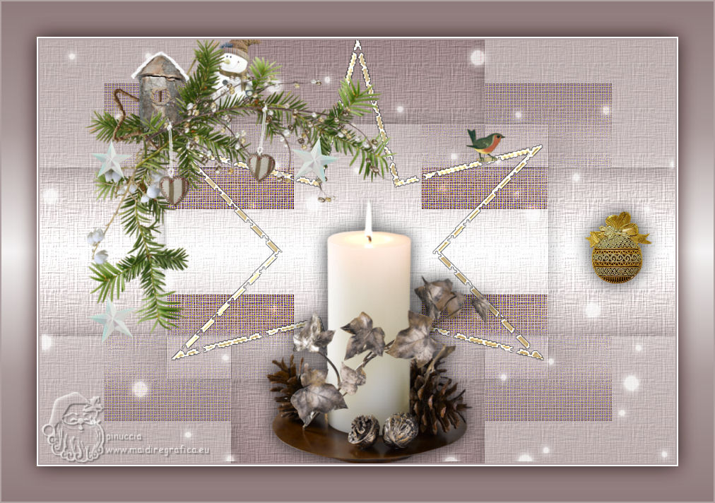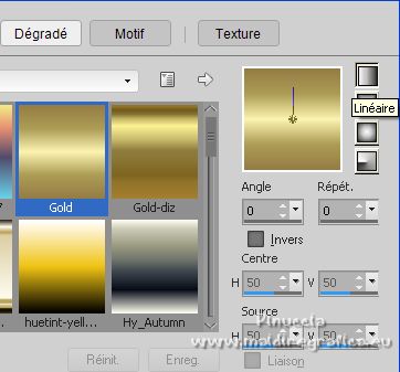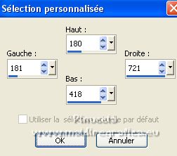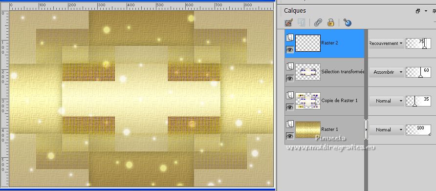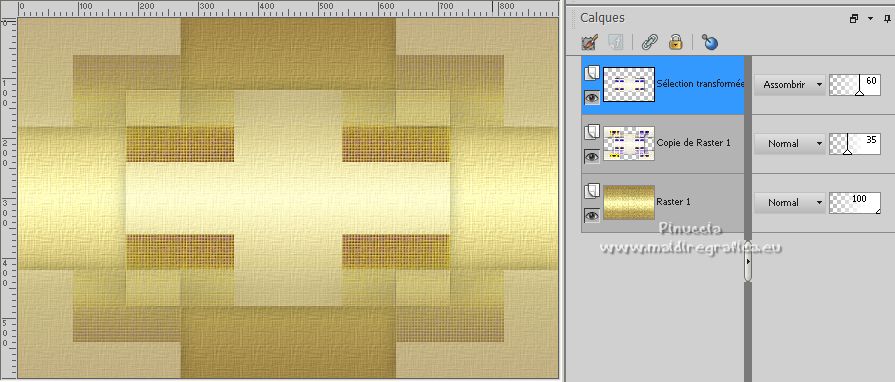 Ce tutoriel a été créé avec CorelX17, mais il peut également être exécuté avec les autres versions. Pour traduire le tutoriel j'ai utilisé CorelX17 pour l'italien et CorelX2 pour le français. Suivant la version utilisée, vous pouvez obtenir des résultats différents. Depuis la version X4, la fonction Image>Miroir a été remplacée par Image>Renverser horizontalement, et Image>Renverser avec Image>Renverser verticalement. Dans les versions X5 et X6, les fonctions ont été améliorées par la mise à disposition du menu Objets. Dans la nouvelle version X7, nous avons à nouveau Miroir/Renverser, mais avec autres différences. Voir plus les détails à ce sujet ici Certaines dénominations ont changées entre les versions de PSP. Les plus frequentes dénominations utilisées: ![]() Traduction en italien ici Vos versions iciNécessaire pour réaliser ce tutoriel: Matériel qui (les liens des sites des tubeuses ici) Modules Externes consulter, si nécessaire, ma section de filtre ici Filters Unlimited 2.0 ici Andrew's Filter 30 - Fours Time to Grid ici Filters Andrew's peuvent être utilisés seuls ou importés dans Filters Unlimited. voir comment le faire ici). Si un filtre est fourni avec cette icône, ![]() ![]() Si vous voulez utiliser vos propres couleurs, n'hésitez pas à changer le mode et l'opacité des calques Placer le dégradé dans le dossier Dégradés. La texture Corel_15_021 ou Hachure Fine est standard in PSP. Si vous ne la trouvez pas dans votre Psp, placer la texture fournie dans le dossier Textures. 1. Placer en avant plan la couleur #baa258, et en arrière plan la couleur #fcfbef. ![]() Placer en avant plan le Dégradé et sélectionner le dégradé Gold, style Linéaire. ![]() 2. Ouvrir une nouvelle image transparente 900 x 600 pixels. ![]() Remplir l'image transparente du dégradé.3. Effets>Effets de textures>Texture - Sélectionner la texture Hachure fine ou Corel_15_021 ![]() 4. Calques>Dupliquer. Image>Redimensionner, al 60%, redimensionner tous les calques décoché. 5. Effets>Modules Externes>Filters Unlimited 2.0 - Andrew's Filter 30 - Four Times to Grid, par défaut. ![]() 6. Effets>Effets d'image>Mosaïque sans jointures, par défaut. ![]() 7. Réduire l'opacité de ce calque à 35%. 8. Effets>Effets 3D>Ombre portée, couleur noire. ![]() Effets>Effets de bords>Accentuer. 9. Activer l'outil Sélection ![]() (peu importe le type de sélection, parce que avec la sélection personnalisée vous obtenez toujours un rectangle), cliquer sur Sélection personnalisée ![]() et setter ces paramètres. ![]() 10. Sélections>Transformer la sélection en calque. Sélections>Désélectionner tout. 11. Placer le calque en mode Assombrir et réduire l'opacité à 60%. ![]() 12. Effets>Effets 3D>Ombre portée, couleur noire. ![]() 13. Ouvrir deco-1-2021.png et Édition>Copier. Revenir sur votre travail et Édition>Coller comme nouveau calque. 14. Placer le calque en mode Recouvrement et réduire l'opacité à 75%. ![]() 15. Ouvrir Ster-mb.png et Édition>Copier. Revenir sur votre travail et Édition>Coller comme nouveau calque. 16. Ouvrir 09 xmas cajoline_mix38_cu3.png et Édition>Copier. Revenir sur votre travail et Édition>Coller comme nouveau calque. 17. Effets>Effets d'image>Décalage. ![]() 18. Ouvrir 136.png et Édition>Copier. Revenir sur votre travail et Édition>Coller comme nouveau calque. 19. Effets>Effets d'image>Décalage. ![]() 20. Ouvrir vogeltje.png et Édition>Copier. Revenir sur votre travail et Édition>Coller comme nouveau calque. 21. Effets>Effets d'image>Décalage. ![]() 22. Ouvrir kransje.png et Édition>Copier. Revenir sur votre travail et Édition>Coller comme nouveau calque. 23. Effets>Effets d'image>Décalage. ![]() 24. Image>Ajouter des bordures, 2 pixels, symétrique, couleur foncée. Image>Ajouter des bordures, 2 pixels, symétrique, couleur claire. 25. Sélections>Sélectionner tout. Image>Ajouter des bordures, 50 pixels, symétrique, n'importe quelle couleur. Sélections>Inverser. Remplir la sélection du dégradé.26. Sélections>Inverser. Effets>Effets 3D>Ombre portée, couleur noire. ![]() Sélections>Désélectionner tout. 27. Image>Ajouter des bordures, 2 pixels, symétrique, couleur foncée. 28. Signer votre travail sur un nouveau calque. Enregistrer en jpg. Version avec tubes de Azalée et Kara ![]() ![]() Si vous avez des problèmes, ou des doutes, ou vous trouvez un link modifié, ou seulement pour me dire que ce tutoriel vous a plu, vous pouvez m'écrire. |