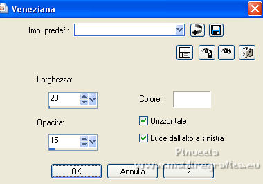 qui puoi trovare qualche risposta ai tuoi dubbi. Se l'argomento che ti interessa non è presente, ti prego di segnalarmelo. Per tradurre il tutorial ho usato PSPX e PSPX2, ma può essere eseguito con ogni versione di PSP. Dalla versione X4, il comando Immagine>Rifletti è stato sostituito con Immagine>Capovolgi in orizzontale, e il comando Immagine>Capovolgi con Immagine>Capovolgi in verticale. Nelle versioni X5 e X6, le funzioni sono state migliorate rendendo disponibile il menu Oggetti. Con la nuova versione X7, sono tornati Rifletti/Capovolgi, ma con nuove differenze Vedi la scheda sull'argomento qui traduzione in francese qui Le vostre versioni qui![]() Occorrente: ![]() Per il tube grazie Rooskes (in questa pagina trovi i links ai siti dei creatori di tubes) ![]() in caso di dubbi, ricorda di consultare la mia sezione filtri qui Filters Unlimited 2.0 qui [AFS IMPORT] - sqborder2 qui Simple - Left Right Wrap (Bonus) qui I filtri [AFS IMPORT] e Simple si possono usare da soli o importati in Filters Unlimited (come fare vedi qui) Se un filtro fornito appare con questa icona ![]() se stai usando altri colori, sperimenta le modalità di miscelatura e opacità più adatte ai tuoi colori Nelle ultime versioni di PSP non c'é il gradiente di primo piano/sfondo (Corel_06_029) Puoi usare i gradienti delle versioni precedenti. Trovi qui i gradienti Corel X. Metti la selezione nella cartella Selezioni. 1. Imposta il colore di primo piano con #2d5736, e il colore di sfondo con #c2dac8. ![]() Passa il colore di primo piano a Gradiente di primo piano/sfondo. ![]() 2. Apri una nuova immagine trasparente 800 x 550 pixels. ![]() Riempi l'immagine trasparente con il gradiente.3. Effetti>Plugins>Filters Unlimited 2.0 - AFS IMPORT - sqborder2, con i settaggi standard. ![]() 4. Effetti>Effetti di immagine>Motivo unico, con i settaggi standard. ![]() 5. Effetti>Effetti geometrici>Inclina. ![]() 6. Livelli>Duplica. Immagine>Rifletti. Abbassa l'opacità di questo livello al 50%. 7. Livelli>Unisci>Unisci giù. 8. Selezione>Carica/Salva selezione>Carica selezione da disco. Cerca e carica la selezione kerst-3-2022.PspSelection. ![]() Selezione>Innalza selezione a livello. Selezione>Deseleziona. 9. Livelli>Duplica. Immagine>Capovolgi. Livelli>Unisci>Unisci giù. 10. Effetti>Effetti 3D>Sfalsa ombra, colore nero. ![]() 11. Livelli>Duplica. Effetti>Plugins>Filters Unlimited 2.0 - Simple - Left Right Wrap. ![]() 12. Effetti>Effetti di trama>Veneziana, colore bianco. ![]() 13. Effetti>Effetti 3D>Sfalsa ombra, colore nero. ![]() 14. Apri deco-1-groen.png e vai a Modifica>Copia.Torna al tuo lavoro e vai a Modifica>Incolla come nuovo livello. 15. Apri deco3.png e vai a Modifica>Copia.Torna al tuo lavoro e vai a Modifica>Incolla come nuovo livello. 16. Apri bovenrand.png e vai a Modifica>Copia.Torna al tuo lavoro e vai a Modifica>Incolla come nuovo livello. 17. Oggetti>Allinea>Superiore. Oppure attiva lo strumento Puntatore ![]() e imposta Posizione Y a 0,00. ![]() 18. Apri Bomen e vai a Modifica>Copia.Torna al tuo lavoro e vai a Modifica>Incolla come nuovo livello. 19. Copia/incolla come nuovo livello i tubes Konijn.png , stokpaardje.png e vogeltje.png .Sposta i tubes a tuo piacimento o vedi il mio esempio.![]() 20. Apri il tube rooskestubedesign-kerst-25.png , cancella il watermark e vai a Modifica>Copia.Torna al tuo lavoro e vai a Modifica>Incolla come nuovo livello. Immagine>Rifletti. Immagine>Ridimensiona, al 60%, tutti i livelli non selezionato. Sposta il tube in basso a destra.21. Effetti>Effetti 3D>Sfalsa ombra, colore nero. ![]() 22. Apri sneeuw.png e vai a Modifica>Copia.Torna al tuo lavoro e vai a Modifica>Incolla come nuovo livello. Oggetti>Allinea>Inferiore. O attiva lo strumento Puntatore ![]() e imposta Posizione Y: 404,00. ![]() ![]() 23. Immagine>Aggiungi bordatura, 1 pixel, simmetriche, colore scuro. Selezione>Seleziona tutto. Immagine>Aggiungi bordatura, 50 pixels, simmetriche, colore bianco. Effetti>Effetti 3D>Sfalsa ombra, colore nero. ![]() Selezione>Deseleziona. 24. Apri BD-Xmas09-Christmas Holly-Banner1.png e vai a Modifica>Copia.Torna al tuo lavoro e vai a Modifica>Incolla come nuovo livello. Sposta il tube in alto, come nel mio esempio.25. Immagine>Aggiungi bordatura, 1 pixel, simmetriche, colore scuro. 26. Firma il tuo lavoro su un nuovo livello. Livelli>Unisci>Unisci tutto e salva in formato jpg. Per i tubes grazie Tigre Blanc e Tatie ![]() ![]() Se hai problemi o dubbi, o trovi un link non funzionante, o anche soltanto per un saluto, scrivimi. |