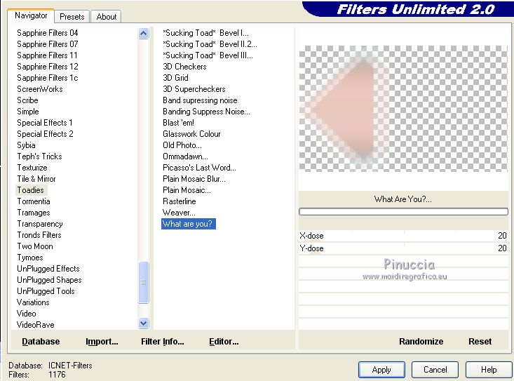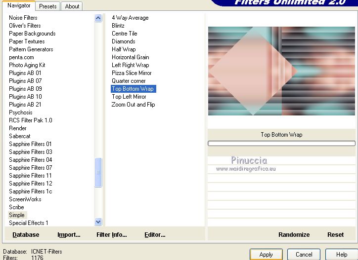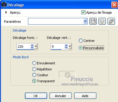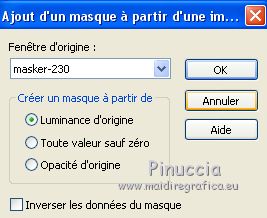 Ce tutoriel a été créé avec CorelX17, mais il peut également être exécuté avec les autres versions. Pour traduire le tutoriel j'ai utilisé CorelX17 pour l'italien et CorelX2 pour le français. Suivant la version utilisée, vous pouvez obtenir des résultats différents. Depuis la version X4, la fonction Image>Miroir a été remplacée par Image>Renverser horizontalement, et Image>Renverser avec Image>Renverser verticalement. Dans les versions X5 et X6, les fonctions ont été améliorées par la mise à disposition du menu Objets. Dans la nouvelle version X7, nous avons à nouveau Miroir/Renverser, mais avec autres différences. Voir plus les détails à ce sujet ici Certaines dénominations ont changées entre les versions de PSP. Les plus frequentes dénominations utilisées: ![]() Traduction en italien ici Vos versions ici Nécessaire pour réaliser ce tutoriel: Matériel qui Pour le tube merci Beatriz (les liens des sites des tubeuses ici) Modules Externes consulter, si nécessaire, ma section de filtre ici Filters Unlimited 2.0 ici Toadies ici Simple - Pizza Slice Mirror, Diamonds, Centre Tile ici Simple - Top Bottom Wrap (bonus) ici Filtres Simple et Toadies peuvent être utilisés seuls ou importés dans Filters Unlimited. voir comment le faire ici). Si un filtre est fourni avec cette icône, ![]() Si vous voulez utiliser vos propres couleurs, n'hésitez pas à changer le mode et l'opacité des calques Placer la sélection dans le dossier Sélections. Ouvrir le masque dans PSP et le minimiser avec le reste du matériel. 1. Placer en avant plan la couleur #69afad, et en arrière plan la couleur #15336d. ![]() 2. Ouvrir une nouvelle image transparente 900 x 550 pixels. ![]() Remplir l'image transparente avec la couleur d'avant plan #69afad.3. Sélectoins>Sélectionner tout. Ouvrir le tube 2951-woman-LB TUBES et Édition>Copier. Minimiser le tube. Revenir sur votre travail et Édition>Coller dans la sélection. Sélections>Désélectionner tout. 4. Effets>Effets d'image>Mosaïque sans jointures, par défaut. ![]() 5. Réglage>Flou>Flou gaussien - rayon 15. ![]() 6. Effets>Effets de textures>Stores. ![]() 7. Effets>Modules Externes>Filters Unlimited 2.0 - Simple - Pizza Slice Mirror. ![]() 8. Effets>Modules Externes>Filters Unlimited 2.0 - Simple -Top Bottom Wrap. ![]() 9. Sélections>Charger/Enregistrer une sélection>Charger à partir du disque. Chercher et charger la sélection les-227-mb.PspSelection. ![]() Sélections>Transformer la sélection en calque. Sélections>Désélectionner tout. 10. Effets>Modules Externes>Filters Unlimited 2.0 - Toadies - What are you. ![]() le résultat de cet effet peut être différent, selon la version d'Unlimited utilisée 11. Effets>Effets de bords>Accentuer davantage. 12. Calques>Dupliquer. Image>Renverser. Image>Miroir. 13. Effets>Modules Externes>Filters Unlimited 2.0 - Simple - Centre Tile. ![]() 14. Activer l'outil Sélection ![]() (peu importe le type de sélection, parce que avec la sélection personnalisée vous obtenez toujours un rectangle), cliquer sur Sélection personnalisée ![]() et setter ces paramètres. ![]() 15. Effets>Modules Externes>Filters Unlimited 2.0 - Simple - Diamonds ![]() Sélections>Désélectionner tout. 16. Ouvrir deco-227-1.png et Édition>Copier. Revenir sur votre travail et Édition>Coller comme nouveau calque. 17. Effets>Effets d'image>Décalage. ![]() 18. Placer le calque en mode Recouvrement. 19. Ouvrir deco-227-2.png et Édition>Copier. Revenir sur votre travail et Édition>Coller comme nouveau calque. 20. Effets>Effets d'image>Décalage. ![]() 21. Calques>Nouveau calque raster. Remplir avec la couleur foncée #15336d.22. Calques>Nouveau calque de masque>A partir d'une image. Ouvrir le menu deroulant sous la fenêtre d'origine et vous verrez la liste des images ouvertes. Sélectionner le masque masker-230. ![]() Calques>Fusionner>Fusionner le groupe. 23. Ouvrir deco-227-3.png et Édition>Copier. Revenir sur votre travail et Édition>Coller comme nouveau calque. 24. Touche K sur le clavier pour activer l'outil Sélecteur ![]() et placer Position horiz.: 397,00 et Position vert.: 936,00. ![]() Touche M pour désélectionner l'outil. 25. Réduire l'opacité de ce calque à 22%. 26. Image>Ajouter des bordures, 2 pixels, symétrique, couleur foncée. Image>Ajouter des bordures, 2 pixels, symétrique, couleur claire. Sélections>Sélectionner tout. Image>Ajouter des bordures, 20 pixels, symétrique, couleur blanche. Effets>Effets 3D>Ombre portée, couleur noire. ![]() Sélections>Désélectionner tout. 27. Image>Ajouter des bordures, 2 pixels, symétrique, couleur foncée. Image>Ajouter des bordures, 2 pixels, symétrique, couleur claire. Sélections>Sélectionner tout. Image>Ajouter des bordures, 40 pixels, symétrique, couleur blanche. Effets>Effets 3D>Ombre portée, couleur noire. ![]() Sélections>Désélectionner tout. 28. Activer à nouveau le tube 2951-woman-LB TUBES.pspimage et Édition>Copier. Revenir sur votre travail et Édition>Coller comme nouveau calque. Touche K pour activer l'outil Sélecteur ![]() et placer Position horiz.: 49,00 et Position vert.: 45,00. ![]() Touche M pour désélectionner l'outil. 29. Effets>Effets 3D>Ombre portée, couleur noire. ![]() 30. Image>Ajouter des bordures, 2 pixels, symétrique, couleur foncée. 31. Signer votre travail et enregistrer en format jpg. Le tube de cette version est de Isa ![]() ![]() Si vous avez des problèmes, ou des doutes, ou vous trouvez un link modifié, ou seulement pour me dire que ce tutoriel vous a plu, vous pouvez m'écrire. 27 Avril 2019 |