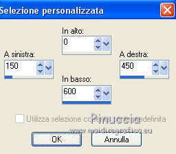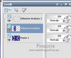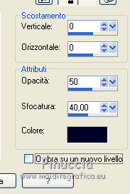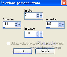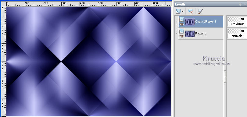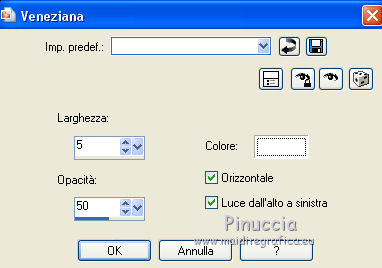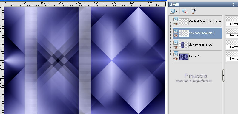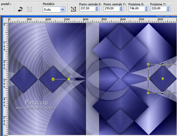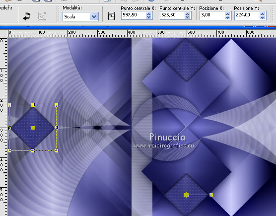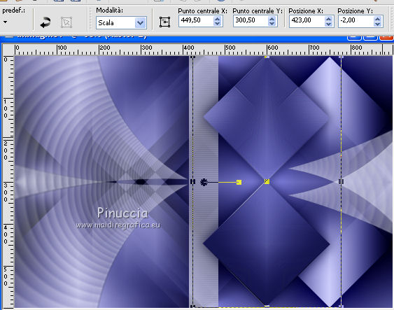 qui puoi trovare qualche risposta ai tuoi dubbi. Se l'argomento che ti interessa non è presente, ti prego di segnalarmelo. Per tradurre il tutorial ho usato Corel X7, ma può essere eseguito con ogni versione di PSP. Dalla versione X4, il comando Immagine>Rifletti è stato sostituito con Immagine>Capovolgi in orizzontale, e il comando Immagine>Capovolgi con Immagine>Capovolgi in verticale. Nelle versioni X5 e X6, le funzioni sono state migliorate rendendo disponibile il menu Oggetti. Con la nuova versione X7, sono tornati Rifletti/Capovolgi, ma con nuove differenze Vedi la scheda sull'argomento qui traduzione in francese qui Le vostre versioni qui Occorrente: Materiale qui Per il tube grazie Kamalini. Filtri in caso di dubbi, ricorda di consultare la mia sezione filtri qui Filters Unlimited 2.0 qui Toadies -What are you qui Simple - Top Left Mirror qui Mehdi - Sorting Tiles qui Flaming Pear - Flexify 2 qui I filtri Toadies e Simple si possono usare da soli o importati in Filters Unlimited (come fare vedi qui) Se un filtro fornito appare con questa icona ![]() se stai usando altri colori, sperimenta le modalità di miscelatura e opacità più adatte ai tuoi colori Nelle ultime versioni di PSP non c'è il gradiente di primo piano/sfondo (Corel_06_029) Puoi usare i gradienti delle versioni precedenti. Trovi qui i gradienti Corel X. 1. Imposta il colore di primo piano con il colore #bebff9, e il colore di sfondo con #01002a. ![]() Passa il colore di primo piano a Gradiente di primo piano/sfondo, stile Lineare. ![]() 2. Apri una nuova immagine trasparente 900 x 600 pixels. ![]() Riempi l'immagine trasparente con il gradiente.3. Effetti>Plugins>Mehdi - Sorting Tiles. ![]() 4. Effetti>Effetti di immagine>Motivo unico, con i settaggi standard. ![]() 5. Livelli>Duplica. Effetti>Plugins>Filters Unlimited 2.0 - Simple - Top Left Mirror. ![]() 6. Cambia la modalità di miscelatura di questo livello in Luce diffusa. ![]() 7. Livelli>Unisci>Unisci giù. 8. Attiva lo strumento Selezione ![]() (non importa il tipo di selezione impostato, perchè con la selezione personalizzata si ottiene sempre un rettangolo) clicca sull'icona Selezione personalizzata ![]() e imposta i seguenti settaggi. ![]() Selezione>Innalza selezione a livello. Selezione>Deseleziona. Effetti>Plugins>Filters Unlimited 2.0 - Toadies - What are you. il risultato di questo effetto può cambiare secondo la versione di Unlimited utilizzata. Con la versione che non ha bisogno di installazione in files formato .8bf (utilizzata per la traduzione italiana): ![]() Con la versione software di Unlimited: (vedi la traduzione francese, dove è stata utilizzata questa versione). ![]() 9. Selezione personalizzata ![]() ![]() Selezione>Innalza selezione a livello. 10. Attiva il livello sottostante - Selezione innalzata ![]() Premi sulla tastiera il tasto CANC ![]() 11. Attiva il livello superiore, selezione innalzata 1. Effetti>Effetti di trama>Veneziana, colore bianco. ![]() Livelli>Duplica. Selezione>Deseleziona. Effetti>Effetti di immagine>Scostamento. ![]() 12. Attiva il livello sottostante Selezione innalzata 1 (il livello con la striscia sinistra) ![]() Effetti>Plugins>Flaming Pear - Flexify 2. ![]() a causa della versione di Unlimited utilizzata per il filtro Toadies (vedi punto 8), il risultato del filtro sarà differente (vedi la traduzione francese). ![]() Livelli>Duplica. Immagine>Capovolgi. Livelli>Unisci>Unisci giù. 13. Attiva il livello superiore. Apri il tube deco-2 e vai a Modifica>Copia. Torna al tuo lavoro e vai a Modifica>Incolla come nuovo livello. Tasto K per attivare lo strumento Puntatore ![]() e imposta Posizione X: 423,00 e Posizione Y: -2,00. ![]() 14. Apri deco-1 e vai a Modifica>Copia. Torna al tuo lavoro e vai a Modifica>Incolla come nuovo livello. Imposta Posizione X: 408,00 e Posizione Y: 169,00. ![]() 15. Apri deco-3 e vai a Modifica>Copia. Torna al tuo lavoro e vai a Modifica>Incolla come nuovo livello. Imposta Posizione X: 518,00 e Posizione Y: -2,00. ![]() Livelli>Duplica. Immagine>Capovolgi. 16. Livelli>Duplica. Imposta Posizione X: 3,00 e Posizione Y: 224,00. ![]() 17. Livelli>Duplica. Imposta Posizione X: 158,00 e Posizione Y: 223,00. ![]() 18. Livelli>Duplica. Imposta Posizione X: 746,00 e Posizione Y: 220,00. ![]() Tasto M per deselezionare lo strumento. 19. Immagine>Aggiungi bordatura, 1 pixel, simmetriche, colore di sfondo. Immagine>Aggiungi bordatura, 3 pixels, simmetriche, colore di primo piano. Immagine>Aggiungi bordatura, 1 pixel, simmetriche, colore di sfondo. Selezione>Seleziona tutto. Immagine>Aggiungi bordatura, 40 pixels, simmetriche, colore bianco #ffffff. Effetti>Effetti 3D>Sfalsa ombra, colore di sfondo. ![]() Selezione>Deseleziona. 20. Apri il tube kamalini-773.png, cancella il watermark e vai a Modifica>Copia. Torna al tuo lavoro e vai a Modifica>Incolla come nuovolivello. Effetti>Effetti 3D>Sfalsa ombra, colore di sfondo. ![]() Sposta il tube in basso.21. Immagine>Aggiungi bordatura, 1 pixel, simmetriche, colore di sfondo. 22. Firma il tuo lavoro su un nuovo livello. Livelli>Unisci>Unisci tutto e salva in formato jpg. Risultato ottenuto usando la versione software di Unlimited ![]() Versione con tube di Karine ![]() ![]() Se hai problemi o dubbi, o trovi un link non funzionante, o anche soltanto per un saluto, scrivimi. 9 Maggio 2019 |