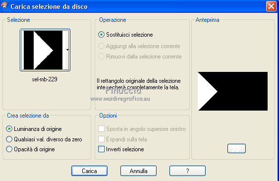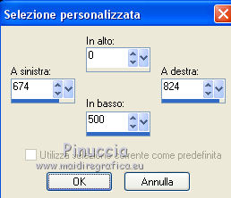 qui puoi trovare qualche risposta ai tuoi dubbi. Se l'argomento che ti interessa non è presente, ti prego di segnalarmelo. Per tradurre il tutorial ho usato Corel X7, ma può essere eseguito con ogni versione di PSP. Dalla versione X4, il comando Immagine>Rifletti è stato sostituito con Immagine>Capovolgi in orizzontale, e il comando Immagine>Capovolgi con Immagine>Capovolgi in verticale. Nelle versioni X5 e X6, le funzioni sono state migliorate rendendo disponibile il menu Oggetti. Con la nuova versione X7, sono tornati Rifletti/Capovolgi, ma con nuove differenze Vedi la scheda sull'argomento qui traduzione in francese qui Le vostre versioni qui Occorrente: Materiale qui Filtri in caso di dubbi, ricorda di consultare la mia sezione filtri qui Filters Unlimited 2.0 qui Toadies - What are you qui Simple - Half Wrap, Pizza Slice Mirror, Zoom out and flip qui Mehdi - Sorting Tiles qui Mehdi - Wavy Lab 1.1 qui Carolaine and Sensibility - csTexture qui Alien Skin Eye Candy 5 Impact - Glass qui Tool - REM Lotus (da importare in Unlimited) - nel materiale I filtri Toadies e Simple si possono usare da soli o importati in Filters Unlimited (come fare vedi qui) Se un filtro fornito appare con questa icona ![]() se stai usando altri colori, sperimenta le modalità di miscelatura e opacità più adatte ai tuoi colori Metti la selezione nella cartella Selezioni. Apri la maschera in PSP e minimizzala con il resto del materiale. 1. Imposta il colore di primo piano con il colore #046470, e il colore di sfondo con #15336d. ![]() Apri una nuova immagine trasparente 900 x 500 pixels. ![]() 2. Effetti>Plugins>Mehdi - Wavy Lab 1.1. Questo filtro crea gradienti con i colori della paletta, il primo è il colore di sfondo, il secondo quello di primo piano. Mantieni gli ultimi due colori creati dal filtro. ![]() 3. Effetti>Plugins>Mehdi - Sorting Tiles. ![]() 4. Effetti>Plugins>Filters Unlimited 2.0 - Simple - Half Wrap ![]() 5. Effetti>Plugins>Filters Unlimited 2.0 - Simple - Pizza Slice Mirror. ![]() 6. Effetti>Plugins>Filters Unlimited 2.0 - Tools - REM LOtus ![]() 7. Effetti>Effetti di bordo>Aumenta. 8. Selezione>Carica/Salva selezione>Carica selezione da disco. Cerca e carica la selezione sel-mb-229. ![]() Selezione>Innalza selezione a livello. Selezione>Deseleziona. 9. Effetti>Plugins>Carolaine and Sensibility - CS-Texture. ![]() 10. Effetti>Plugins>Filters Unlimited 2.0 - Toadies - What are you. ![]() se usi la versione di Unlimited che non si installa, avrai un risultato un po' diverso ![]() 11. Effetti>Effetti 3D>Sfalsa ombra, colore nero. ![]() 12. Apri il tube deco-1-229 e vai a Modifica>Copia. Torna al tuo lavoro e vai a Modifica>Incolla come nuovo livello. 13. Attiva il livello inferiore, raster 1. Attiva lo strumento Selezione ![]() (non importa il tipo di selezione impostato, perchè con la selezione personalizzata si ottiene sempre un rettangolo) clicca sull'icona Selezione personalizzata ![]() e imposta i seguenti settaggi. ![]() Selezione>Innalza selezione a livello. Selezione>Deseleziona. 14. Effetti>Plugins>Filters Unlimited 2.0 - Simple - Zoom out and flip ![]() Regola>Messa a fuoco>Metti a fuoco. 15. Effetti>Effetti 3D>Sfalsa ombra, colore nero. ![]() Effetti>Effetti di immagine>Scostamento. ![]() 16. Sullo stesso livello: Selezione personalizzata ![]() ![]() 17. Effetti>Effetti 3D>Sfalsa ombra, colore nero. ![]() Selezione>Deseleziona. 18. Rimani sempre su questo livello. Selezione personalizzata ![]() ![]() Selezione>Innalza selezione a livello. 19. Effetti>Plugins>Alien Skin Eye Candy 5 Impact - Glass. Seleziona il preset Clear e ok. ![]() Selezione>Deseleziona. 20. Livelli>Duplica. Immagine>Capovolgi. 21. Attiva il livello inferiore, Raster 1. Imposta il colore di sfondo con il colore bianco #ffffff. Livelli>Nuovo livello raster. Riempi il livello con il colore bianco #ffffff.22. Livelli>Nuovo livello maschera>Da immagine. Apri il menu sotto la finestra d'origine e vedrai la lista dei files aperti. Seleziona la maschera masker-229- ![]() Livelli>Unisci>Unisci gruppo. Cambia la modalità di miscelatura di questo livello in Luce diffusa. 23. Effetti>Effetti di immagine>Scostamento. ![]() 24. Apri il tube deco-2-229 e vai a Modifica>Copia. Torna al tuo lavoro e vai a Modifica>Incolla come nuovo livello. Livelli>Disponi>Porta in alto. Tasto K sulla tastiera per attivare lo strumento Puntatore ![]() imposta Posizione X: 19,00 e Posizione Y: 146,00. ![]() 25. Apri il tube deco-3-229 e vai a Modifica>Copia. Torna al tuo lavoro e vai a Modifica>Incolla come nuovo livello. Imposta Posizione X: 537,00 e Posizione Y: 184,00. ![]() Tasto M per deselezionare lo strumento. 26. Apri il tube roos-misted-229 e vai a Modifica>Copia. Torna al tuo lavoro e vai a Modifica>Incolla come nuovo livello. Effetti>Effetti di immagine>Scostamento. ![]() Cambia la modalità di miscelatura di questo livello in Luminanza (esistente) e abbassa l'opacità al 55%. 27. Per i bordi, imposta nuovamente il colore di sfondo con il colore iniziale #15336d. ![]() Immagine>Aggiungi bordatura, 2 pixels, simmetriche, colore di primo piano. Immagine>Aggiungi bordatura, 2 pixels, simmetriche, colore di sfondo. Immagine>Aggiungi bordatura, 2 pixels, simmetriche, colore di primo piano. Selezione>Seleziona tutto. Immagine>Aggiungi bordatura, 20 pixels, simmetriche, colore di sfondo. Effetti>Effetti 3D>Sfalsa ombra, colore nero. ![]() Immagine>Aggiungi bordatura, 4 pixels, simmetriche, colore di primo piano. Selezione>Seleziona tutto. Immagine>Aggiungi bordatura, 40 pixels, simmetriche, colore di sfondo. Effetti>Effetti 3D>Sfalsa ombra, colore nero. ![]() Selezione>Deseleziona. 28. Apri il tube EMA_African Woman IV_03-10-2018.png, cancella il watermark e vai a Modifica>Copia. Torna al tuo lavoro e vai a Modifica>Incolla come nuovo livello. Immagine>Ridimensiona, al 90%, tutti i livelli non selezionato. Effetti>Effetti 3D>Sfalsa ombra, colore nero (o a tua scelta). ![]() Spostalo a tuo piacimento, o vedi il mio esempio.29. Firma il tuo