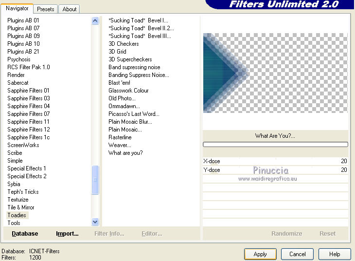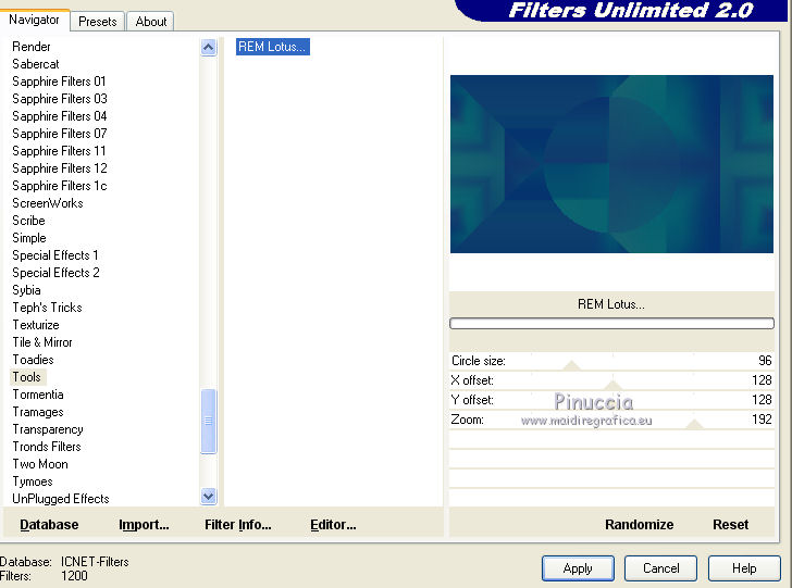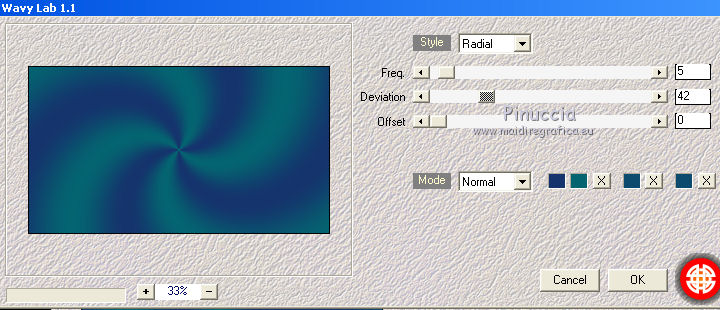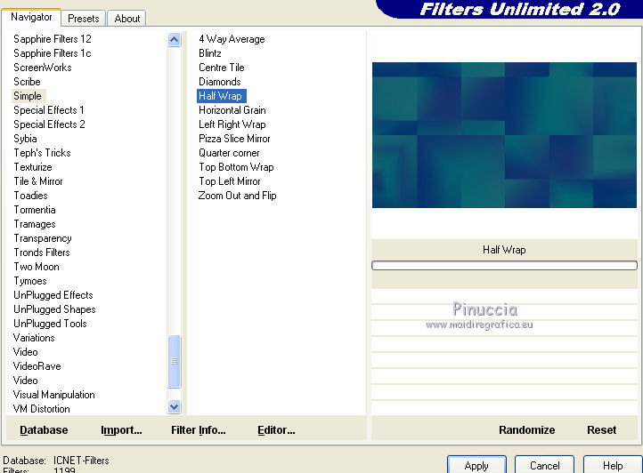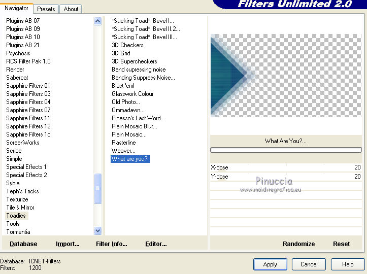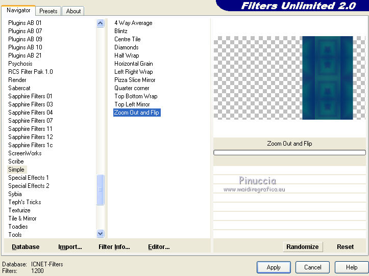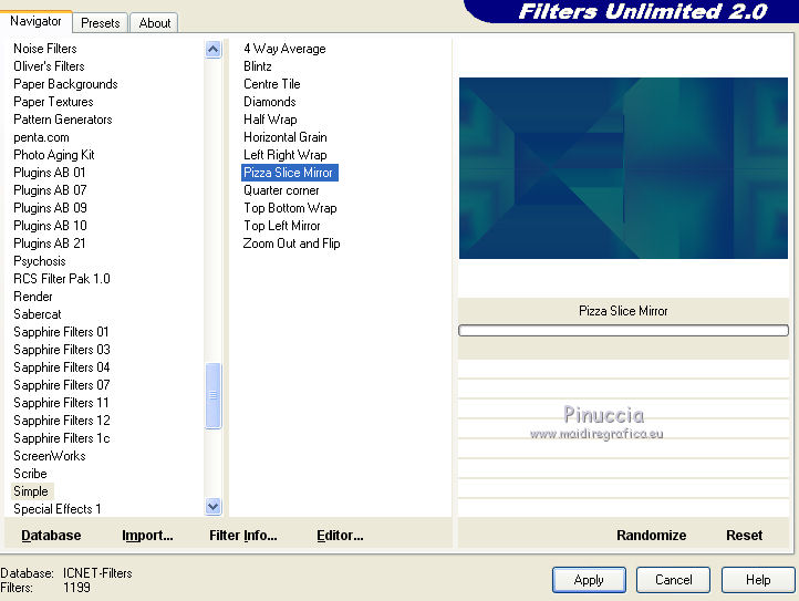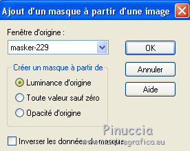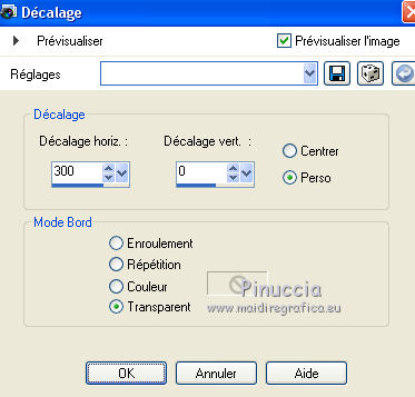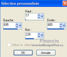Ce tutoriel a été créé avec CorelX17, mais il peut également être exécuté avec les autres versions. Pour traduire le tutoriel j'ai utilisé CorelX17 pour l'italien et CorelX2 pour le français. Suivant la version utilisée, vous pouvez obtenir des résultats différents. Depuis la version X4, la fonction Image>Miroir a été remplacée par Image>Renverser horizontalement, et Image>Renverser avec Image>Renverser verticalement. Dans les versions X5 et X6, les fonctions ont été améliorées par la mise à disposition du menu Objets. Dans la nouvelle version X7, nous avons à nouveau Miroir/Renverser, mais avec autres différences. Voir plus les détails à ce sujet ici Certaines dénominations ont changées entre les versions de PSP. Les plus frequentes dénominations utilisées: ![]() Traduction en italien ici Vos versions ici Nécessaire pour réaliser ce tutoriel: Matériel qui Pour le tube merci Kamalini (les liens des sites des tubeuses ici) Modules Externes consulter, si nécessaire, ma section de filtre ici Filters Unlimited 2.0 ici Toadies - What are you ici Simple - Half Wrap, Pizza Slice Mirror, Zoom out and flip ici Mehdi - Sorting Tiles ici Mehdi - Wavy Lab 1.1 ici Carolaine and Sensibility - csTexture ici Alien Skin Eye Candy 5 Impact - Glass ici Tool - REM Lotus (da importare in Unlimited) - nel materiale Filtres Simple et Toadies peuvent être utilisés seuls ou importés dans Filters Unlimited. voir comment le faire ici). Si un filtre est fourni avec cette icône, ![]() Si vous voulez utiliser vos propres couleurs, n'hésitez pas à changer le mode et l'opacité des calques Placer la sélection dans le dossier Sélection. Ouvrir le masque dans PSP et le minimiser avec le reste du matériel. 1. Placer en avant plan la couleur #046470, et en arrière plan la couleur #15336d. ![]() Ouvrir une nouvelle image transparente 900 x 500 pixels. ![]() 2. Effets>Modules Externes>Mehdi - Wavy Lab 1.1. Ce filtre crée des dégradés avec les couleurs de votre palette: la première est la couleur d'arrière plan, la deuxième est la couleur d'avant plan. Garder les autres deux couleurs créées par le filtre ![]() 3. Effets>Modules Externes>Mehdi - Sorting Tiles. ![]() 4. Effets>Modules Externes>Filters Unlimited 2.0 - Simple - Half Wrap ![]() 5. Effets>Modules Externes>Filters Unlimited 2.0 - Simple - Pizza Slice Mirror. ![]() 6. Effets>Modules Externes>Filters Unlimited 2.0 - Tools - REM LOtus ![]() 7. Effets>Effets de bords>Accentuer. 8. Sélections>Charger/Enregistrer une sélection>Charger à partir du disque. Chercher et charger la sélection sel-mb-229. ![]() Sélections>Transformer la sélection en calque. Sélections>Désélectionner tout. 9. Effets>Modules Externes>Carolaine and Sensibility - CS-Texture. ![]() 10. Effets>Modules Externes>Filters Unlimited 2.0 - Toadies - What are you. ![]() Si vous utilisez la version de Unlimited qui n'a pas besoin d'installation, le résultat sera un peu différent ![]() 11. Effets>Effets 3D>Ombre portée, couleur noire. ![]() 12. Ouvrir le tube deco-1-229 - Édition>Copier. Revenir sur votre travail et Édition>Coller comme nouveau calque. 13. Vous positionner sur le calque du bas de la pile, Raster 1. Activer l'outil Sélection ![]() (peu importe le type de sélection, parce que avec la sélection personnalisée vous obtenez toujours un rectangle), cliquer sur Sélection personnalisée ![]() et setter ces paramètres. ![]() Sélections>Transformer la sélection en calque. Sélections>Désélectionner tout. 14. Effets>Modules Externes>Filters Unlimited 2.0 - Simple - Zoom out and flip ![]() Réglage>Netteté>Netteté. 15. Effets>Effets 3D>Ombre portée, couleur noire. ![]() Effets>Effets d'image>Décalage. ![]() 16. Sur ce calque. Sélection personnalisée ![]() ![]() 17. Effets>Effets 3D>Ombre portée, couleur noire. ![]() Sélections>Désélectionner tout. 18. Rester positionné sur ce calque. Sélection personnalisée ![]() ![]() Sélections>Transformer la sélection en calque. 19. Effets>Modules Externes>Alien Skin Eye Candy 5 Impact - Glass. Sélectionner le preset Clear et ok. ![]() Sélections>Désélectionner tout. 20. Calques>Dupliquer. Image>Renverser. 21. Vous positionner sur le calque du bas de la pile, Raster 1. Placer en arrière plan la couleur blanche #ffffff. Calques>Nouveau calque raster. Remplir le calque avec la couleur blanche #ffffff.22. Calques>Nouveau calque de masque>A partir d'une image. Ouvrir le menu deroulant sous la fenêtre d'origine et vous verrez la liste des images ouvertes. Sélectionner le masque masker-229. ![]() Calques>Fusionner>Fusionner le groupe. Placer le calque en mode Lumière douce. 23. Effets>Effets d'image>Décalage. ![]() 24. Ouvrir le tube deco-2-229 - Édition>Copier. Revenir sur votre travail et Édition>Coller comme nouveau calque. Calques>Agencer>Placer en haut de la pile. Touche K sur le clavier pour activer l'outil Sélecteur ![]() et placer Position horiz.: 19,00 et Position vert.: 146,00. ![]() 25. Ouvrir le tube deco-3-229 - Édition>Copier. Revenir sur votre travail et Édition>Coller comme nouveau calque. placer Position horiz.: 537,00 et Posizione Y: 184,00. ![]() Touche M pour désélectionner l'outil. 26. Ouvrir le tube roos-misted-229 - Édition>Copier. Revenir sur votre travail et Édition>Coller comme nouveau calque. Effets>Effets d'image>Décalage. ![]() Placer le calque en mode Luminance (héritée) et réduire l'opacité à 55%. 27. Pour les bords, placer à nouveau en arrière plan la couleur du début #15336d. ![]() Image>Ajouter des bordures, 2 pixels, symétrique, couleur d'avant plan. Image>Ajouter des bordures, 2 pixels, symétrique, couleur d'arrière plan. Image>Ajouter des bordures, 2 pixels, symétrique, couleur d'avant plan. Sélections>Sélectionner tout. Image>Ajouter des bordures, 20 pixels, symétrique, couleur d'arrière plan. Effets>Effets 3D>Ombre portée, couleur noire. ![]() Image>Ajouter des bordures, 4 pixels, symétrique, couleur d'avant plan