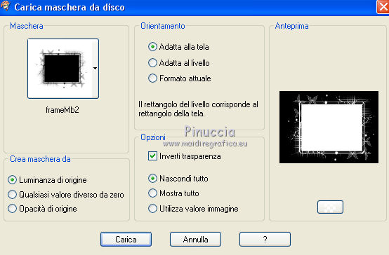 qui puoi trovare qualche risposta ai tuoi dubbi. Se l'argomento che ti interessa non è presente, ti prego di segnalarmelo. Per tradurre il tutorial ho usato Corel X , ma può essere eseguito con ogni versione di PSP. Dalla versione X4, il comando Immagine>Rifletti è stato sostituito con Immagine>Capovolgi in orizzontale, e il comando Immagine>Capovolgi con Immagine>Capovolgi in verticale. Nelle versioni X5 e X6, le funzioni sono state migliorate rendendo disponibile il menu Oggetti. Con la nuova versione X7, sono tornati Rifletti/Capovolgi, ma con nuove differenze Vedi la scheda sull'argomento qui traduzione in francese qui Le vostre versioni qui![]() Occorrente: Materiale qui Per il tube grazie Mtm Brigitte. (in questa pagina trovi i links ai siti dei creatori di tubes) Filtri: in caso di dubbi, ricorda di consultare la mia sezione filtri qui FM Tile Tools - Blend Emboss qui ![]() se stai usando altri colori, sperimenta le modalità di miscelatura e opacità più adatte ai tuoi colori Metti la maschera nella cartella Maschere. 1. Apri una nuova immagine 600 x 440 pixels, sfondo bianco #ffffff. ![]() 2. Imposta il colore di primo piano con il colore nero. Livelli>Nuovo livello raster. Riempi il livello con il colore nero.3. Livelli>Carica/Salva maschera>Carica maschera da disco. Cerca e carica la maschera frameMb2. ![]() Livelli>Unisci>Unisci gruppo. 4. Sposta la maschera al centro dell'immagine.Se stai usando una versione recente di PSP: Oggetti>Allinea>Centra nella tela. Se stai usando una versione precedente che non rende disponibile il menu Oggetti, attiva lo strumento Puntatore ![]() e imposta Posizione X: 36,00 e Posizione Y: 8,00 ![]() 5. Apri il tube BlokjesrandMb e vai a Modifica>Copia. Torna al tuo lavoro e vai a Modifica>Incolla come nuovo livello. Sposta il tube sotto la maschera.![]() 6. Apri il tube Mtm_Lady_ 195-melancholy-small e vai a Modifica>Copia. Torna al tuo lavoro e vai a Modifica>Incolla come nuovo livello. Immagine>Rifletti. Immagine>Ridimensiona, 2 volte al 90%, tutti i livelli non selezionato. Sposta il tube in basso a sinistra.9. Apri il tube della rosa e vai a Modifica>Copia. Torna al tuo lavoro e vai a Modifica>Incolla come nuovo livello. Immagine>Ridimensiona, 2 volte al 90%, tutti i livelli non selezionato. (ridimensionare le immagini a piccole tappe serve per mantenere la qualità del tube) Cambia la modalità di miscelatura di questo livello in Luminanza (esistente) e abbassa l'opacità al 28%. 10. Effetti>Plugins>FM Tile Tools - Blend Emboss, con i settaggi standard - 2 volte. ![]() 11. Chiudi il livello di sfondo. Livelli>Unisci>Unisci visibile. Controlla che la cornice sia tuo gradimento. Riapri il livello di sfondo. Livelli>Unisci>Unisci tutto. 12. Immagine>Aggiungi bordatura, 1 pixel, simmetriche, colore nero. Immagine>Aggiungi bordatura, 10 pixels, simmetriche, colore bianco. 13. Firma il tuo lavoro su un nuovo livello. Livelli>Unisci>Unisci tutto e salva in formato jpg. Versione con tubes di EFairyTubes e Dragoblu ![]() ![]() Se hai problemi o dubbi, o trovi un link non funzionante, o anche soltanto per un saluto, scrivimi. 25 Febbraio 2021 |
