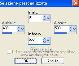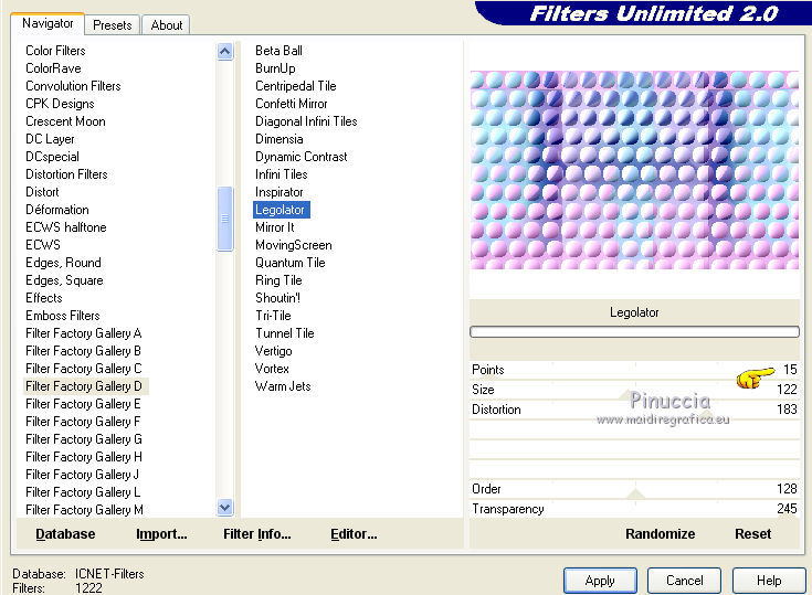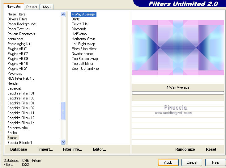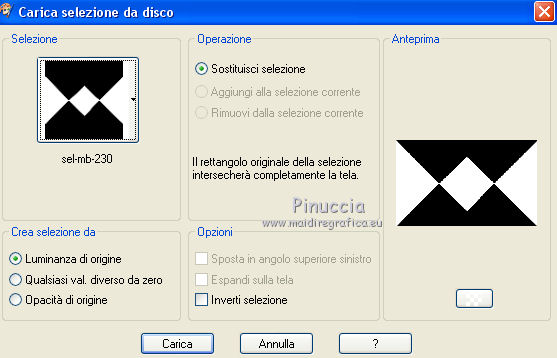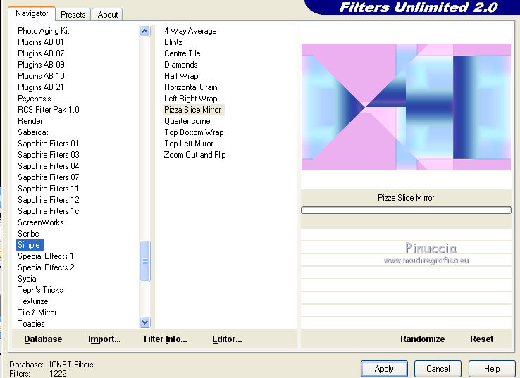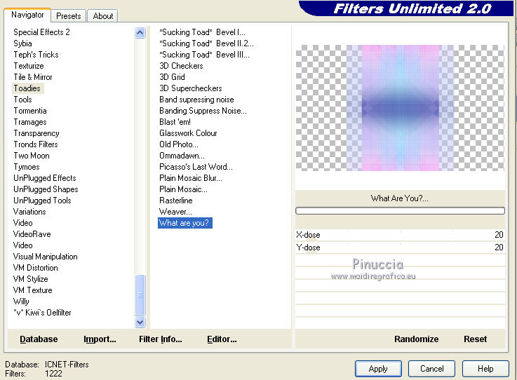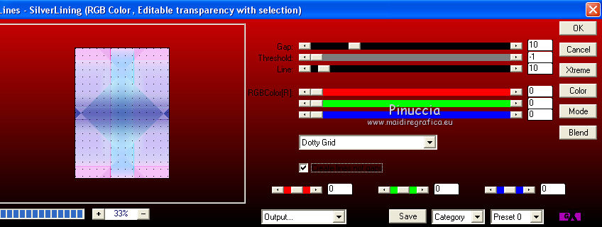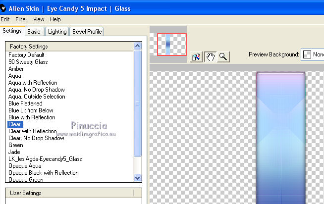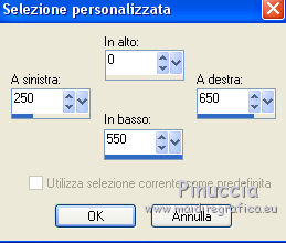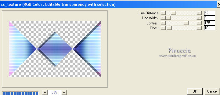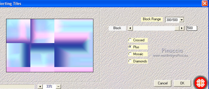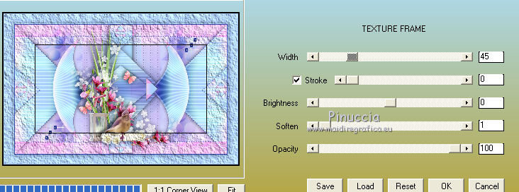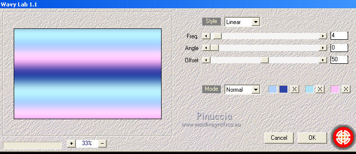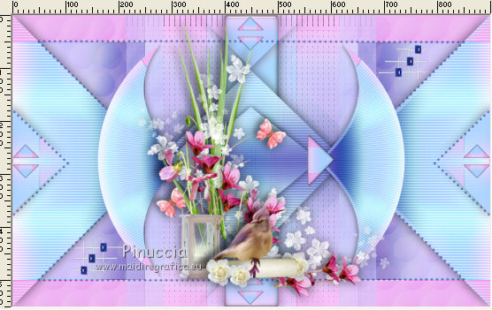qui puoi trovare qualche risposta ai tuoi dubbi. Se l'argomento che ti interessa non è presente, ti prego di segnalarmelo. Per tradurre il tutorial ho usato Corel X7, ma può essere eseguito con ogni versione di PSP. Dalla versione X4, il comando Immagine>Rifletti è stato sostituito con Immagine>Capovolgi in orizzontale, e il comando Immagine>Capovolgi con Immagine>Capovolgi in verticale. Nelle versioni X5 e X6, le funzioni sono state migliorate rendendo disponibile il menu Oggetti. Con la nuova versione X7, sono tornati Rifletti/Capovolgi, ma con nuove differenze Vedi la scheda sull'argomento qui traduzione in francese qui Le vostre versioni qui Occorrente: Materiale qui Filtri in caso di dubbi, ricorda di consultare la mia sezione filtri qui Filters Unlimited 2.0 qui Toadies - What are you qui Simple - Pizza Slice Mirror, 4Way Average qui Mehdi - Sorting Tiles qui Mehdi - Wavy Lab 1.1 qui Carolaine and Sensibility - csTexture qui Alien Skin Eye Candy 5 Impact - Glass qui AP 01 Innovations - Lines SilverLining qui Flaming Pear - Flexify 2 qui Filter Factory Gallery D - Legolator qui AAA Frames - Texture Frame qui I filtri Factory Gallery, Toadies e Simple si possono usare da soli o importati in Filters Unlimited (come fare vedi qui) Se un filtro fornito appare con questa icona ![]() se stai usando altri colori, sperimenta le modalità di miscelatura e opacità più adatte ai tuoi colori Metti la selezione nella cartella Selezioni. 1. Imposta il colore di primo piano con il colore scuro #2f43a6, e il colore di sfondo con il colore chiaro #afd1ff. ![]() Apri una nuova immagine trasparente 900 x 550 pixels. ![]() 2. Effetti>Plugins>Mehdi - Wavy Lab 1.1. Questo filtro crea gradienti con i colori della paletta, il primo è il colore di sfondo, il secondo quello di primo piano. Cambia gli ultimi due colori creati dal filtro: il terzo con #aee3f5 e il quarto con #fdc0fb ![]() 3. Effetti>Plugins>Mehdi - Sorting Tiles. ![]() 4. Effetti>Effetti di bordo>Aumenta di più. 5. Effetti>Plugins>Filters Unlimited 2.0 - Simple - Pizza Slice Mirror ![]() 6. Effetti>Plugins>Filters Unlimited 2.0 - Simple - 4Way Average ![]() 7. Attiva lo strumento Selezione ![]() (non importa il tipo di selezione impostato, perchè con la selezione personalizzata si ottiene sempre un rettangolo) clicca sull'icona Selezione personalizzata ![]() e imposta i seguenti settaggi. ![]() Selezione>Innalza selezione a livello. Selezione>Deseleziona. 8. Effetti>Plugins>Alien Skin Eye Candy 5 Impact - Glass. Seleziona il preset Clear e ok. ![]() 9. Effetti>Effetti 3D>Sfalsa ombra, colore nero. ![]() 10. Attiva il livello inferiore, raster 1. Selezione personalizzata ![]() ![]() Selezione>Innalza selezione a livello. 11. Effetti>Plugins>AP 01 Innovations - Lines SilverLining. ![]() Selezione>Deseleziona. 12. Effetti>Plugins>Filters Unlimited 2.0 - Toadies - what are you. ![]() 13. Attiva nuovamente il livello inferiore, Raster 1. Selezione>Carica/Salva selezione>Carica selezione da disco. Cerca e carica la selezione sel-mb-230. ![]() Selezione>Innalza selezione a livello. 14. Effetti>Plugins>Carolaine and Sensibility - CS-Texture. ![]() Selezione>Deseleziona. 15. Effetti>Effetti 3D>Sfalsa ombra, con i settaggi precedenti. ![]() 16. Livelli>Disponi>Porta in alto. 17. Livelli>Duplica. Effetti>Plugins>Flaming Pear - Flexify ![]() 18. Immagine>Ridimensiona, all'80%, tutti i livelli non selezionato. 19. Attiva ancora il livello inferiore, Raster 1. Livelli>Duplica. Effetti>Plugins>Filters Unlimited 2.0 - Filter Factory Gallery D, Legolator. ![]() 20. Cambia la modalità di miscelatura di questo livello in Luce diffusa, e abbassa l'opacità al 35%. 21. Apri deco230-2.png e vai a Modifica>Copia. Torna al tuo lavoro e vai a Modifica>Incolla come nuovo livello. Livelli>Disponi>Porta in alto. 22. Apri deco230-1 e vai a Modifica>Copia. Torna al tuo lavoro e vai a Modifica>Incolla come nuovo livello. 23. Apri 23.png e vai a Modifica>Copia. Torna al tuo lavoro e vai a Modifica>Incolla come nuovo livello. Immagine>Ridimensiona, al 90%, tutti i livelli non selezionato. Sposta il tube un po' più a destra.![]() 24. Effetti>Effetti 3D>Sfalsa ombra, con i settaggi precedenti. ![]() 25. Immagine>Aggiungi bordatura, 2 pixels, simmetriche, colore scuro di primo piano. Immagine>Aggiungi bordatura, 2 pixels, simmetriche, colore chiaro di sfondo. Selezione>Seleziona tutto. Immagine>Aggiungi bordatura, 45 pixels, simmetriche, colore chiaro di sfondo. Effetti>Effetti 3D>Sfalsa ombra, con i settaggi precedenti. ![]() Selezione>Deseleziona. 26. Effetti>Plugins>AAA Frames - Texture Frame. ![]() 27. Immagine>Aggiungi bordatura, 2 pixels, simmetriche, colore scuro di primo piano. 28. Firma il tuo lavoro su un nuovo livello. Livelli>Unisci>Unisci tutto e salva in formato jpg. ![]() Se hai problemi o dubbi, o trovi un link non funzionante, o anche soltanto per un saluto, scrivimi. 31 Luglio 2019 |