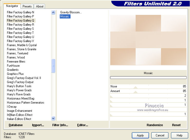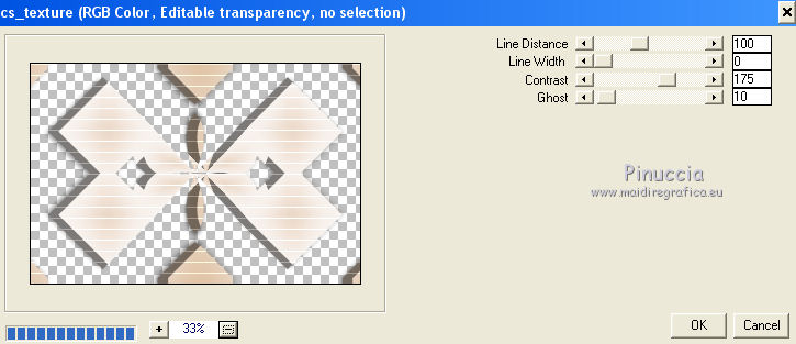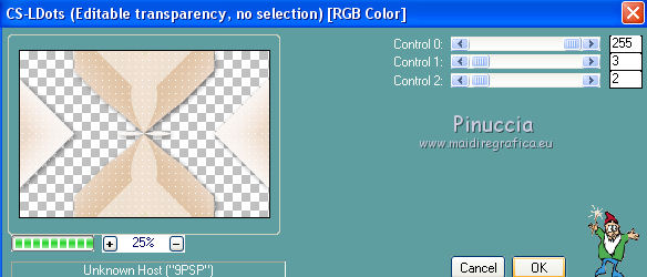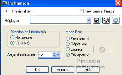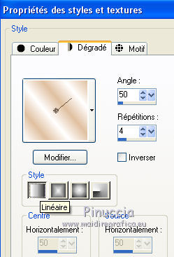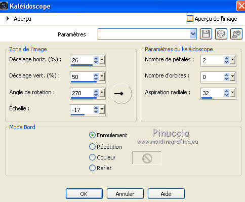 Ce tutoriel a été créé avec CorelX17, mais il peut également être exécuté avec les autres versions. Pour traduire le tutoriel j'ai utilisé CorelX17 pour l'italien et CorelX2 pour le français. Suivant la version utilisée, vous pouvez obtenir des résultats différents. Depuis la version X4, la fonction Image>Miroir a été remplacée par Image>Renverser horizontalement, et Image>Renverser avec Image>Renverser verticalement. Dans les versions X5 et X6, les fonctions ont été améliorées par la mise à disposition du menu Objets. Dans la nouvelle version X7, nous avons à nouveau Miroir/Renverser, mais avec autres différences. Voir plus les détails à ce sujet ici Certaines dénominations ont changées entre les versions de PSP. Les plus frequentes dénominations utilisées: ![]() Traduction en italien ici Vos versions iciNécessaire pour réaliser ce tutoriel: Matériel qui (les liens des sites des tubeuses ici) Modules Externes consulter, si nécessaire, ma section de filtre ici Filters Unlimited 2.0 ici Carolaine and Sensibility - CS-LDots, CS-Texture ici Filter Factory Gallery Q - Mosaic ici Filtres Factory Gallery peuvent être utilisés seuls ou importés dans Filters Unlimited. voir comment le faire ici). Si un filtre est fourni avec cette icône, ![]() Si vous voulez utiliser vos propres couleurs, n'hésitez pas à changer le mode et l'opacité des calques Dans les plus récentes versions de PSP, vous ne trouvez pas le dégradé d'avant plan/arrière plan ou Corel_06_029. Vous pouvez utiliser le dégradé des versions antérieures. Ici le dossier Dégradés de CorelX. 1. Placer en avant plan la couleur #ffffff, et en arrière plan la couleur #e0c0a0. ![]() Préparer en avant plan un dégradé de premier plan/arrière plan, style Linéaire. ![]() 2. Ouvrir une nouvelle image transparente 900 x 600 pixels. ![]() Remplir l'image transparente du dégradé.3. Calques>Dupliquer. Image>Miroir. Réduire l'opacité de ce calque à 50%. Calques>Fusionner>Fusionner le calque de dessous. 4. Effets>Effets de bords>Accentuer davantage. 5. Calques>Dupliquer. 6. Effets>Modules Externes>Filters Unlimited 2.0 - Filter Factory Gallery Q - Mosaic. ![]() 7. Effets>Effets géométriques>Inclinaison. ![]() 8. Effets>Effets de réflexion>Kaléïdoscope. ![]() 9. Effets>Effets 3D>Ombre portée, couleur noire. ![]() 10. Calques>Dupliquer. Répéter Effets>Effets de réflexion>Kaléïdoscope, comme précédemment. ![]() 11. Réduire l'opacité de ce calque à 50%. 12. Effets>Modules Externes>Carolaine and Sensibility - CS-Texture. ![]() 13. Vous positionner sur le calque Copie de Raster 1. Effets>Modules Externes>Carolaine and Sensibility - CS-LDots. ![]() 14. Vous positionner sur le calque du haut de la pile. Ouvrir element_for_sale.png et Édition>Copier. Revenir sur votre travail et Édition>Coller comme nouveau calque. Calques>Dupliquer. Calques>Fusionner>Fusionner le calque de dessous. 15. Ouvrir le tube Lisa Audit-Painting-22-B.png et Édition>Copier. Revenir sur votre travail et Édition>Coller comme nouveau calque. Objets>Aligner>Bas, ou activer l'outil Sélecteur ![]() et placer Position vert.: -62,00 ![]() ![]() 16. Effets>Effets 3D>Ombre portée, couleur noire. ![]() 17. Ouvrir deco-236.png et Édition>Copier. Revenir sur votre travail et Édition>Coller comme nouveau calque. 18. Image>Ajouter des bordures, 2 pixels, symétrique, couleur foncée d'arrière plan. Image>Ajouter des bordures, 4 pixels, symétrique, couleur blanche #ffffff. Image>Ajouter des bordures, 2 pixels, symétrique, couleur foncée d'arrière plan. Sélections>Sélectionner tout. Image>Ajouter des bordures, 45 pixels, symétrique, couleur blanche #ffffff. 19. Effets>Effets 3D>Ombre portée, couleur d'arrière plan. ![]() Sélections>Désélectionner tout. 20. Image>Ajouter des bordures, 1 pixel, symétrique, couleur foncée d'arrière plan. Signer votre travail sur un nouveau calque. Calques>Fusionner>Tous et enregistrer en jpg. Version avec tube non signé ![]() ![]() Si vous avez des problèmes, ou des doutes, ou vous trouvez un link modifié, ou seulement pour me dire que ce tutoriel vous a plu, vous pouvez m'écrire. 22 Avril 2020 |