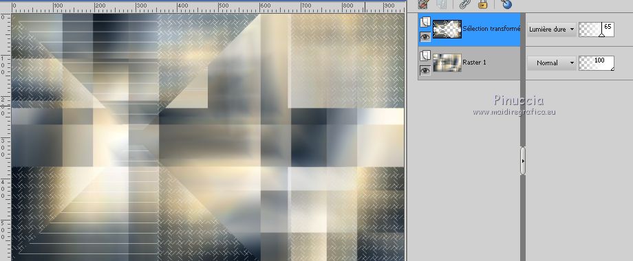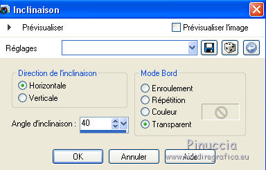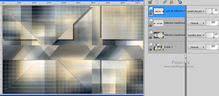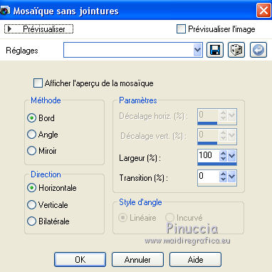 Ce tutoriel a été créé avec CorelX17, mais il peut également être exécuté avec les autres versions. Pour traduire le tutoriel j'ai utilisé CorelX17 pour l'italien et CorelX2 pour le français. Suivant la version utilisée, vous pouvez obtenir des résultats différents. Depuis la version X4, la fonction Image>Miroir a été remplacée par Image>Renverser horizontalement, et Image>Renverser avec Image>Renverser verticalement. Dans les versions X5 et X6, les fonctions ont été améliorées par la mise à disposition du menu Objets. Dans la nouvelle version X7, nous avons à nouveau Miroir/Renverser, mais avec autres différences. Voir plus les détails à ce sujet ici Certaines dénominations ont changées entre les versions de PSP. Les plus frequentes dénominations utilisées: ![]() Traduction en italien ici Vos versions iciNécessaire pour réaliser ce tutoriel: Matériel qui Pour le tube merci Kamalini. (les liens des sites des tubeuses ici) Modules Externes consulter, si nécessaire, ma section de filtre ici Filters Unlimited 2.0 ici Mehdi - Wavy Lab 1.1. ici Mehdi - Sorting Tiles ici AP 01 [Innovations] - Lines SilverLining ici Toadies - What are you ici Simple - Pizza Slice Mirror ici Filtres Toadies et Simple peuvent être utilisés seuls ou importés dans Filters Unlimited. voir comment le faire ici). Si un filtre est fourni avec cette icône, ![]() Si vous voulez utiliser vos propres couleurs, n'hésitez pas à changer le mode et l'opacité des calques 1. Placer en avant plan la couleur #f8dcad, et en arrière plan la couleur #202f3f. ![]() 2. Ouvrir une nouvelle image transparente 950 x 600 pixels. ![]() 3. Effets>Modules Externes>Mehdi - Wavy Lab 1.1. Ce filtre crée des dégradés avec les couleurs de votre palette: la première est la couleur d'arrière plan, la deuxième est la couleur d'avant plan. Des autres deux couleurs créées par le filtre, changer la dernière avec la couleur blanche #ffffff ![]() 4. Effets>Effets de bords>Accentuer davantage. 5. Effets>Modules Externes>Mehdi - Sorting Tiles. ![]() 6. Effets>Modules Externes>Filters Unlimited 2.0 - Toadies - What are you ![]() 7. Activer l'outil Sélection ![]() (peu importe le type de sélection, parce que avec la sélection personnalisée vous obtenez toujours un rectangle), cliquer sur Sélection personnalisée ![]() et setter ces paramètres. ![]() Sélections>Transformer la sélection en calque. 8. Effets>Modules Externes>AP 01 [Innovations] - Lines SilverLining. ![]() Sélections>Désélectionner tout. 9. Effets>Modules Externes>Filters Unlimited 2.0 - Simple - Pizza Slice Mirror. ![]() 10. Placer le calque en mode Lumière dure et réduire l'opacité à 65%. ![]() 11. Effets>Effets 3D>Ombre portée, couleur noire. (régler la couleur de l'ombre à votre goût) ![]() Répéter Ombre portée, vertical et horizontal -10. ![]() 12. Vous positionner sur le calque du bas de la pile (Raster 1) Sélection personnalisée ![]() ![]() Sélections>Transformer la sélection en calque. Calques>Agencer>Placer en haut de la pile. Sélections>Désélectionner tout. 13. Effets>Effets géométriques>Inclinaison. ![]() 14. Calques>Dupliquer. Image>Miroir. Placer le calque en mode Assombrir davantage et réduire l'opacité à 50%. ![]() 15. Calques>Fusionner>Fusionner le calque de dessous. 16. Effets>Effets d'image>Mosaïque sans jointures. ![]() 17. Effets>Effets 3D>Ombre portée, couleur noire. ![]() 18. Ouvrir deco-1-241 - Édition>Copier. Revenir sur votre travail et Édition>Coller comme nouveau calque. Touche K sur le clavier pour activer l'outil Sélecteur ![]() et placer Position horiz.: 583,00 et Position vert.: -4,00. ![]() 19. Ouvrir deco-2-241 - Édition>Copier. Revenir sur votre travail et Édition>Coller comme nouveau calque. Placer Position horiz.: 19,00 et Position vert.: 87,00. ![]() 20. Ouvrir Bloem 1 - Édition>Copier. Revenir sur votre travail et Édition>Coller comme nouveau calque. Placer Position horiz.: 340,00 et Position vert.: 255,00. ![]() 21. Ouvrir Bloem 2 - Édition>Copier. Revenir sur votre travail et Édition>Coller comme nouveau calque. Placer Position horiz.: 75,00 et Position vert.: 132,00. ![]() 22. Ouvrir kamalini-881.png - Édition>Copier. Revenir sur votre travail et Édition>Coller comme nouveau calque. Image>Redimensionner, à 75%, redimensionner tous les calques décoché. Placer Position horiz.: 624,00 et Position vert.: 4,00. ![]() Touche M pour désélectionner l'outil. 23. Effets>Effets 3D>Ombre portée, couleur noire. ![]() 24. Image>Ajouter des bordures, 2 pixels, symétrique, couleur d'arrière plan. Image>Ajouter des bordures, 4 pixels, symétrique, couleur d'avant plan. Sélections>Sélectionner tout. Édition>Copier. Image>Ajouter des bordures, 50 pixels, symétrique, couleur d'arrière plan. Sélections>Inverser. Édition>Coller dans la sélection. Réglage>Flou>Flou gaussien - rayon 30. ![]() Sélections>Inverser. Effets>Effets 3D>Ombre portée, couleur noire. ![]() Sélections>Désélectionner tout. Image>Ajouter des bordures, 1 pixel, symétrique, couleur d'arrière plan. 25. Signer votre travail sur un nouveau calque. Calques>Fusionner>Tous et enregistrer en jpg. Version avec tube de Beatriz ![]() ![]() Si vous avez des problèmes, ou des doutes, ou vous trouvez un link modifié, ou seulement pour me dire que ce tutoriel vous a plu, vous pouvez m'écrire. 9 Octobre 2020 |