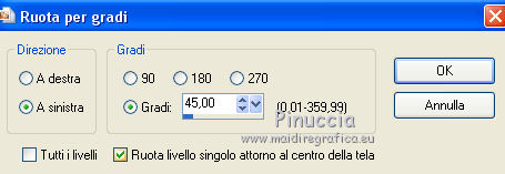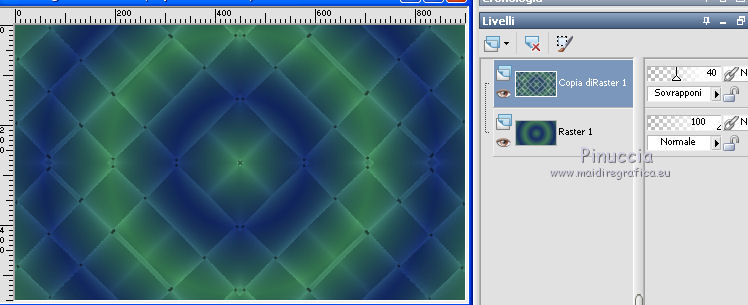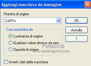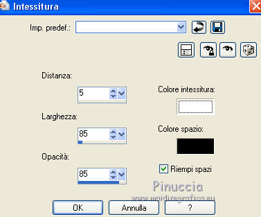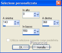 qui puoi trovare qualche risposta ai tuoi dubbi. Se l'argomento che ti interessa non è presente, ti prego di segnalarmelo. Per tradurre il tutorial ho usato Corel X7, ma può essere eseguito con ogni versione di PSP. Dalla versione X4, il comando Immagine>Rifletti è stato sostituito con Immagine>Capovolgi in orizzontale, e il comando Immagine>Capovolgi con Immagine>Capovolgi in verticale. Nelle versioni X5 e X6, le funzioni sono state migliorate rendendo disponibile il menu Oggetti. Con la nuova versione X7, sono tornati Rifletti/Capovolgi, ma con nuove differenze Vedi la scheda sull'argomento qui traduzione in francese qui Le vostre versioni quiOccorrente: Materiale qui Per il tube grazie Kamalini. (in questa pagina trovi i links ai siti dei creatori di tubes) Filtri in caso di dubbi, ricorda di consultare la mia sezione filtri qui Filters Unlimited 2.0 qui &<Bkg Kaleidoscope> - Kaleidoscope 2 (da importare in Unlimited) qui ![]() se stai usando altri colori, sperimenta le modalità di miscelatura e opacità più adatte ai tuoi colori Nelle ultime versioni di PSP non c'è il gradiente di primo piano/sfondo (Corel_06_029) Puoi usare i gradienti delle versioni precedenti. Trovi qui i gradienti Corel X. Apri la maschera in PSP e minimizzala con il resto del materiale. 1. Imposta il colore di primo piano con #427c57, e il colore di sfondo con #192e65. ![]() Passa il colore di primo piano a Gradiente di primo piano/sfondo, stile Spazzo di luce. ![]() Apri una nuova immagine trasparente 900 x 550 pixels. ![]() Riempi l'immagine trasparente con il gradiente.2. Livelli>Duplica. Regola>Sfocatura>Sfocatura radiale. ![]() 3. Effetti>Effetti di trama>Intessitura colore intessitura: #ffffff - colore spazio: #000000. ![]() 4. Effetti>Plugins>Filters Unlimited 2.0 - &<Bkg Kaleidoscope> - Kaleidoscope 2. ![]() 5. Cambia la modalità di miscelatura di questo livello in Sovrapponi, e abbassa l'opacità al 40%. ![]() Regola>Messa a fuoco>Metti a fuoco. 6. Attiva il livello inferiore, Raster 1. Attiva lo strumento Selezione ![]() (non importa il tipo di selezione impostato, perchè con la selezione personalizzata si ottiene sempre un rettangolo) clicca sull'icona Selezione personalizzata ![]() e imposta i seguenti settaggi. ![]() 7. Selezione>Innalza selezione a livello. Livelli>Disponi>Porta in alto. 8. Effetti>Effetti di trama>Veneziana - colore nero. ![]() Selezione>Deseleziona. 9. Imposta il colore di primo piano con il colore bianco #ffffff. Livelli>Nuovo livello raster. Riempi il livello con il colore bianco.10. Livelli>Nuovo livello maschera>Da immagine. Apri il menu sotto la finestra di origine e vedrai la lista dei files aperti. Seleziona la maschera CxDFw. ![]() Livelli>Unisci>Unisci gruppo. 11. Cambia la modalità di miscelatura di questo livello in Luce diffusa. 12. Livelli>Duplica. Immagine>Ridimensiona, all'80%, tutti i livelli non selezionato. 13. Immagine>Ruota per gradi - 45 gradi a sinistra. ![]() 14. Effetti>Effetti di immagine>Motivo unico. ![]() 15. Apri il tube blooming_yucca_by_lilipilyspirit-d4zfzhm.png e vai a Modifica>Copia. Torna al tuo lavoro e vai a Modifica>Incolla come nuovo livello. Livelli>Duplica. Livelli>Unisci>Unisci giù. 16. Immagine>Ridimensiona, 2 volte all'80%, tutti i livelli non selezionato. Effetti>Effetti di immagine>Scostamento. ![]() 17. Apri il tube tekst e vai a Modifica>Copia. Torna al tuo lavoro e vai a Modifica>Incolla come nuovo livello. Effetti>Effetti di immagine>Scostamento. ![]() 18. Immagine>Aggiungi bordatura, 1 pixel, simmetriche, colore di primo piano #427c57. Immagine>Aggiungi bordatura, 3 pixels, simmetriche, colore di sfondo #192e65. Immagine>Aggiungi bordatura, 1 pixel, simmetriche, colore di primo piano #427c57. 19. Selezione>Seleziona tutto. Immagine>Aggiungi bordatura, 50 pixels, simmetriche, colore bianco #ffffff. 20. Effetti>Effetti 3D>Sfalsa ombra, colore nero. ![]() Selezione>Deseleziona. 21. Apri il tube Kamalini-216 e vai a Modifica>Copia. Torna al tuo lavoro e vai a Modifica>Incolla come nuovo livello. Posiziona correttamente il tube a destra.Effetti>Effetti 3D>Sfalsa ombra, colore nero. ![]() 22. Immagine>Aggiungi bordatura, 1 pixel, simmetriche, colore #000000. Firma il tuo lavoro su un nuovo livello. Livelli>Unisci>Unisci tutto e salva in formato jpg. Versione con tube di Luz Cristina ![]() ![]() Se hai problemi o dubbi, o trovi un link non funzionante, o anche soltanto per un saluto, scrivimi. 19 Aprile 2021 |