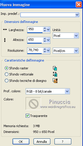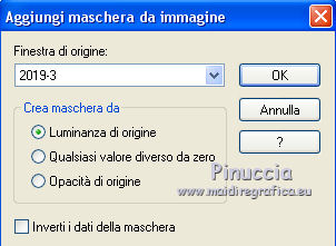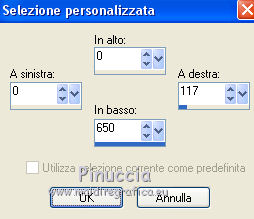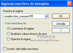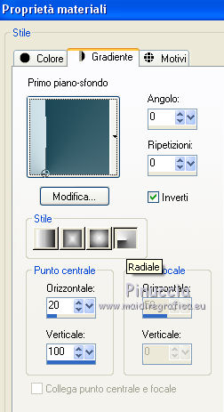 qui puoi trovare qualche risposta ai tuoi dubbi. Se l'argomento che ti interessa non è presente, ti prego di segnalarmelo. Per tradurre il tutorial ho usato Corel X7, ma può essere eseguito con ogni versione di PSP. Dalla versione X4, il comando Immagine>Rifletti è stato sostituito con Immagine>Capovolgi in orizzontale, e il comando Immagine>Capovolgi con Immagine>Capovolgi in verticale. Nelle versioni X5 e X6, le funzioni sono state migliorate rendendo disponibile il menu Oggetti. Con la nuova versione X7, sono tornati Rifletti/Capovolgi, ma con nuove differenze Vedi la scheda sull'argomento qui traduzione in francese qui Le vostre versioni quiOccorrente: Materiale qui Per i tubes grazie Lana. (in questa pagina trovi i links ai siti dei creatori di tubes) Filtri in caso di dubbi, ricorda di consultare la mia sezione filtri qui Filters Unlimited 2.0 qui Simple - Blintz, 4Way Average qui Mehdi - Sorting Tiles qui AAA Frames - Foto Frame qui Carolaine and Sensibility - CS-Texture qui AP 01 [Innovations] - Lines SilverLining qui I filtri Simple si possono usare da soli o importati in Filters Unlimited (come fare vedi qui) Se un filtro fornito appare con questa icona ![]() se stai usando altri colori, sperimenta le modalità di miscelatura e opacità più adatte ai tuoi colori Nelle ultime versioni di PSP non c'è il gradiente di primo piano/sfondo (Corel_06_029) Puoi usare i gradienti delle versioni precedenti. Trovi qui i gradienti Corel X. Metti il preset Emboss 3 nella cartella Impostazioni predefinite. Apri le maschere in PSP e minimizzale con il resto del materiale. 1. Imposta il colore di primo piano con #d3e4eb, e il colore di sfondo con #1c4654. ![]() Passa il colore di primo piano a Gradiente di primo piano/sfondo, stile Radiale. ![]() Apri una nuova immagine trasparente 950 x 650 pixels. ![]() Riempi l'immagine trasparente con il gradiente.2. Effetti>Effetti di riflesso>Specchio rotante. ![]() 3. Effetti>Effetti di immagine>Motivo unico. ![]() 4. Effetti>Plugins>Filters Unlimited 2.0 - Simple - Blintz. ![]() 5. Effetti>Effetti di riflesso>Specchio rotante, con i settaggi precedenti. 6. Effetti>Plugins>Mehdi - Sorting Tiles. ![]() 7. Livelli>Duplica. Immagine>Capovolgi. 8. Cambia la modalità di miscelatura di questo livello in Luce diffusa. Livelli>Unisci>Unisci giù. 9. Effetti>Plugins>Filters Unlimited 2.0 - Simple - 4 Way Average. ![]() 10. Attiva lo strumento Selezione ![]() (non importa il tipo di selezione impostato, perchè con la selezione personalizzata si ottiene sempre un rettangolo) clicca sull'icona Selezione personalizzata ![]() e imposta i seguenti settaggi. ![]() Selezione>Innalza selezione a livello. 11. Effetti>Plugins>AAA Frames - Foto Frame. ![]() 12. Selezione>Modifica>Contrai - 10 pixels. Effetti>Plugins>Carolaine and Sensibility - CS-Texture. ![]() Selezione>Deseleziona. 13. Livelli>Duplica. Immagine>Rifletti. Livelli>Unisci>Unisci giù. 14. Effetti>Effetti 3D>Sfalsa ombra, colore nero. ![]() 15. Attiva il livello inferiore, Raster 1. Effetti>Plugins>AP 01 [Innovations] - Lines SilverLining. ![]() 16. Livelli>Nuovo livello raster. Imposta il colore di sfondo con il colore bianco. Riempi il livello con il colore bianco.17. Livelli>Nuovo livello maschera>Da immagine. Apri il menu sotto la finestra di origine e vedrai la lista dei files aperti. Seleziona la maschera 2019-3 ![]() Livelli>Duplica. Livelli>Unisci>Unisci gruppo. 18. Effetti>Filtro definito dall'utente - seleziona il preset Emboss 3 e ok. ![]() 19. Attiva il livello superiore. Livelli>Nuovo livello raster. Riempi il livello con il colore bianco di sfondo.20. Livelli>Nuovo livello maschera>Da immagine. Apri il menu sotto la finestra di origine e seleziona la maschera creation.tine-masque 105 ![]() Livelli>Duplica. Livelli>Unisci>Unisci gruppo. 21. Apri il tube LD-moon tree.png, cancella il watermark e vai a Modifica>Copia. Torna al tuo lavoro e vai a Modifica>Incolla come nuovo livello. 22. Cambia la modalità di miscelatura di questo livello in Filtra, e abbassa l'opacità all'85%. 23. Apri il tube LD-model-547.png, cancella il watermark e vai a Modifica>Copia. Torna al tuo lavoro e vai a Modifica>Incolla come nuovo livello. Immagine>Ridimensiona, all'80%, tutti i livelli non selezionato. Sposta il tube a destra (vedi il mio esempio).Effetti>Effetti 3D>Sfalsa ombra, a scelta. 24. Apri il tube deco-blauw.png e vai a Modifica>Copia. Torna al tuo lavoro e vai a Modifica>Incolla come nuovo livello. Lascialo come sta. Effetti>Effetti di bordo>Aumenta. 25. Imposta nuovamente il colore di sfondo con #1c4654. Immagine>Aggiungi bordatura, 1 pixel, simmetriche, colore di sfondo #1c4654. Immagine>Aggiungi bordatura, 2 pixels, simmetriche, colore di primo piano #d3e4eb. Immagine>Aggiungi bordatura, 1 pixel, simmetriche, colore di sfondo #1c4654. Selezione>Seleziona tutto. Modifica>Copia. Immagine>Aggiungi bordatura, 50 pixels, simmetriche, colore di sfondo #1c4654. Selezione>Inverti. Modifica>Incolla nella selezione. 26. Regola>Sfocatura>Sfocatura gaussiana - raggio 40. ![]() Selezione>Inverti. 27. Effetti>Effetti 3D>Sfalsa ombra, colore nero. ![]() Selezione>Deseleziona. 28. Effetti>Plugins>AAA Frames - Foto Frame, con i settaggi precedenti ![]() 29. Immagine>Ridimensiona, 950 pixels di larghezza, tutti i livelli selezionato. Firma il tuo lavoro su un nuovo livello. Livelli>Unisci>Unisci tutto e salva in formato jpg. Versione con tubes di Luz Cristina ![]() ![]() Se hai problemi o dubbi, o trovi un link non funzionante, o anche soltanto per un saluto, scrivimi. 18 Maggio 2021 |