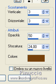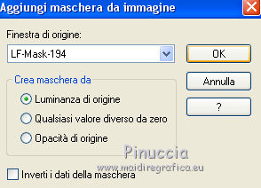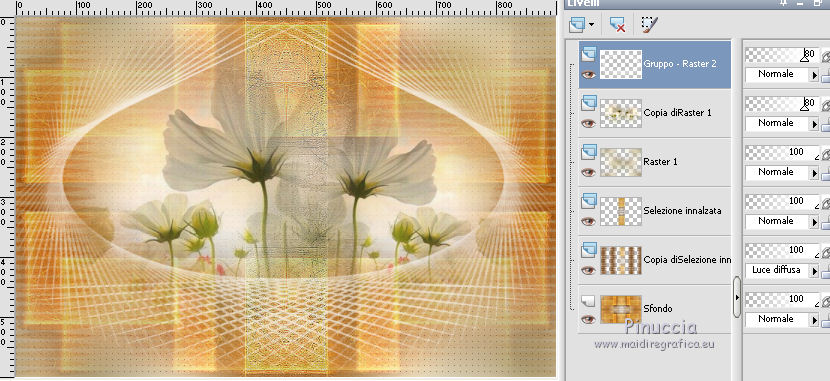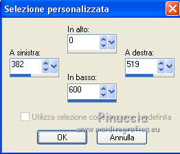 qui puoi trovare qualche risposta ai tuoi dubbi. Se l'argomento che ti interessa non è presente, ti prego di segnalarmelo. Per tradurre il tutorial ho usato Corel X7, ma può essere eseguito con ogni versione di PSP. Dalla versione X4, il comando Immagine>Rifletti è stato sostituito con Immagine>Capovolgi in orizzontale, e il comando Immagine>Capovolgi con Immagine>Capovolgi in verticale. Nelle versioni X5 e X6, le funzioni sono state migliorate rendendo disponibile il menu Oggetti. Con la nuova versione X7, sono tornati Rifletti/Capovolgi, ma con nuove differenze Vedi la scheda sull'argomento qui traduzione in francese qui Le vostre versioni quiOccorrente: Materiale qui Grazie: per il tube Syl e per la maschera Linda. (in questa pagina trovi i links ai siti dei creatori di tubes) Filtri in caso di dubbi, ricorda di consultare la mia sezione filtri qui Filters Unlimited 2.0 qui Simple - 4Way Average qui Sapphire 06 - Sapphire Filter 0518 qui il singolo effetto è nel materiale AAA Frames - Texture Frame qui AP 01 [Innovations] - Lines SilverLining qui I filtri Simple e Sapphire si possono usare da soli o importati in Filters Unlimited (come fare vedi qui) Se un filtro fornito appare con questa icona ![]() se stai usando altri colori, sperimenta le modalità di miscelatura e opacità più adatte ai tuoi colori Apri la maschera in PSP e minimizzala con il resto del materiale. 1. Imposta il colore di primo piano con #ffe94c, e il colore di sfondo con #77410f. ![]() 2. Apri l'immagine di sfondo achtergrond-249. Finestra>Duplica, o sulla tastiera maiuscola+D, per fare una copia. Chiudi l'originale. La copia sarà la base del tuo lavoro. Colorizza se stai usando altri colori. 3. Effetti>Plugins>Filters Unlimited 2.0 - Simple - 4Way Average. ![]() Effetti>Effetti di bordo>Aumenta. 4. Attiva lo strumento Selezione ![]() (non importa il tipo di selezione impostato, perchè con la selezione personalizzata si ottiene sempre un rettangolo) clicca sull'icona Selezione personalizzata ![]() e imposta i seguenti settaggi. ![]() 5. Selezione>Innalza selezione a livello. Selezione>Deseleziona. 6. Livelli>Duplica. Effetti>Plugins>Filters Unlimited 2.0 - Sapphire Filters 06 - SapphirePlugin_0518. ![]() Questo è uno dei casi in cui il risultato dell'effetto cambia secondo la versione di Unlimited utilizzata. Se stai usando la versione di Unlimited che non si installa perchè composta da files in formato 8bf, avrai questo ![]() Se necessario, sostituisci questo livello con l'effetto che trovi nel materiale "sapphire filter.png". 7. Cambia la modalità di miscelatura di questo livello in Luce diffusa. I livelli con la versione software di Unlimited, usata per la traduzione italiana. ![]() I livelli con la versione di Unlimited in files 8bf, usata per la traduzione francese ![]() I livelli con la sostituzione del livello ![]() 8. Attiva il livello sottostante (selezione innalzata). Livelli>Disponi>Porta in alto. Effetti>Effetti di bordo>Aumenta. 9. Apri il tube witte-bloemen.png e vai a Modifica>Copia. Torna al tuo lavoro e vai a Modifica>Incolla come nuovo livello. Livelli>Duplica. 10. Attiva il livello Raster 1 (il livello del tube). Regola>Sfocatura>Sfocatura gaussiana - raggio 40. ![]() 11. Effetti>Effetti di immagine>Motivo unico. ![]() 12. Effetti>Plugins>AP 01 [Innovations] - Lines SilverLining. ![]() 13. Attiva il livello superiore, copia di Raster 1. Abbassa l'opacità di questo livello all'80%. Effetti>Effetti di immagine>Scostamento. ![]() 14. Imposta il colore di sfondo con il colore bianco. Livelli>Nuovo livello raster. Riempi il livello con il colore bianco.15. Livelli>Nuovo livello maschera>Da immagine. Apri il menu sotto la finestra di origine e vedrai la lista dei files aperti. Seleziona la maschera LF-Mask-194. ![]() Livelli>Duplica. Livelli>Unisci>Unisci gruppo. 16. Abbassa l'opacità di questo livello all'80%. ![]() nella traduzione francese i livelli con la sostituzione del livello sapphire plugin ![]() 17. Imposta nuovamente il colore di sfondo con il colore iniziale #77410f. Immagine>Aggiungi bordatura, 1 pixel, simmetriche, colore scuro. Immagine>Aggiungi bordatura, 2 pixels, simmetriche, colore chiaro. Immagine>Aggiungi bordatura, 1 pixel, simmetriche, colore scuro. Selezione>Seleziona tutto. Modifica>Copia. Immagine>Aggiungi bordatura, 50 pixels, simmetriche, colore chiaro. Selezione>Inverti. Modifica>Incolla nella selezione. Regola>Sfocatura>Sfocatura gaussiana - raggio 40. ![]() 18. Selezione>Inverti. Effetti>Effetti 3D>Sfalsa ombra, colore di sfondo #77410f. ![]() Selezione>Deseleziona. 19. Immagine>Aggiungi bordatura, 1 pixel, simmetriche, colore scuro. Immagine>Aggiungi bordatura, 2 pixels, simmetriche, colore chiaro. Immagine>Aggiungi bordatura, 1 pixel, simmetriche, colore scuro. 20. Apri il tube SvB (837) Beauty.png e vai a Modifica>Copia. Torna al tuo lavoro e vai a Modifica>Incolla come nuovo livello. Sposta il tube a destra.![]() 21. Effetti>Effetti 3D>Sfalsa ombra, con i settaggi precedenti. ![]() 22. Firma il tuo lavoro su un nuovo livello. 23. Immagine>Aggiungi bordatura, 1 pixel, simmetriche, colore scuro. 24. Effetti>Plugins>AAA Frames - Texture Frame. ![]() Salva in formato jpg. Versione con tubes di Azalée e Cal ![]() ![]() Se hai problemi o dubbi, o trovi un link non funzionante, o anche soltanto per un saluto, scrivimi. 17 Giugno 2021 |