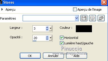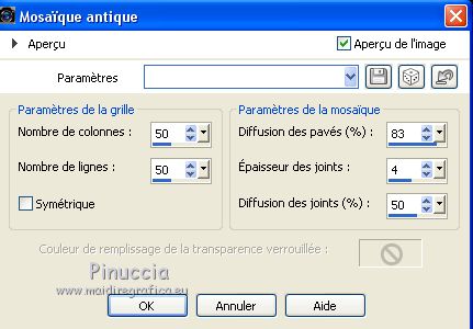 Ce tutoriel a été traduit avec CorelX, mais il peut également être exécuté avec les autres versions. Suivant la version utilisée, vous pouvez obtenir des résultats différents. Depuis la version X4, la fonction Image>Miroir a été remplacée par Image>Renverser horizontalement, et Image>Renverser avec Image>Renverser verticalement. Dans les versions X5 et X6, les fonctions ont été améliorées par la mise à disposition du menu Objets. Dans la nouvelle version X7, nous avons à nouveau Miroir/Renverser, mais avec autres différences. Voir plus les détails à ce sujet ici Certaines dénominations ont changées entre les versions de PSP. Les plus frequentes dénominations utilisées: ![]() Traduction en italien ici Vos versions ici![]() Nécessaire pour réaliser ce tutoriel: Matériel ici Pour les tubes merci Thaiss et H@nne. (les liens des sites des tubeuses ici) Modules Externes consulter, si nécessaire, ma section de filtre ici Filters Unlimited 2.0 ici Graphics Plus - Panel Stripes ici Xero - Porcelain ici FM Tile Tools - Blend Emboss ici Filtres Graphics Plus peuvent être utilisés seuls ou importés dans Filters Unlimited. voir comment le faire ici). Si un filtre est fourni avec cette icône, ![]() Si vous voulez utiliser vos propres couleurs, n'hésitez pas à changer le mode et l'opacité des calques Dans les plus récentes versions de PSP, vous ne trouvez pas le dégradé d'avant plan/arrière plan ou Corel_06_029. Vous pouvez utiliser le dégradé des versions antérieures. Ici le dossier Dégradés de CorelX. Placer les formes KO-Weird dans le dossier Formes prédéfinies. La forme Flèche 16 est standard in PSP. Si vous ne la trouvez pas dans votre PSP, placer la forme fournie dans le dossier Formes Prédéfinies. 1. Ouvrir une nouvelle image transparente 640 x 450 pixels. 2. Placer en avant plan la couleur #aa202e, et en arrière plan la couleur #6e6e6e. ![]() Préparer en avant plan un dégradé de premier plan/arrière plan, style Linéaire. ![]() Remplir l'image transparente du dégradé.3. Calques>Nouveau calque raster. Sélections>Sélectionner tout. 4. Ouvrir le tube Thaiss-Sy-c et Édition>Copier. Revenir sur votre travail et Édition>Coller dans la sélection. Sélections>Désélectionner tout. 5. Réglage>Flou>Flou gaussien - rayon 30. ![]() 6. Effets>Effets de textures>Mosaïque antique ![]() 7. Activer l'outil Sélection ![]() (peu importe le type de sélection, parce que avec la sélection personnalisée vous obtenez toujours un rectangle), cliquer sur Sélection personnalisée ![]() et setter ces paramètres. ![]() Calques>Nouveau calque raster. Remplir la sélection du dégradé.8. Effets>Modules Externes>Graphics Plus - Panel Stripes. ![]() 9. Effets>Effets de textures>Stores, couleur noire. ![]() Sélections>Désélectionner tout. 10. Calques>Dupliquer. Image>Renverser. 10. Activer l'outil Forme prédéfinie ![]() chercher et sélectionner la forme Flèche 16 (standard in PSP) ![]() Commencer à dessiner la forme à partir de 0x163 pixels ![]() jusqu'au bord droit ![]() Calques>Convertir en calque raster. 11. Effets>Effets de textures>Stores, comme précédemment. ![]() 12. Ouvrir le tube lijn et Édition>Copier. Revenir sur votre travail et Édition>Coller comme nouveau calque. Déplacer le tube sur le bord de la sélection personnalisée.![]() 13. Calques>Dupliquer. Image>Renverser. Calques>Fusionner>Fusionner le calque de dessous. 14. Activer à nouveau le tube de Thaiss et Édition>Copier. Revenir sur votre travail et Édition>Coller comme nouveau calque. Image>Redimensionner, 4 fois à 90%, redimensionner tous les calques décoché. (redimensionner les images par petites étapes sert à mantenir la qualité du tube) Positionner le tube à droite, entre les deux lignes,un peu au dehors de l'image ![]() 15. Effets>Effets 3D>Ombre portée, couleur noire. ![]() Calques>Agencer>Déplacer vers le bas. 16. Vous positionner sur le calque du haut de la pile. Activer l'outil Forme prédéfinie ![]() chercher et sélectionner la forme CropBats AOE-w ![]() Dessiner la forme à gauche, entre le deux lignes. ![]() Calques>Convertir en calque raster. 17. Activer l'outil Baguette magique , tolérance et progressivité 0,et cliquer dans la partie centrale grise pour la sélectionner. ![]() Remplir la sélection du dégradé.Effets>Effets de textures>Stores, comme précédemment. Sélections>Désélectionner tout. 18. Effets>Effets 3D>Ombre portée, comme précédemment. ![]() 19. Ouvrir le tube Bloem et Édition>Copier. Revenir sur votre travail et Édition>Coller comme nouveau calque. Image>Redimensionner, 5 fois à 90%, redimensionner tous les calques décoché. Déplacer le tube à gauche.![]() 20. Effets>Modules Externes>FM Tile Tools - Blend Emboss, par défaut, 2 fois. ![]() Réduire l'opacité de ce calque à 65%. 21. Calques>Fusionner>Tous. 22. Image>Ajouter des bordures, 1 pixel, syméTrique, couleur noise. Sélections>Sélectionner tout. Image>Ajouter des bordures, 5 pixels, symétrique, couleur rouge. Sélections>Inverser. Remplir la sélection du dégradé.23. Effets>Modules Externes>Graphics Plus - Panel Stripes, comme précédemment. ![]() 24. Effets>Modules Externes>Xero - Porcelain ![]() Sélections>Désélectionner tout. 25. Signer votre travail sur un nouveau calque. Calques>Fusionner>Tous et enregistrer en jpg. Version avec tubes de Lana ![]() ![]() Si vous avez des problèmes, ou des doutes, ou vous trouvez un link modifié, ou seulement pour me dire que ce tutoriel vous a plu, vous pouvez m'écrire. 20 Février 2021 |