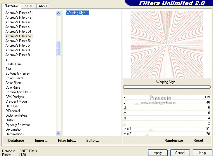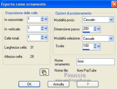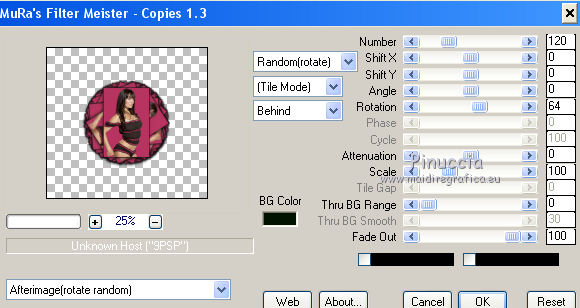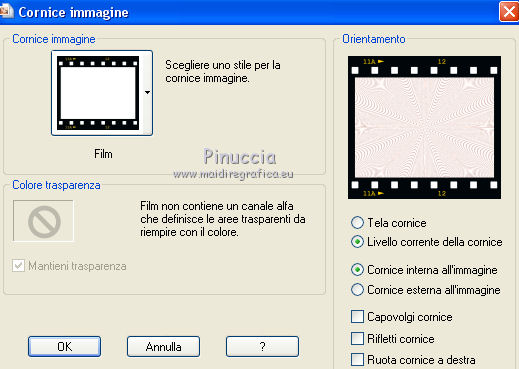 qui puoi trovare qualche risposta ai tuoi dubbi. Se l'argomento che ti interessa non è presente, ti prego di segnalarmelo. Per tradurre il tutorial ho usato Corel X , ma può essere eseguito con ogni versione di PSP. Dalla versione X4, il comando Immagine>Rifletti è stato sostituito con Immagine>Capovolgi in orizzontale, e il comando Immagine>Capovolgi con Immagine>Capovolgi in verticale. Nelle versioni X5 e X6, le funzioni sono state migliorate rendendo disponibile il menu Oggetti. Con la nuova versione X7, sono tornati Rifletti/Capovolgi, ma con nuove differenze Vedi la scheda sull'argomento qui traduzione in francese qui Le vostre versioni quiOccorrente: Materiale qui (in questa pagina trovi i links ai siti dei creatori di tubes) Filtri: in caso di dubbi, ricorda di consultare la mia sezione filtri qui Andrew's Filter 52 - Warping Sign qui Mura's Meister - Copies qui Filters Unlimited 2.0 qui I filtri Andrew's si possono usare da soli o importati in Filters Unlimited (come fare vedi qui) Se un filtro fornito appare con questa icona ![]() se stai usando altri colori, sperimenta le modalità di miscelatura e opacità più adatte ai tuoi colori 1. Apri una nuova immagine trasparente 640 x 600 pixels. Imposta il colore di primo piano con il colore #fee6fd. Riempi l'immagine trasparente con il colore #fee6fd.2. Effetti>Plugins>Filters Unlimited 2.0 - Andrew's Filters 52 - Warping Sign. ![]() 3. Immagine>Cornice-immagine - seleziona la cornice Film ![]() 4. Attiva lo strumento Selezione , rettangolo,modalità Aggiungi ![]() seleziona le lettere e i numeri della cornice ![]() Imposta il colore di sfondo con il colore nero. Riempi la selezione con il colore nero (lo stesso colore della cornice).Selezione>Deseleziona. 5. Attiva lo strumento Bacchetta magica , tolleranza o sfumatura 0,![]() e clicca nei piccoli quadri bianchi per selezionarli. ![]() 6. Livelli>Nuovo livello raster. Selezione>Modifica>Espandi - 1 pixel. Riempi con il colore chiaro di primo piano #fee6fd.7. Imposta il colore di primo piano con il colore #b73460. Selezione>Modifica>Contrai - 2 pixels. Riempi con il colore scuro #b73460.Selezione>Deseleziona. 8. Imposta il colore di primo piano con #5f3d4c. Attiva il livello della cornice. Modalità di corrispondenza dello strumento Riempimento in Valore RGB ![]() Clicca nella parte nera della cornice per riempirla con il colore scuro di primo piano #5f3d4c. Selezione>Deseleziona. 9. Su entrambi i livelli della cornice e dei piccoli quadri: Effetti>Effetti 3D>Sfalsa ombra, colore nero. ![]() 10. Apri una nuova immagine trasparente 185 x 250 pixels. Selezione>Seleziona tutto. Apri l'immagine in jpg e vai a Modifica>Copia. Torna al tuo lavoro e vai a Modifica>Incolla nella selezione. Selezione>Deseleziona. 11. Immagine>Aggiungi bordatura, 1 pixel, simmetriche, colore nero. Modifica>Copia. Torna al tuo lavoro e vai a Modifica>Incolla come nuovo livello. 12. Effetti>Effetti 3D>Sfalsa ombra, con i settaggi precedenti. ![]() Effetti>Plugins>Mura's Meister - Copies. ![]() attendi con pazienza, a volte questo effetto ha bisogno di tempo per l'applicazione Ripeti l'Effetto una seconda volta. 13. Effetti>Effetti 3D>Sfalsa ombra, con i settaggi precedenti. ![]() Immagine>Ridimensiona, al 95%, tutti i livelli non selezionato. Sposta l'immagine un po' più a sinistra.![]() 14. Attiva il livello inferiore. Apri il tube riem e vai a Modifica>Copia. Torna al tuo lavoro e vai a Modifica>Incolla come nuovo livello. Spostalo a destra.15. Attiva il livello superiore. Apri il tube Ribbon e vai a Modifica>Copia. Torna al tuo lavoro e vai a Modifica>Incolla come nuovo livello. Spostalo contro il bordo a sinistra.![]() 16. Livelli>Duplica. Immagine>Rifletti. 17. Apri il tube knoop e vai a Modifica>Copia. Torna al tuo lavoro e vai a Modifica>Incolla come nuovo livello. Livelli>Duplica. Posiziona i due elementi sulla piccola immagine![]() 18. Apri il piccolo fiore rosa "bloempje". File>Esporta>Ornamento, assegna un nome all'ornamento e ok. ![]() 19. Livelli>Nuovo livello raster. Attiva lo strumento Ornamento ![]() cerca e seleziona l'ornamento esportato, dimensione 100 e applicalo sui piccoli quadri in alto ![]() Livelli>Duplica. Sposta la linea di fiori sui quadretti in basso.20. Apri il tube balletjes e vai a Modifica>Copia. Torna al tuo lavoro e vai a Modifica>Incolla come nuovo. Posiziona il tube a tuo piacimento, o vedi il mio esempio.Io ho duplicato il tube. ![]() 21. Immagine>Aggiungi bordatura, 1 pixel, simmetriche, colore chiaro. 22. Firma il tuo lavoro su un nuovo livello. Livelli>Unisci>Unisci tutto e salva in formato jpg. Altra versione ![]() ![]() Se hai problemi o dubbi, o trovi un link non funzionante, o anche soltanto per un saluto, scrivimi. 1 Marzo 2021 |