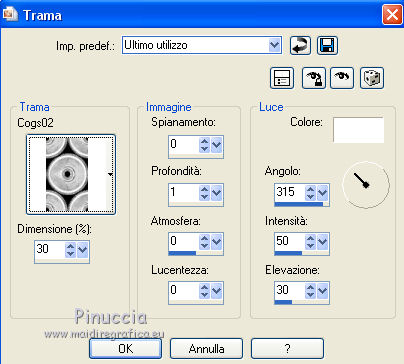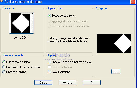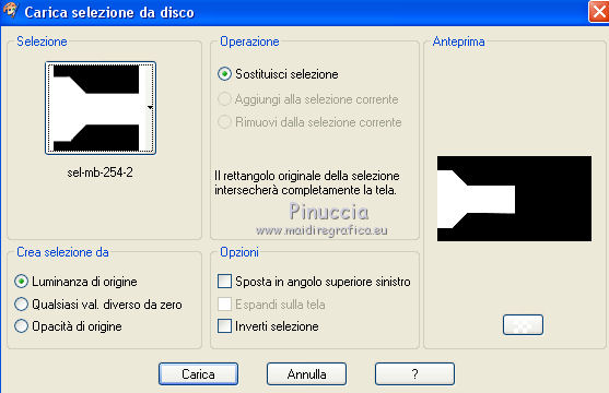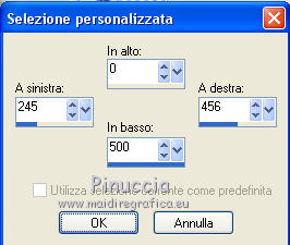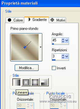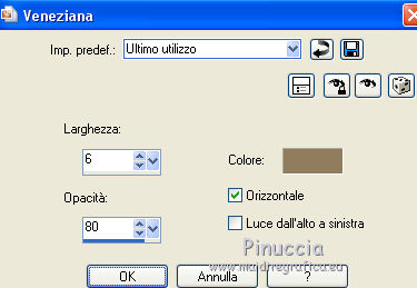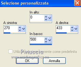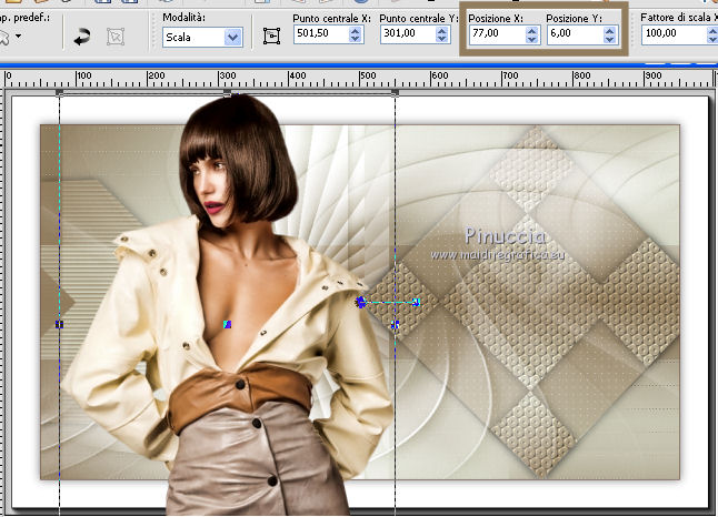 qui puoi trovare qualche risposta ai tuoi dubbi. Se l'argomento che ti interessa non è presente, ti prego di segnalarmelo. Per tradurre il tutorial ho usato Corel X7, ma può essere eseguito con ogni versione di PSP. Dalla versione X4, il comando Immagine>Rifletti è stato sostituito con Immagine>Capovolgi in orizzontale, e il comando Immagine>Capovolgi con Immagine>Capovolgi in verticale. Nelle versioni X5 e X6, le funzioni sono state migliorate rendendo disponibile il menu Oggetti. Con la nuova versione X7, sono tornati Rifletti/Capovolgi, ma con nuove differenze Vedi la scheda sull'argomento qui traduzione in francese qui Le vostre versioni quiOccorrente: Materiale qui Per il tube grazie Cibi-Bijoux. (in questa pagina trovi i links ai siti dei creatori di tubes) Filtri in caso di dubbi, ricorda di consultare la mia sezione filtri qui Filters Unlimited 2.0 qui Mehdi - Sorting Files qui Simple - Half Wrap, Pizza Slice Mirror, Zoom out and flip qui AP 01 [Innovations] - Lines SilverLining href="../../paginafiltri/ap01.zip">qui &<Bkg Designer sf10II> - Fan Blades (da importare in Unlimited) qui Toadies - What are you qui L&K's - L&K Zitah qui AAA Frames - Foto Frame qui I filtri Simple e Toadies si possono usare da soli o importati in Filters Unlimited (come fare vedi qui) Se un filtro fornito appare con questa icona ![]() se stai usando altri colori, sperimenta le modalità di miscelatura e opacità più adatte ai tuoi colori Nelle ultime versioni di PSP non c'è il gradiente di primo piano/sfondo (Corel_06_029) Puoi usare i gradienti delle versioni precedenti. Trovi qui i gradienti Corel X. Metti la trama Cogs02 nella cartella Trame. Metti le selezioni nella cartella Selezioni. Apri la maschera in PSP e minimizzala con il resto del materiale. Imposta il colore di primo piano con #917c5d, e il colore di sfondo con #dde0cd. ![]() Passa il colore di primo piano a Gradiente di primo piano/sfondo, stile Lineare. ![]() 1. Apri una nuova immagine trasparente 900 x 500 pixels. ![]() Riempi l'immagine trasparente con il gradiente.2. Effetti>Plugins>Mehdi - Sorting Tiles. ![]() 3. Effetti>Plugins>Filters Unlimited 2.0 - Simple - Pizza Slice Mirror. ![]() 4. Effetti>Plugins>Filters Unlimited 2.0 - Simple - Half Wrap. ![]() 5. Selezione>Carica/Salva selezione>Carica selezione da disco. Cerca e carica la selezione sel-mb-254-1.PspSelection. ![]() Selezione>Innalza selezione a livello. 6. Livelli>Duplica (Copia di selezione innalzata). Effetti>Plugins>Filters Unlimited 2.0 - Simple - Zoom out and flip. ![]() 7. Effetti>Effetti di trama>Trama - seleziona la trama Cogs02 (o scegli un'altra trama) ![]() Selezione>Deseleziona. 8. Effetti>Effetti 3D>Sfalsa ombra, colore nero. ![]() 9. Attiva il livello sottostante (Selezione innalzata) Effetti>Plugins>AP 01 [Innovations] - Lines SilverLining. ![]() 10. Effetti>Effetti 3D>Sfalsa ombra, con i settaggi precedenti. ![]() 11. Attiva il livello inferiore Raster 1. Selezione>Carica/Salva selezione>Carica selezione da disco. Cerca e carica la selezione sel-mb-254.2. ![]() Selezione>Innalza selezione a livello. 12. Effetti>Effetti di trama>Veneziana - colore scuro. ![]() 13. Effetti>Effetti 3D>Sfalsa ombra, con i settaggi precedenti. ![]() Selezione>Deseleziona. 14. Attiva nuovamente il livello inferiore, Raster 1. Attiva lo strumento Selezione ![]() (non importa il tipo di selezione impostato, perchè con la selezione personalizzata si ottiene sempre un rettangolo) clicca sull'icona Selezione personalizzata ![]() e imposta i seguenti settaggi. ![]() Selezione>Innalza selezione a livello. 15. Effetti>Plugins>Filters Unlimited 2.0 - &<Bkg Designer sf10II> - Fan Blades, con i settaggi standard. ![]() Selezione>Deseleziona. 16. Effetti>Plugins>Toadies - What are you. ![]() Livelli>Disponi>Sposta giù. 17. Attiva il livello soprastante, Selezione Innalzata 2 ![]() Selezione personalizzata ![]() ![]() 18. Effetti>Effetti 3D>Sfalsa ombra, con i settaggi precedenti. ![]() 19. Livelli>Unisci>Unisci giù. Livelli>Disponi>Sposta su. Selezione>Deseleziona. Cambia la modalità di miscelatura di questo livello in Luminanza. 20. Attiva il livello superiore. Imposta il colore di primo piano con il colore bianco #ffffff. Livelli>Nuovo livello raster. Riempi il livello con il colore bianco.Livelli>Nuovo livello maschera>Da immagine. Apri il menu sotto la finestra di origine e vedrai la lista dei files aperti. Seleziona la maschera masker155. ![]() Livelli>Unisci>Unisci gruppo. Regola>Messa a fuoco>Metti a fuoco. 21. Attiva il livello inferiore - Raster 1. Effetti>Plugins>L&K's - L&K Zitah, con i settaggi standard. ![]() Regola>Messa a fuoco>Metti a fuoco. 22. Immagine>Aggiungi bordatura, 1 pixel, simmetriche, colore scuro. Selezione>Seleziona tutto. Immagine>Aggiungi bordatura, 50 pixels, simmetriche, colore bianco. Effetti>Effetti 3D>Sfalsa ombra, con i settaggi precedenti. ![]() Selezione>Deseleziona. 23. Effetti>Plugins>AAA Frames - Foto Frame. ![]() 24. Apri il tube Beauty_Shiloh_by_CibiBijoux.png, cancella il watermark e vai a Modifica>Copia. Torna al tuo lavoro e vai a Modifica>Incolla come nuovo livello. Immagine>Ridimensiona, all'82%, tutti i livelli non selezionato. ![]() 25. Tasto K sulla tastiera per attivare lo strumento Puntatore ![]() e imposta Posizione X: 77,00 e Posizione Y: 6,00. ![]() Tasto M per deselezionare lo strumento. 26. Effetti>Effetti 3D>Sfalsa ombra, con i settaggi precedenti. ![]() 27. Firma il tuo lavoro su un nuovo livello. Personalizza la tua immagine come meglio credi. Livelli>Unisci>Unisci tutto e salva in formato jpg. Per il tube di questo esempio grazie Gabry ![]() ![]() Se hai problemi o dubbi, o trovi un link non funzionante, o anche soltanto per un saluto, scrivimi. |