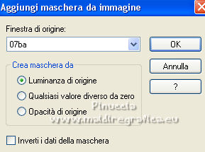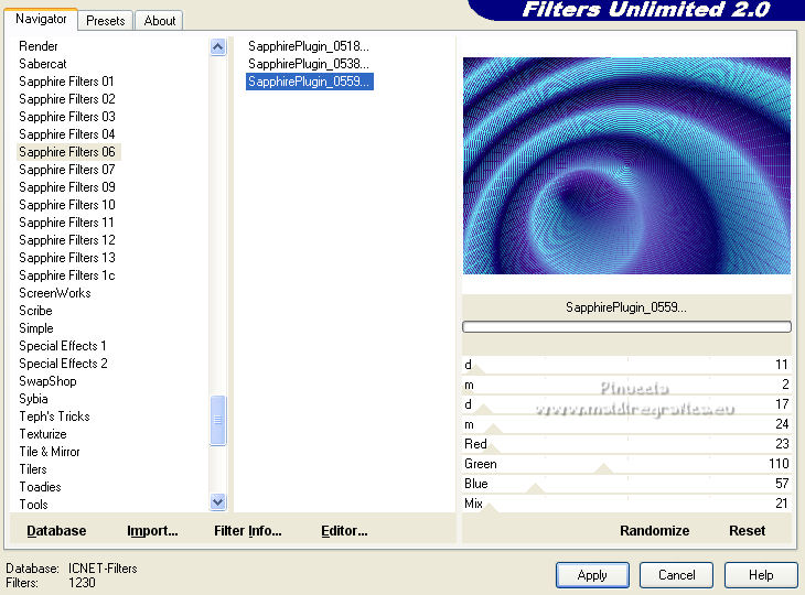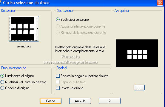 qui puoi trovare qualche risposta ai tuoi dubbi. Se l'argomento che ti interessa non è presente, ti prego di segnalarmelo. Per tradurre il tutorial ho usato Corel X7, ma può essere eseguito con ogni versione di PSP. Dalla versione X4, il comando Immagine>Rifletti è stato sostituito con Immagine>Capovolgi in orizzontale, e il comando Immagine>Capovolgi con Immagine>Capovolgi in verticale. Nelle versioni X5 e X6, le funzioni sono state migliorate rendendo disponibile il menu Oggetti. Con la nuova versione X7, sono tornati Rifletti/Capovolgi, ma con nuove differenze Vedi la scheda sull'argomento qui traduzione in francese qui Le vostre versioni quiOccorrente: Materiale qui Per i tubes grazie Kamalini e Beatriz. (in questa pagina trovi i links ai siti dei creatori di tubes) Filtri in caso di dubbi, ricorda di consultare la mia sezione filtri qui Filters Unlimited 2.0 qui Sapphire filters 06-559 - SapphirePlugin-0559 - trovi nel materiale l'effetto da importare in Unlimited Alien Skin Eye Candy 5 Impact - Glass qui ![]() se stai usando altri colori, sperimenta le modalità di miscelatura e opacità più adatte ai tuoi colori Nelle ultime versioni di PSP non c'è il gradiente di primo piano/sfondo (Corel_06_029) Puoi usare i gradienti delle versioni precedenti. Trovi qui i gradienti Corel X. Metti la selezione nella cartella Selezioni. Apri la maschera in PSP e minimizzala con il resto del materiale. Imposta il colore di primo piano con #091973, e il colore di sfondo con #6c7bce. ![]() Passa il colore di primo piano a Gradiente di primo piano/sfondo, stile Sprazzo di luce. ![]() 1. Apri una nuova immagine trasparente 900 x 600 pixels. ![]() Riempi l'immagine trasparente con il gradiente.2. Effetti>Plugins>Filters Unlimited 2.0 - Sapphire filters 06-559 - SapphirePlugin_0559, con i settaggi standard ![]() se utilizzi l'effetto contenuto nella collezione del filtro che circola in rete, non avrai lo stesso risultato dell'effetto fornito per il tutorial 3. Imposta il colore di sfondo con il colore bianco. Livelli>Nuovo livello raster. Riempi il livello con il colore bianco.4. Livelli>Nuovo livello maschera>Da immagine. Apri il menu sotto la finestra di origine e vedrai la lista dei files aperti. Seleziona la maschera 07ba.jpg ![]() Livelli>Unisci>Unisci gruppo. 5. Cambia la modalità di miscelatura di questo livello in Luminanza (esistente). 6. Apri il tube Blaum-Deco-1 e vai a Modifica>Copia. Torna al tuo lavoro e vai a Modifica>Incolla come nuovo livello. 7. Attiva il livello inferiore, Raster 1. Selezione>Carica/Salva selezione>Carica selezione da disco. Cerca e carica la selezione sel-mb-xxx. ![]() Selezione>Innalza selezione a livello. Livelli>Disponi>Porta in alto. 8. Effetti>Plugins>Alien Skin Eye Candy 5 Impact - Glass. Seleziona il preset Clear e ok. ![]() Selezione>Deseleziona. 9. Effetti>Effetti 3D>Sfalsa ombra, colore nero. ![]() 10. Apri il tube deco-2-255.-BLAUW e vai a Modifica>Copia. Torna al tuo lavoro e vai a Modifica>Incolla come nuovo livello. Tasto K sulla tastiera per attivar elo strumento Puntatore ![]() e imposta Posizione X: 304,00 e Posizione Y: 10,00. ![]() Effetti>Effetti 3D>Sfalsa ombra, con i settaggi precedenti. ![]() 11. Apri il tube 3482-still life-LB TUBES, cancella il watermark e vai a Modifica>Copia. Torna al tuo lavoro e vai a Modifica>Incolla come nuovo livello. Imposta Posizione X: 61,00 e Posizione Y: 71,00. ![]() 12. Cambia la modalità di miscelatura di questo livello in Luminanza (esistente). 13. Apri il tube Kamalini-960 e vai a Modifica>Copia. Torna al tuo lavoro e vai a Modifica>Incolla come nuovo livello. Sposta il tube a destra.14. Effetti>Effetti 3D>Sfalsa ombra, con i settaggi precedenti. ![]() 15. Immagine>Aggiungi bordatura, 1 pixel, simmetriche, colore scuro. Immagine>Aggiungi bordatura, 2 pixels, simmetriche, colore bianco. Immagine>Aggiungi bordatura, 1 pixel, simmetriche, colore scuro. Immagine>Aggiungi bordatura, 5 pixels, simmetriche, colore bianco. Immagine>Aggiungi bordatura, 1 pixel, simmetriche, colore scuro. Immagine>Aggiungi bordatura, 40 pixels, simmetriche, colore bianco. Immagine>Aggiungi bordatura, 1 pixel, simmetriche, colore scuro. 16. Firma il tuo lavoro e salva in formato jpg. Per i tubes di questo esempio grazie Cibi-Bijoux e Nena Silva ![]() ![]() Se hai problemi o dubbi, o trovi un link non funzionante, o anche soltanto per un saluto, scrivimi. |
