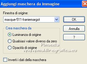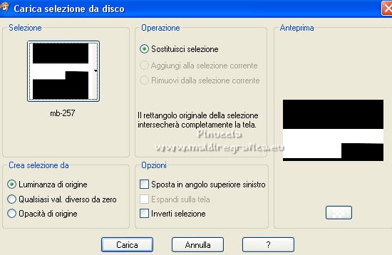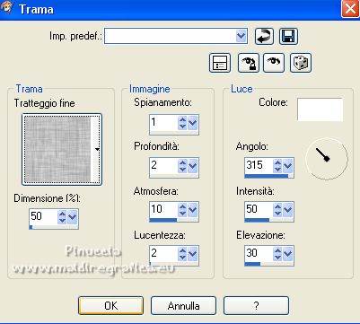 qui puoi trovare qualche risposta ai tuoi dubbi. Se l'argomento che ti interessa non è presente, ti prego di segnalarmelo. Per tradurre il tutorial ho usato Corel X7, ma può essere eseguito con ogni versione di PSP. Dalla versione X4, il comando Immagine>Rifletti è stato sostituito con Immagine>Capovolgi in orizzontale, e il comando Immagine>Capovolgi con Immagine>Capovolgi in verticale. Nelle versioni X5 e X6, le funzioni sono state migliorate rendendo disponibile il menu Oggetti. Con la nuova versione X7, sono tornati Rifletti/Capovolgi, ma con nuove differenze Vedi la scheda sull'argomento qui traduzione in francese qui Le vostre versioni quiOccorrente: Materiale qui Per la maschera grazie Franie Margot. Il resto del materiale è di Mieke. (in questa pagina trovi i links ai siti dei creatori di tubes) Filtri in caso di dubbi, ricorda di consultare la mia sezione filtri qui Filters Unlimited 2.0 qui Mehdi - Sorting Tiles qui Carolaine and Sensibility - CS-LDots, CS-Texture qui Mura's Meister - Pole Transform qui VM Extravaganza - James Bondage qui AAA Filters - AAA Frames qui I filtri VM Extravaganza si possono usare da soli o importati in Filters Unlimited (come fare vedi qui) Se un filtro fornito appare con questa icona ![]() se stai usando altri colori, sperimenta le modalità di miscelatura e opacità più adatte ai tuoi colori La trama Arcering fijn corrisponde alla trama standard in PSP Tratteggio fine o Corel_15_021 Se non la trovi nel tuo PSP, metti quella fornita nella cartella Trame. Metti la selezione nella cartella Selezioni. Apri la maschera in PSP e minimizzala con il resto del materiale. Imposta il colore di primo piano il colore bianco #ffffff, e il colore di sfondo con il colore nero #000000. ![]() 1. Apri una nuova immagine trasparente 900 x 550 pixels. ![]() Riempi l'immagine trasparente con il colore bianco #ffffff.2. Effetti>Plugins>Filters Unlimited 2.0 - Render. ![]() 3. Effetti>Plugins>Mehdi - Sorting Tiles. ![]() 4. Selezione>Carica/Salva selezione>Carica selezione da disco. Cerca e carica la selezione mb 257. ![]() Selezione>Innalza selezione a livello. Selezione>Deseleziona. 5. Livelli>Duplica. Effetti>Plugins>Mura's Meister - Pole Transform. ![]() 7. Effetti>Plugins>Filters Unlimited 2.0 - VM Extravaganza - James Bondage, con i settaggi standard. ![]() 8. Effetti>Plugins>Carolaine and Sensibility - CS-LDots. ![]() 9. Effetti>Effetti 3D>Sfalsa ombra, colore nero. ![]() 10. Attiva il livello centrale, Selezione innalzata. ![]() Effetti>Effetti geometrici>Pentagono. ![]() Modifica>Ripeti Pentagono. 11. Effetti>Effetti 3D>Sfalsa ombra, con i settaggi precedenti. ![]() 12. Effetti>Plugins>Carolaine and Sensibility - CS-Texture. ![]() 13. Livelli>Duplica. Immagine>Ruota per gradi - 90 gradi a sinistra. ![]() 14. Tasto K sulla tastiera per attivare lo strumento Puntatore ![]() e imposta Posizione X: 486,00 e Posizione Y: -30,00. ![]() Tasto M per deselezionare lo strumento. 15. Attiva il livello di sfondo, Raster 1. Effetti>Effetti di trama>Trama - seleziona la trama Tratteggio fine o Corel_15_021 ![]() 16. Attiva il livello superiore. Livelli>Nuovo livello raster. Riempi il livello con il colore bianco #ffffff.17. Livelli>Nuovo livello maschera>Da immagine. Apri il menu sotto la finestra di origine e vedrai la lista dei files aperti. Seleziona la maschera masque-511-franiemargot. ![]() Livelli>Unisci>Unisci gruppo. 18. Immagine>Capovolgi. Tasto K per attivare lo strumento Puntatore ![]() mantieni Posizione X: 0,00 e imposta Posizione Y: 128,00. ![]() Effetti>Effetti di bordo>Aumenta. 19. Apri deco-1-275 e vai a Modifica>Copia. Torna al tuo lavoro e vai a Modifica>Incolla come nuovo livello. Imposta Posizione X: 530,00 e Posizione Y: 57,00. ![]() 20. Apri deco-2-257 e vai a Modifica>Copia. Torna al tuo lavoro e vai a Modifica>Incolla come nuovo livello. Imposta Posizione X: 12,00 e Posizione Y: 0,00. ![]() Cambia la modalità di miscelatura di questo livello in Luminanza (esistente). 21. Apri orchide-paars e vai a Modifica>Copia. Torna al tuo lavoro e vai a Modifica>Incolla come nuovo livello. Imposta Posizione X: -7,00 e Posizione Y: 151,00. ![]() Tasto M per deselezionare lo strumento. 22. Immagine>Aggiungi bordatura, 1 pixel, simmetriche, colore #000000. Selezione>Seleziona tutto. Modifica>Copia. Immagine>Aggiungi bordatura, 50 pixels, simmetriche, colore bianco. Selezione>Inverti. Modifica>Incolla nella selezione. Regola>Sfocatura>Sfocatura gaussiana - raggio 20. ![]() Selezione>Inverti. Effetti>Plugins>AAA Frames - Foto Frame. ![]() Effetti>Effetti 3D>Sfalsa ombra, colore nero. ![]() Selezione>Deseleziona. 23. Effetti>Plugins>AAA Frames - Foto Frame. ![]() Firma il tuo lavoro su un nuovo livello. Livelli>Unisci>Unisci tutto e salva in formato jpg. Per il tube di questo esempio grazie Sonia ![]() ![]() Se hai problemi o dubbi, o trovi un link non funzionante, o anche soltanto per un saluto, scrivimi. |
