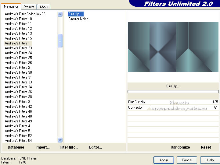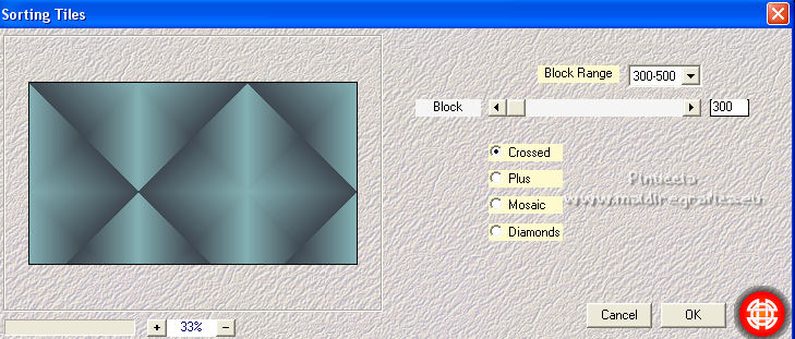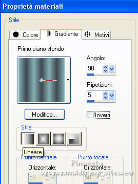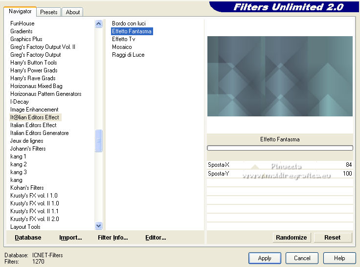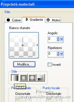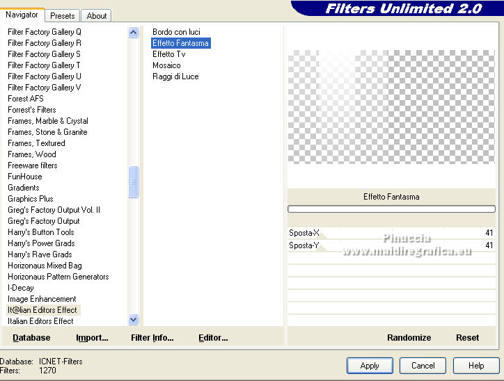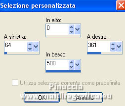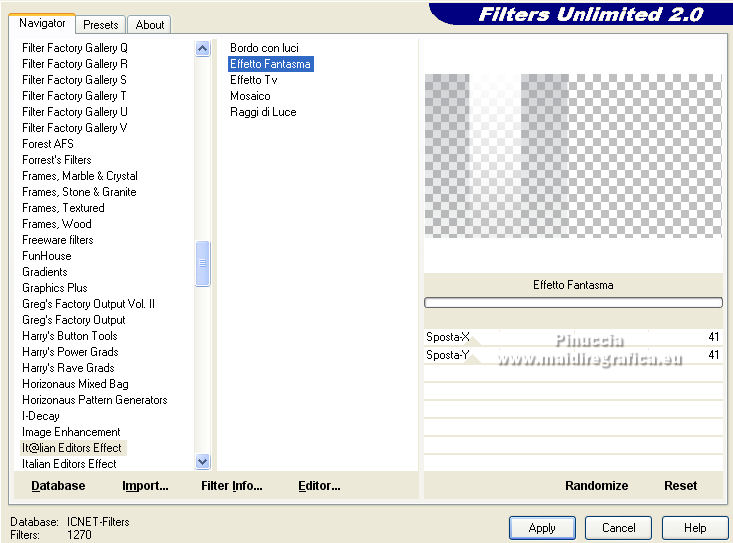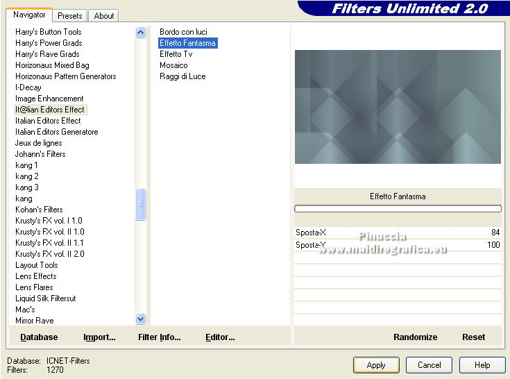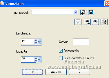 qui puoi trovare qualche risposta ai tuoi dubbi. Se l'argomento che ti interessa non è presente, ti prego di segnalarmelo. Per tradurre il tutorial ho usato Corel X7, ma può essere eseguito con ogni versione di PSP. Dalla versione X4, il comando Immagine>Rifletti è stato sostituito con Immagine>Capovolgi in orizzontale, e il comando Immagine>Capovolgi con Immagine>Capovolgi in verticale. Nelle versioni X5 e X6, le funzioni sono state migliorate rendendo disponibile il menu Oggetti. Con la nuova versione X7, sono tornati Rifletti/Capovolgi, ma con nuove differenze Vedi la scheda sull'argomento qui traduzione in francese qui Le vostre versioni quiOccorrente: Materiale qui Per i tubes grazie Kamalini e Nena Silva Il resto del materiale è di Mieke. (in questa pagina trovi i links ai siti dei creatori di tubes) Filtri in caso di dubbi, ricorda di consultare la mia sezione filtri qui Filters Unlimited 2.0 - versione software qui Filters Unlimited - versione in files 8bf qui Mehdi - Sorting Tiles qui Andrew's Filters 1 - Blur Up qui Italian Editors Effects - Effetto Fantasma qui Flaming Pear - Flexify 2 qui I filtri Andrews e Italian Editors si possono usare da soli o importati in Filters Unlimited (come fare vedi qui) Se un filtro fornito appare con questa icona ![]() se stai usando altri colori, sperimenta le modalità di miscelatura e opacità più adatte ai tuoi colori Nelle ultime versioni di PSP non c'è il gradiente di primo piano/sfondo (Corel_06_029) Puoi usare i gradienti delle versioni precedenti. Trovi qui i gradienti Corel X. Imposta il colore di primo piano con #95b1b4, e il colore di sfondo con #3f4851. ![]() Passa il colore di primo piano a Gradiente di primo piano/sfondo, stile Lineare. ![]() Passa il colore di sfondo a Gradiente e seleziona il gradiente Bianco sfumato (Corel_06_28). ![]() 1. Apri una nuova immagine trasparente 900 x 500 pixels. ![]() Riempi l'immagine trasparente con il gradiente di primo piano.2. Effetti>Plugins>Mehdi - Sorting Tiles. ![]() I filtri di questo tutorial importati in Unlimited possono dare risultati differenti, secondo la versione di Unlimited utilizzata. 3. Effetti>Plugins>Filters Unlimited 2.0 - Andrews Filter 1 - Blur Up. per la versione files 8bf ![]() Versione software ![]() 4. Effetti>Plugins>Filters Unlimited 2.0 - Italian Editors Effects - Effetto Fantasma versione files 8bf ![]() versione software ![]() Effetti>Effetti di bordo>Aumenta di più. 5. Attiva lo strumento Selezione ![]() (non importa il tipo di selezione impostato, perchè con la selezione personalizzata si ottiene sempre un rettangolo) clicca sull'icona Selezione personalizzata ![]() e imposta i seguenti settaggi. ![]() 6. Livelli>Nuovo livello raster. Riempi il livello con il gradiente di sfondo.Selezione>Deseleziona. 7. Effetti>Plugins>Italian Editors Effect - Effetto Fantasma, con i settaggi standard. versione files 8bf ![]() versione software ![]() 8. Effetti>Effetti di immagine>Motivo unico, con i settaggi standard. ![]() 9. Cambia la modalità di miscelatura di questo livello in Sovrapponi. Risultato Unlimited in files 8bf ![]() Risultato Unlimited software ![]() 10. Livelli>Duplica. Effetti>Plugins>Flaming Pear - Flexify 2. ![]() versione Unlimited software ![]() 11. Effetti>Effetti di immagine>Motivo unico, con i settaggi precedenti. ![]() 12. Effetti>Effetti di trama>Veneziana. ![]() Mantieni il livello in modalità Sovrapponi. 13. Apri il tube deco-1-258.png e vai a Modifica>Copia. Torna al tuo lavoro e vai a Modifica>Incolla come nuovo livello. Cambia la modalità di miscelatura di questo livello in Sovrapponi. 14. Apri il tube deco-2-258.png e vai a Modifica>Copia. Torna al tuo lavoro e vai a Modifica>Incolla come nuovo livello. Effetti>Effetti di immagine>Scostamento. ![]() Effetti>Effetti 3D>Sfalsa ombra, colore #000000. ![]() 15. Apri deco-3-258.png e vai a Modifica>Copia. Torna al tuo lavoro e vai a Modifica>Incolla come nuovo livello. 16. Effetti>Effetti di immagine>Scostamento. ![]() 17. Apri deco-4-258.png e vai a Modifica>Copia. Torna al tuo lavoro e vai a Modifica>Incolla come nuovo livello. (puoi adattare i colori ai tuoi, o dopo aver aggiunto i bordi). 18. Immagine>Aggiungi bordatura, 2 pixels, simmetriche, colore scuro. Selezione>Seleziona tutto. Modifica>Copia. Immagine>Aggiungi bordatura, 50 pixels, simmetriche, colore chiaro. Selezione>Inverti. Modifica>Incolla nella selezione. Regola>Sfocatura>Sfocatura gaussiana - raggio 20. ![]() Selezione>Inverti. Effetti>Effetti 3D>Sfalsa ombra, colore #000000. ![]() Selezione>Deseleziona. 22. Apri il tube Kamalini-983.png e vai a Modifica>Copia. Torna al tuo lavoro e vai a Modifica>Incolla come nuovo livello. Tasto K sulla tastiera per attivare lo strumento Puntatore ![]() e imposta Posizione X: 522,00 e Posizione Y: 20,00. o Effetti>Effetti di immagine>Scostamento. ![]() ![]() Effetti>Effetti 3D>Sfalsa ombra, colore #000000. ![]() 23. Apri il tube vvs-floral0652.png (klein) e vai a Modifica>Copia. Torna al tuo lavoro e vai a Modifica>Incolla come nuovo livello. Sposta il tube a destra,oppure Effetti>Effetti di immagine>Scostamento. ![]() Effetti>Effetti 3D>Sfalsa ombra, con i settaggi precedenti. ![]() 24. Immagine>Aggiungi bordatura, 2 pixels, simmetriche, colore scuro. Firma il tuo lavoro su un nuovo livello. Livelli>Unisci>Unisci tutto e salva in formato jpg. Per i tubes di questo esempio grazie Nicole ![]() ![]() Se hai problemi o dubbi, o trovi un link non funzionante, o anche soltanto per un saluto, scrivimi. |