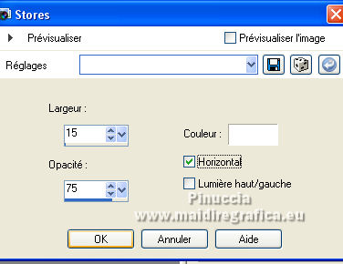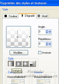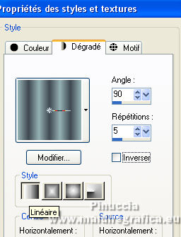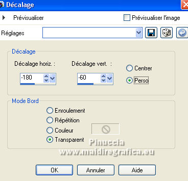 Ce tutoriel a été créé avec CorelX17, mais il peut également être exécuté avec les autres versions. Pour traduire le tutoriel j'ai utilisé CorelX17 pour l'italien et CorelX2 pour le français. Suivant la version utilisée, vous pouvez obtenir des résultats différents. Depuis la version X4, la fonction Image>Miroir a été remplacée par Image>Renverser horizontalement, et Image>Renverser avec Image>Renverser verticalement. Dans les versions X5 et X6, les fonctions ont été améliorées par la mise à disposition du menu Objets. Dans la nouvelle version X7, nous avons à nouveau Miroir/Renverser, mais avec autres différences. Voir plus les détails à ce sujet ici Certaines dénominations ont changées entre les versions de PSP. Les plus frequentes dénominations utilisées: ![]() Traduction en italien ici Vos versions iciNécessaire pour réaliser ce tutoriel: Matériel qui Pour les tubes merci Kamalini et Nena Silva. Le reste du matériel est de Mieke. (les liens des sites des tubeuses ici) Modules Externes consulter, si nécessaire, ma section de filtre ici Filters Unlimited 2.0 - software ici Filters Unlimited - version en fichiers 8bf ici Mehdi - Sorting Tiles ici Andrew's Filters 1 - Blur Up ici Italian Editors Effects - Effetto Fantasma ici Flaming Pear - Flexify 2 ici Filtres Andrew's et Italian Editors peuvent être utilisés seuls ou importés dans Filters Unlimited. voir comment le faire ici). Si un filtre est fourni avec cette icône, ![]() Si vous voulez utiliser vos propres couleurs, n'hésitez pas à changer le mode et l'opacité des calques Dans les plus récentes versions de PSP, vous ne trouvez pas le dégradé d'avant plan/arrière plan ou Corel_06_029. Vous pouvez utiliser le dégradé des versions antérieures. Ici le dossier Dégradés de CorelX. Placer en avant plan la couleur #95b1b4, et en arrière plan la couleur #3f4851. ![]() Préparer en avant plan un dégradé de premier plan/arrière plan, style Linéaire. ![]() Placer en arrière plan le dégradé et sélectionner le dégradé Fondu de blanc, style Linéaire. ![]() 1. Ouvrir une nouvelle image transparente 900 x 500 pixels. ![]() Remplir l'image transparente avec le dégradé d'avant plan.2. Effets>Modules Externes>Mehdi - Sorting Tiles. ![]() Les filtre de ce tutoriel importés dans Unlimited peuvent donner des résultat différents, selon la version d'Unlimited utilisée. 3. Effets>Modules Externes>Filters Unlimited 2.0 - Andrews Filter 1 - Blur Up. pour la versione en fichiers 8bf ![]() version software ![]() 4. Effets>Modules Externes>Filters Unlimited 2.0 - Italian Editors Effects - Effetto Fantasma version fichiers 8bf ![]() version software ![]() Effets>Effets de bords>Accentuer davantage. 5. Activer l'outil Sélection ![]() (peu importe le type de sélection, parce que avec la sélection personnalisée vous obtenez toujours un rectangle), cliquer sur Sélection personnalisée ![]() et setter ces paramètres. ![]() 6. Calques>Nouveau calque raster. Remplir le calque avec le dégradé d'arrière plan.Sélections>Désélectionner tout. 7. Effets>Modules Externes>Italian Editors Effect - Effetto Fantasma, par défaut. version fichiers 8bf ![]() version software ![]() 8. Effets>Effets d'image>Mosaïque sans jointures, par défaut. ![]() 9. Placer le calque en mode Recouvrement Résultat Unlimited en fichiers 8bf ![]() Résultat Unlimited software ![]() 10. Calques>Dupliquer. Effets>Modules Externes>Flaming Pear - Flexify 2. ![]() version Unlimited software ![]() 11. Effets>Effets d'image>Mosaïque sans jointures, comme précédemment. ![]() 12. Effets>Effets de textures>Stores. ![]() Garder le calque en mode Recouvrement. 13. Ouvrir le tube deco-1-258.png - Édition>Copier. Revenir sur votre travail et Édition>Coller comme nouveau calque. Placer le calque en mode Recouvrement 13. Ouvrir le tube deco-2-258.png - Édition>Copier. Revenir sur votre travail et Édition>Coller comme nouveau calque. Effets>Effets d'image>Décalage. ![]() Effets>Effets 3D>Ombre portée, couleur #000000. ![]() 15. Ouvrir deco-3-258.png - Édition>Copier. Revenir sur votre travail et Édition>Coller comme nouveau calque. 16. Effets>Effets d'image>Décalage. ![]() 17. Ouvrir deco-4-258.png - Édition>Copier. Revenir sur votre travail et Édition>Coller comme nouveau calque. (vous pouvez adapter les couleurs aux vôtres, ou après avoir ajouté les bordures 18. Image>Ajouter des bordures, 2 pixels, symétrique, couleur foncée. Sélections>Sélectionner tout. Édition>Copier. Image>Ajouter des bordures, 50 pixels, symétrique, couleur claire. Sélections>Inverser. Édition>Coller dans la sélection. Réglage>Flou>Flou gaussien - rayon 20. ![]() Sélections>Inverser. Effets>Effets 3D>Ombre portée, couleur #000000. ![]() Sélections>Désélectionner tout. 22. Ouvrir le tube Kamalini-983.png - Édition>Copier. Revenir sur votre travail et Édition>Coller comme nouveau calque. Touche K sur le clavier pour activer l'outil Sélecteur ![]() et placer Position horiz.: 522,00 et Position vert.: 20,00. ou Effets>Effets d'image>Décalage. ![]() ![]() Effets>Effets 3D>Ombre portée, couleur #000000. ![]() 23. Ouvrir le tube vvs-floral0652.png (klein) - Édition>Copier. Revenir sur votre travail et Édition>Coller comme nouveau calque. Déplacer le tube à droite,ou Effets>Effets d'image>Décalage. ![]() Effets>Effets 3D>Ombre portée, comme précédemment. ![]() 24. Image>Ajouter des bordures, 2 pixels, symétrique, couleur foncée. Signer votre travail sur un nouveau calque. Calques>Fusionner>Tous et enregistrer en jpg. Pour les tubes de cette version merci Nicole ![]() ![]() Si vous avez des problèmes, ou des doutes, ou vous trouvez un link modifié, ou seulement pour me dire que ce tutoriel vous a plu, vous pouvez m'écrire. |