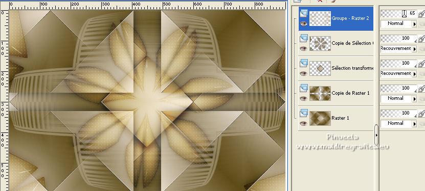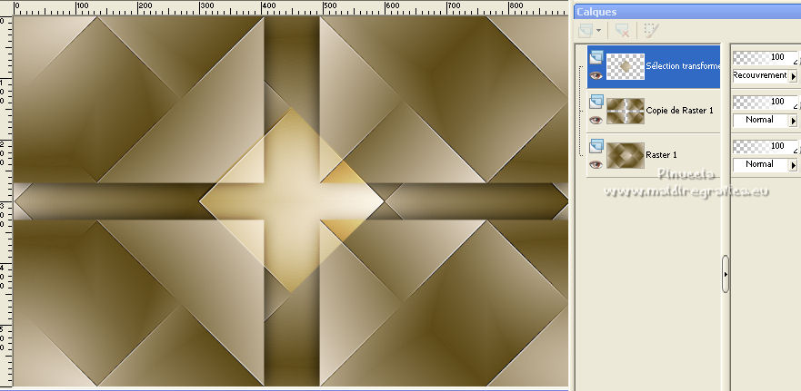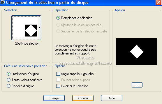 Ce tutoriel a été créé avec CorelX17, mais il peut également être exécuté avec les autres versions. Pour traduire le tutoriel j'ai utilisé CorelX17 pour l'italien et CorelX2 pour le français. Suivant la version utilisée, vous pouvez obtenir des résultats différents. Depuis la version X4, la fonction Image>Miroir a été remplacée par Image>Renverser horizontalement, et Image>Renverser avec Image>Renverser verticalement. Dans les versions X5 et X6, les fonctions ont été améliorées par la mise à disposition du menu Objets. Dans la nouvelle version X7, nous avons à nouveau Miroir/Renverser, mais avec autres différences. Voir plus les détails à ce sujet ici Certaines dénominations ont changées entre les versions de PSP. Les plus frequentes dénominations utilisées: ![]() Traduction en italien ici Vos versions iciNécessaire pour réaliser ce tutoriel: Matériel qui Pour le tube merci Lana. (les liens des sites des tubeuses ici) Modules Externes consulter, si nécessaire, ma section de filtre ici Filters Unlimited 2.0 - software ici Filters Unlimited - version en fichiers 8bf ici Mehdi - Sorting Tiles ici Simple - Half Wrap ici Alien Skin Eye Candy 5 Impact - Glass ici Flaming Pear - Flexify 2 ici AP 01 [Innovations] - Lines SilverLining ici Mura's Meister - Perspective Tiling ici Filtres Simple peuvent être utilisés seuls ou importés dans Filters Unlimited. voir comment le faire ici). Certains filtres peuvent donner des résultats différents selon la version d'Unlimited utilisée. Si un filtre est fourni avec cette icône, ![]() Si vous voulez utiliser vos propres couleurs, n'hésitez pas à changer le mode et l'opacité des calques Dans les plus récentes versions de PSP, vous ne trouvez pas le dégradé d'avant plan/arrière plan ou Corel_06_029. Vous pouvez utiliser le dégradé des versions antérieures. Ici le dossier Dégradés de CorelX. Placer la sélection dans le dossier Sélections. Ouvrir le masque dans PSP et le minimiser avec le reste du matériel. Placer en avant plan la couleur #5f4c19, et en arrière plan la couleur #e8dccc. ![]() Préparer en avant plan un dégradé de premier plan/arrière plan, style Halo. ![]() 1. Ouvrir une nouvelle image transparente 900 x 600 pixels. ![]() Remplir l'image transparente du dégradé.2. Effets>Modules Externes>Mehdi - Sorting Tiles. ![]() 3. Effets>Effets de bords>Accentuer davantage. 4. Calques>Dupliquer. Image>Redimensionner, à 90%, redimensionner tous les calques décoché. 5. Effets>Modules Externes>Filters Unlimited 2.0 - Simple - Half Wrap. ![]() cet effet peut donner des résultats différents selon la version d'Unlimited utilisée 6. Effets>Effets 3D>Ombre portée, couleur noire. ![]() 7. Vous positionner sur le calque Raster 1. Sélections>Charger/Enregistrer une sélection>Charger à partir du disque. Chercher et charger la sélection 259-PspSelection. ![]() Sélections>Transformer la sélection en calque. Calques>Agencer>Placer en haut de la pile. Sélections>Désélectionner tout. 8. Placer le calque en mode Recouvrement (ou selon vos couleurs). ![]() 9. Effets>Modules Externes>Alien Skin Eye Candy 5 Impact - Glass. Sélectionner le preset Clear et ok. ![]() Pour mon example j'ai appliqué ces réglages. ![]() en bas du tutoriel la version conservant le preset Clear. 10. Calques>Dupliquer. Effets>Effets de réflexion>Kaléïdoscope. ![]() 11. Effets>Modules Externes>AP 01 [Innovations] - Lines SilverLining ![]() 12. Calques>Nouveau calque raster. Remplir le calque avec la couleur claire d'arrière plan (ou blanche).13. Calques>Nouveau calque de masque>A partir d'une image. Ouvrir le menu deroulant sous la fenêtre d'origine et vous verrez la liste des images ouvertes. Sélectionner le masque 2BitMask-34. ![]() Calques>Fusionner>Fusionner le groupe. 14. Effets>Modules Externes>Filters Unlimited 2.0 - Simple - Half Wrap. ![]() Avec la version software de Unlimited ![]() 15. Effets>Modules Externes>Flaming Pear - Flexify 2. ![]() avec la version software de Unlimited. ![]() 16. Touche K sur le clavier pour activer l'outil Sélecteur ![]() en mode Échelle ![]() tirer le noeud central gauche jusqu'au bord gauche, et le noeud central droite jusqu'au bord droite, pour couvrir toute la largeur du travail. ![]() Touche M pour désélectionner l'Outil. 17. Réduire l'opacité de ce calque à 65%. ![]() 18. Vous positionner sur le calque du bas de la pile, Raster 1. Calques>Dupliquer. Calques>Agencer>Placer en haut de la pile. Effets>Modules Externes>Mura's Meister - Perspective Tiling. ![]() 19. Activer l'outil Baguette Magique , tolérance et progressivité 0,![]() et cliquer dans la partie transparente pour la sélectionner. 20. Sélections>Modifier>Extérieur/intérieur. ![]() Presser CANC sur le clavier ![]() Sélections>Désélectionner tout. 21. Image>Ajouter des bordures, 2 pixels, symétrique, couleur foncée. Sélections>Sélectionner tout. Image>Ajouter des bordures, 40 pixels, symétrique, couleur claire. Effets>Effets 3D>Ombre portée, couleur noire. ![]() Sélections>Désélectionner tout. 22. Ouvrir le tube LD-model-448, effacer la signature et Édition>Copier. Revenir sur votre travail et Édition>Coller dans la sélection. Image>Redimensionner, à 80%, redimensionner tous les calques décoché. Déplacer le tube à droite.23. Effets>Effets 3D>Ombre portée, comme précédemment. ![]() 24. Signer votre travail sur un nouveau calque. 25. Image>Ajouter des bordures, 2 pixels, symétrique, couleur foncée. Enregistrer en jpg. Version avec le preset Clear (voir étape 9) ![]() Pour les tubes de ces versions merci Luz Cristina ![]() Beatriz ![]() ![]() Si vous avez des problèmes, ou des doutes, ou vous trouvez un link modifié, ou seulement pour me dire que ce tutoriel vous a plu, vous pouvez m'écrire. |