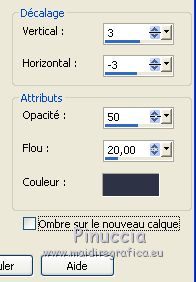 Ce tutoriel a été traduit avec CorelX, mais il peut également être exécuté avec les autres versions. Suivant la version utilisée, vous pouvez obtenir des résultats différents. Depuis la version X4, la fonction Image>Miroir a été remplacée par Image>Renverser horizontalement, et Image>Renverser avec Image>Renverser verticalement. Dans les versions X5 et X6, les fonctions ont été améliorées par la mise à disposition du menu Objets. Dans la nouvelle version X7, nous avons à nouveau Miroir/Renverser, mais avec autres différences. Voir plus les détails à ce sujet ici Certaines dénominations ont changées entre les versions de PSP. Les plus frequentes dénominations utilisées: ![]() Traduction en italien ici Vos versions iciNécessaire pour réaliser ce tutoriel: Matériel ici (les liens des sites des tubeuses ici) Modules Externes consulter, si nécessaire, ma section de filtre ici Filters Unlimited 2.0 ici Andrew's Filter 52 - Warping Sign ici Mura's Meister - Copies ici Filtres Andrew's peuvent être utilisés seuls ou importés dans Filters Unlimited. voir comment le faire ici). Si un filtre est fourni avec cette icône, ![]() Si vous voulez utiliser vos propres couleurs, n'hésitez pas à changer le mode et l'opacité des calques Dans les plus récentes versions de PSP, vous ne trouvez pas le dégradé d'avant plan/arrière plan ou Corel_06_029. Vous pouvez utiliser le dégradé des versions antérieures. Ici le dossier Dégradés de CorelX. 1. Ouvrir une nouvelle image transparente 640 x 600 pixels. Placer en avant plan la couleur #fee6fd. Remplir l'image transparente avec la couleur #fee6fd.2. Effets>Modules Externes>Filters Unlimited 2.0 - Andrew's Filters 52 - Warping Sign. ![]() 3. Image>Cadre - sélectionner le cadre Film ![]() 4. Activer l'outil Sélection , rectangle, mode Ajouter![]() sélectionner les lettres et les chiffres du cadre ![]() Placer en arrière plan la couleur noire. Remplir la sélection avec la couleur noire (couleur du cadre).Sélections>Désélectionner tout. 5. Activer l'outil Baguette magique , tolérance et progressivité 0,![]() et cliquer dans les petits cadres blancs pour les sélectionner. ![]() 6. Calques>Nouveau calque raster. Sélections>Modifier>Agrandir - 1 pixel. Remplir avec la couleur claire d'avant plan #fee6fd.7. Placer en avant plan la couleur #b73460. Sélections>Modifier>Contracter - 2 pixels. Remplir avec la couleur foncée #b73460.Sélections>Désélectionner tout. 8. Placer en avant plan la couleur #5f3d4c. Vous positionner sur le calque du cadre. Mode de correspondance de l'outil Pot de Peinture sur Valeur RGB ![]() cliquer sur la partie noire du cadre pour la remplir avec la couleur foncée. Sélections>Désélectionner tout. 9. Sur les deux calques du cadre et des petits cadres: Effets>Effets 3D>Ombre portée, couleur noire. ![]() 10. Ouvrir une nouvelle image transparente 185 x 250 pixels. Sélections>Sélectionner tout. Ouvrir l'image en jpg et Édition>Copier. Revenir sur votre travail et Édition>Coller dans la sélection. Sélections>Désélectionner tout. 11. Image>Ajouter des bordures, 1 pixel, symétrique, couleur noire. Édition>Copier. Revenir sur votre travail et Édition>Coller comme nouveau calque. 12. Effets>Effets 3D>Ombre portée, comme précédemment. ![]() Effets>Modules Externes>Mura's Meister - Copies. ![]() Veuillez patienter, parfois cet effet prend du temps à s'appliquer Répéter l'Effet une deuxième fois. 13. Effets>Effets 3D>Ombre portée, comme précédemment. ![]() Image>Redimensionner, à 95%, redimensionner tous les calques décoché. Déplacer l'image un peu plus à gauche.![]() 14. Vous positionner sur le calque du bas de la pile. Ouvrir le tube riem et Édition>Copier. Revenir sur votre travail et Édition>Coller comme nouveau calque. Déplacer le tube à droite.15. Vous positionner sur le calque du haut de la pile. Ouvrir le tube Ribbon et Édition>Copier. Revenir sur votre travail et Édition>Coller comme nouveau calque. Déplacer le tube contre le bord à gauche.![]() 16. Calques>Dupliquer. Image>Miroir. 17. Ouvrir le tube knoop et Édition>Copier. Revenir sur votre travail et Édition>Coller comme nouveau calque. Calques>Dupliquer. Positionner les deux éléments sur la petite image.![]() 18. Ouvrir la petite fleur rose "bloempje". Files>Exporter>Tube à images, donner un nome au tube et ok. ![]() 19. Calques>Nouveau calque raster. Activer l'outil Tube à image ![]() chercher et sélectionner le tube exporté, taille 100 et appliquer sur les petits cadres en haut ![]() Calques>Dupliquer. Déplacer la ligne des fleur sur les cadres en bas.20. Ouvrir le tube balletjes et Édition>Copier. Revenir sur votre travail et Édition>Coller comme nouveau calque. Positionner le tube à votre goût, ou voir mon exemple.J'ai dupliqué le tube ![]() 21. Image>Ajouter des bordures, 1 pixel, symétrique, couleur claire. 22. Signer votre travail sur un nouveau calque. Calques>Fusionner>Tous et enregistrer en jpg. Autre version ![]() ![]() Si vous avez des problèmes, ou des doutes, ou vous trouvez un link modifié, ou seulement pour me dire que ce tutoriel vous a plu, vous pouvez m'écrire. 20 Février 2021 |