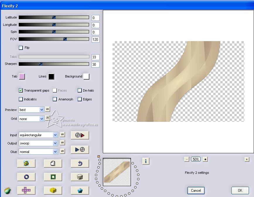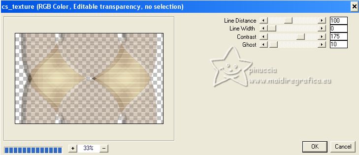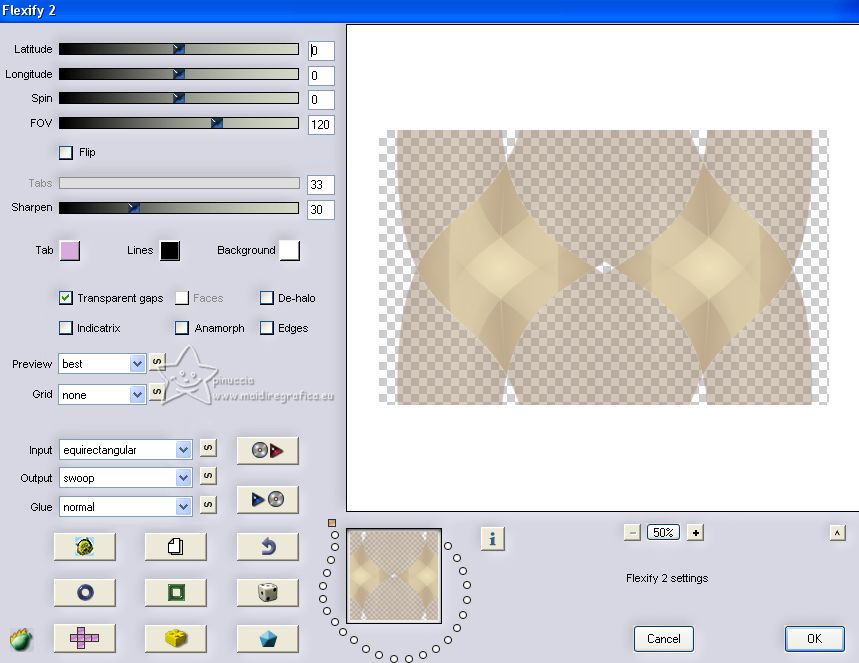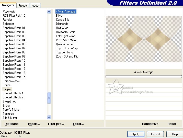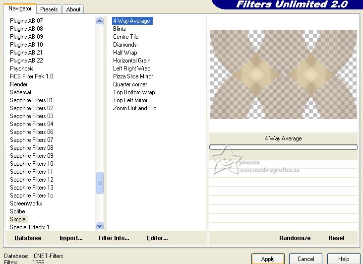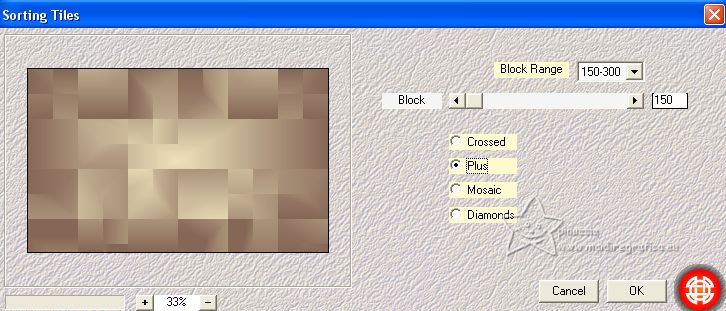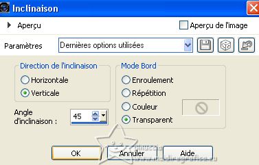 Ce tutoriel a été créé avec CorelX17, mais il peut également être exécuté avec les autres versions. Pour traduire le tutoriel j'ai utilisé CorelX17 pour l'italien et CorelX2 pour le français. Suivant la version utilisée, vous pouvez obtenir des résultats différents. Depuis la version X4, la fonction Image>Miroir a été remplacée par Image>Renverser horizontalement, et Image>Renverser avec Image>Renverser verticalement. Dans les versions X5 et X6, les fonctions ont été améliorées par la mise à disposition du menu Objets. Dans la nouvelle version X7, nous avons à nouveau Miroir/Renverser, mais avec autres différences. Voir plus les détails à ce sujet ici Certaines dénominations ont changées entre les versions de PSP. Les plus frequentes dénominations utilisées: ![]() Traduction en italien ici Vos versions iciNécessaire pour réaliser ce tutoriel: ![]() Pour le tube merci Kamalini (les liens des sites des tubeuses ici) ![]() consulter, si nécessaire, ma section de filtre ici Filters Unlimited 2.0 ici Simple - 4Way Average ici Carolaine and Sensibility - Cs-Texture ici Flaming Pear - Flexify 2 ici Mehdi - Sorting Tiles ici Filtres Simple peuvent être utilisés seuls ou importés dans Filters Unlimited. voir comment le faire ici). Certains filtres peuvent donner des résultats différents selon la version d'Unlimited utilisée. Si un filtre est fourni avec cette icône, ![]() Si vous voulez utiliser vos propres couleurs, n'hésitez pas à changer le mode et l'opacité des calques Dans les plus récentes versions de PSP, vous ne trouvez pas le dégradé d'avant plan/arriére plan ou Corel_06_029. Vous pouvez utiliser le dégradé des versions antérieures. Ici le dossier Dégradés de CorelX. ![]() 1. Placer en avant plan la couleur #efe3bb, et en arrière plan la couleur #866857. ![]() Préparer en avant plan un dégradé de premier plan/arrière plan, Style Rectangulaire. ![]() 2. Ouvrir une nouvelle image transparente 900 x 550 pixels. ![]() Remplir l'image transparente du dégradé.Effets>Modules Externes>Mehdi - Sorting Tiles. ![]() Effets>Effets de réflexion>Miroir rotatif. ![]() 3. Image>Pivoter vers la gauche - et toute l'image tourne. ![]() 4. Répéter Effets>Effets de réflexion>Miroir rotatif. ![]() 5. Image>Pivoter vers la droite. ![]() 6. Activer l'outil Sélection ![]() (peu importe le type de sélection, parce que avec la sélection personnalisée vous obtenez toujours un rectangle), cliquer sur Sélection personnalisée ![]() et setter ces paramétres. ![]() Sélections>Transformer la sélection en calque. Sélections>Désélectionner tout. 7. Effets>Effets géométriques>Inclinaison. ![]() 8. Effets>Modules Externes>Flaming Pear - Flexify 2. ![]() Si vous avez des problèmes avec ce filtre, copie/coller comme nouveau calque le résultat fourni dans le matériel 9. Effets>Effets d'image>Décalage. ![]() 10. Calques>Dupliquer. Image>Miroir. Calques>Fusionner>Fusionner le calque de dessous. 11. Effets>Modules Externes>Filters Unlimited 2.0 - Simple - 4 Way Average ![]() si vous utilisez la version de Unlimited qui n'a pas besoin d'installation, car elle est composée de files au format 8bf, vous aurez ceci ![]() Répéter l'Effet une deuxième fois. 12. Effets>Modules Externes>Flaming Pear - Flexify 2, comme précédemment. ![]() 13. Effets>Modules Externes>Carolaine and Sensibility - CS-Texture. ![]() 14. Effets>Effets de bords>Accentuer davantage. 15. Placer le calque en mode Écran ou réduire l'opacité à 60% (ou selon vos couleurs). 16. Ouvrir deco-1-266.png ![]() Édition>Copier. Revenir sur votre travail et Édition>Coller comme nouveau calque. 17. Effets>Effets d'image>Décalage. ![]() Calques>Dupliquer. Image>Miroir. 18. Ouvrir deco-266-2.png ![]() Édition>Copier. Revenir sur votre travail et Édition>Coller comme nouveau calque. 19. Effets>Effets 3D>Ombre portée, couleur noire. ![]() 20. Ouvrir deco-266-3.png ![]() Édition>Copier. Revenir sur votre travail et Édition>Coller comme nouveau calque. 21. Image>Ajouter des bordures, 2 pixels, symétrique, couleur foncée. Sélections>Sélectionner tout. Image>Ajouter des bordures, 50 pixels, symétrique, couleur claire. 22. Effets>Effets d'image>Mosaïque sans jointures, par défaut. ![]() Sélections>Inverser. Réglage>Flou>Flou gaussien - rayon 30. ![]() Sélections>Inverser. Effets>Effets 3D>Ombre portée, couleur noire. ![]() Sélections>Désélectionner tout. 23. Ouvrir Kamalini-1020 .png ![]() Édition>Copier. Revenir sur votre travail et Édition>Coller comme nouveau calque. Déplacer le tube à droite.Effets>Effets 3D>Ombre portée, couleur noire. ![]() 24. Ouvrir waterbloem.png ![]() Édition>Copier. Revenir sur votre travail et Édition>Coller comme nouveau calque. Déplacer le tube en bas à gauche.25. Image>Ajouter des bordures, 1 pixel, symétrique, couleur foncée. 26. Réglage>Traitement optimal des photos, par défaut. Signer votre travail et enregistrer en jpg. Pour les tubes de cette version merci Gabry ![]() ![]() Si vous avez des problèmes, ou des doutes, ou vous trouvez un link modifié, ou seulement pour me dire que ce tutoriel vous a plu, vous pouvez m'écrire. |