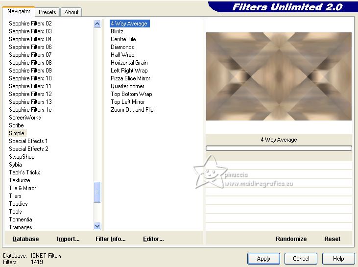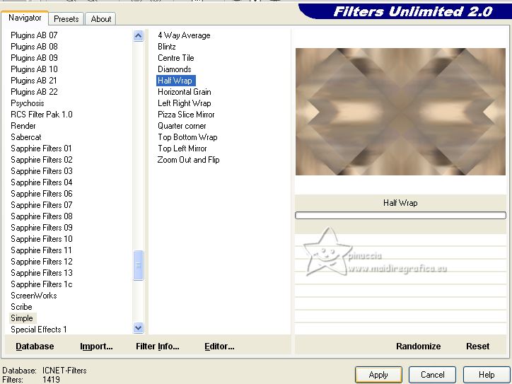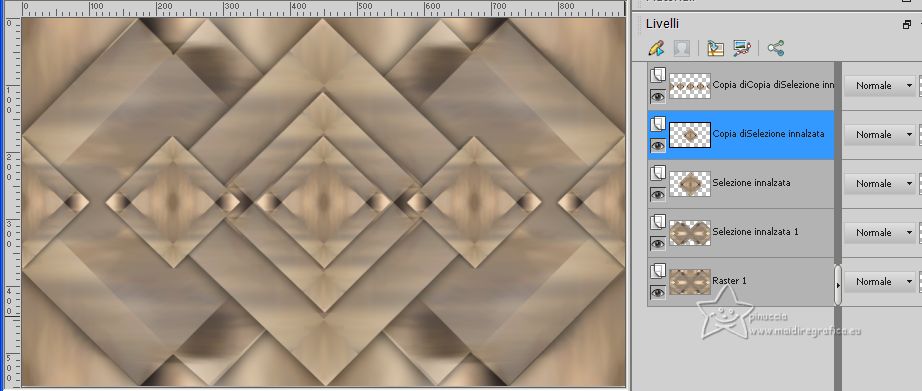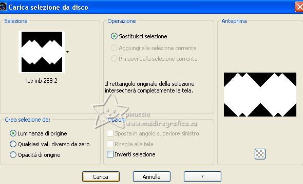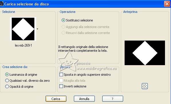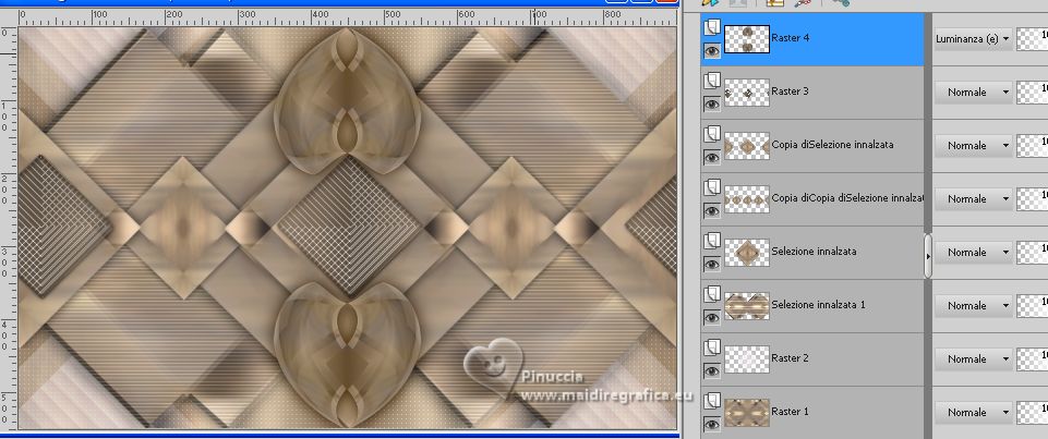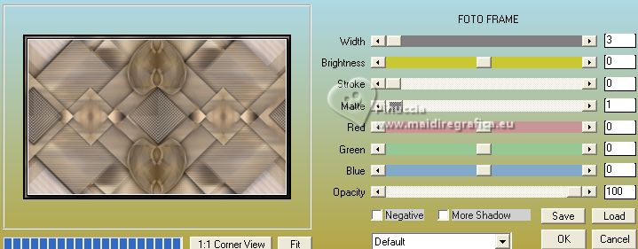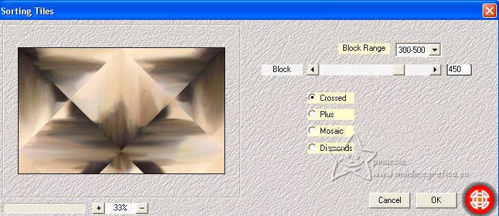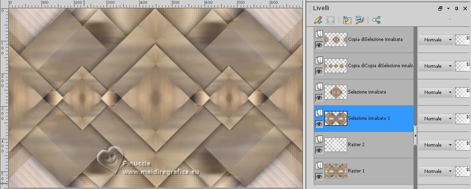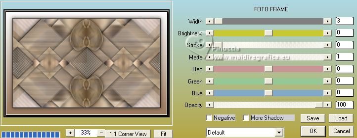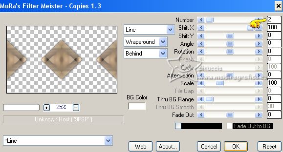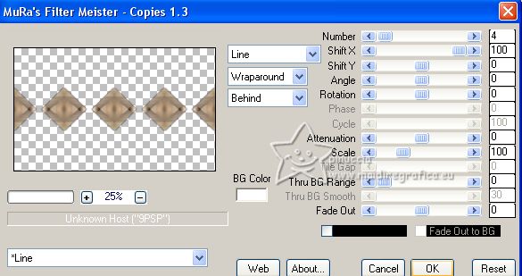 qui puoi trovare qualche risposta ai tuoi dubbi. Se l'argomento che ti interessa non è presente, ti prego di segnalarmelo. Per tradurre il tutorial ho usato Corel X7, ma può essere eseguito con ogni versione di PSP. Dalla versione X4, il comando Immagine>Rifletti è stato sostituito con Immagine>Capovolgi in orizzontale, e il comando Immagine>Capovolgi con Immagine>Capovolgi in verticale. Nelle versioni X5 e X6, le funzioni sono state migliorate rendendo disponibile il menu Oggetti. Con la nuova versione X7, sono tornati Rifletti/Capovolgi, ma con nuove differenze Vedi la scheda sull'argomento qui traduzione in francese qui Le vostre versioni quiOccorrente: ![]() Per i tubes grazie Kamalini e Cloclo (in questa pagina trovi i links ai siti dei creatori di tubes) ![]() in caso di dubbi, ricorda di consultare la mia sezione filtri qui Filters Unlimited 2.0 qui Simple - 4Way Average, Half Wrap qui Mehdi - Sorting Tiles qui Mura's Meister - Copies qui Carolaine and Sensibility - CS-LDots, CS-Texture qui AAA Frames - Foto Frame qui I filtri Simple si possono usare da soli o importati in Filters Unlimited (come fare vedi qui) Alcuni filtri possono dare risultati differenti a seconda della versione di Unlimited utilizzata. Se un filtro fornito appare con questa icona ![]() se stai usando altri colori, sperimenta le modalità di miscelatura e opacità più adatte ai tuoi colori Nelle ultime versioni di PSP non c'é il gradiente di primo piano/sfondo (Corel_06_029) Puoi usare i gradienti delle versioni precedenti. Trovi qui i gradienti Corel X. ![]() Metti le selezioni nella cartella Selezioni. 1. Imposta il colore di primo piano con #987559, e il colore di sfondo con il colore bianco #ffffff. ![]() Passa il colore di primo piano a Gradiente di primo piano/sfondo, stile Lineare. ![]() 2. Apri una nuova immagine trasparente 900 x 550 pixels. ![]() Riempi l'immagine trasparente con il gradiente.3. Selezione>Seleziona tutto. Apri il tube Kamalini-111.png ![]() (questo tube determina il colore e il risultato dei filtri usati nel tutorial) Modifica>Copia. Torna al tuo lavoro e vai a Modifica>Incolla nella selezione. Selezione>Deseleziona. 4. Effetti>Effetti di immagine>Motivo unico, con i settaggi standard. ![]() 5. Regola>Sfocatura>Sfocatura radiale. ![]() 6. Effetti>Plugins>Mehdi - Sorting Tiles. ![]() 7. Effetti>Plugins>Filters Unlimited 2.0 - Simple - 4 Way Average. ![]() 8. Selezione>Carica/Salva selezione>Carica selezione da disco. Cerca e carica la selezione les-mb-269-1 ![]() Selezione>Innalza selezione a livello. Selezione>Deseleziona. 9. Effetti>Effetti 3D>Sfalsa ombra, colore nero. ![]() 10. Attiva il livello inferiore, Raster 1. Effetti>Plugins>Filters Unlimited 2.0 - Simple - Half Wrap ![]() 11. Selezione>Carica/Salva selezione>Carica selezione da disco. Cerca e carica la selezione les-mb-269-2 ![]() Selezione>Innalza selezione a livello. Selezione>Deseleziona. Effetti>Effetti 3D>Sfalsa ombra, con i settaggi precedenti. ![]() 12. Attiva il livello superiore (Selezione innalzata). Livelli>Duplica. Immagine>Ridimensiona, al 60%, tutti i livelli non selezionato. 13. Ripeti: Livelli>Duplica. Immagine>Ridimensiona, al 60%, tutti i livelli non selezionato. 14. Effetti>Plugins>Mura's Meister - Copies. ![]() 15. Attiva il livello sottostante, Copia di Selezione innalzata ![]() 16. Effetti>Plugins>Mura's Meister - Copies - Line 2 e ok. ![]() 17. Livelli>Disponi>Porta in alto. 18. Attiva il livello di sfondo, Raster 1. Effetti>Plugins>Carolaine and Sensibility - CS-LDots. ![]() 19. Apri il tube deco-269-1.png ![]() Modifica>Copia. Torna al tuo lavoro e vai a Modifica>Incolla come nuovo livello. 20. Attiva il livello soprastante (selezione innalzata 1) ![]() Effetti>Plugins>Carolaine and Sensibility - CS-Texture ![]() 21. Apri il tube deco-269-2.png ![]() Modifica>Copia. Torna al tuo lavoro e vai a Modifica>Incolla come nuovo livello. Livelli>Disponi>Porta in alto. 22. Apri il tube deco-269-3.png ![]() Modifica>Copia. Torna al tuo lavoro e vai a Modifica>Incolla come nuovo livello. Cambia la modalità di miscelatura di questo livello in Luminanza (esistente). ![]() 23. Immagine>Aggiungi bordatura, 1 pixel, simmetriche, colore scuro. Effetti>Plugins>AAA Frames - Foto Frame. ![]() 24. Selezione>Seleziona tutto. Immagine>Aggiungi bordatura, 50 pixels, simmetriche, colore bianco #ffffff. Selezione>Inverti. Riempi la selezione con il gradiente.Selezione>Inverti. Effetti>Effetti 3D>Sfalsa ombra, con i settaggi precedenti. ![]() Selezione>Deselezione. 25. Immagine>Aggiungi bordatura, 1 pixel, simmetriche, colore scuro. Effetti>Plugins>AAA Frames - Foto Frame, con i settaggi precedenti. ![]() Regola>Correzione fotografica intelligente (solo se necessario). 26. Apri il tube Kamalini-700 ![]() Modifica>Copia. Torna al tuo lavoro e vai a Modifica>Incolla come nuovo livello. Immagine>Ridimensiona, al 110%, tutti i livelli non selezionato. Sposta il tube a destra.Effetti>Effetti 3D>Sfalsa ombra, con i settaggi precedenti. ![]() 27. Apri il tube 35.png" ![]() Cancella il watermark e vai a Modifica>Copia. Torna al tuo lavoro e vai a Modifica>Incolla come nuovo livello. Sposta il tube a sinistra.Effetti>Effetti 3D>Sfalsa ombra, con i settaggi precedenti. ![]() 28. Firma il tuo lavoro su un nuovo livello. Livelli>Unisci>Unisci tutto e salva in formato jpg. Per i tubes di questi esempi grazie Wieske e Beatriz ![]() Luz Cristina e Edith Spigai ![]() ![]() Se hai problemi o dubbi, o trovi un link non funzionante, o anche soltanto per un saluto, scrivimi. |
