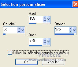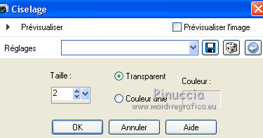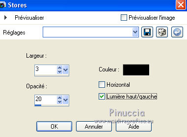 Ce tutoriel a été traduit avec CorelX, mais il peut également être exécuté avec les autres versions. Suivant la version utilisée, vous pouvez obtenir des résultats différents. Depuis la version X4, la fonction Image>Miroir a été remplacée par Image>Renverser horizontalement, et Image>Renverser avec Image>Renverser verticalement. Dans les versions X5 et X6, les fonctions ont été améliorées par la mise à disposition du menu Objets. Dans la nouvelle version X7, nous avons à nouveau Miroir/Renverser, mais avec autres différences. Voir plus les détails à ce sujet ici Certaines dénominations ont changées entre les versions de PSP. Les plus frequentes dénominations utilisées: ![]() Traduction en italien ici Vos versions iciNécessaire pour réaliser ce tutoriel: Matériel ici Pour le tube merci Terry. (les liens des sites des tubeuses ici) Modules Externes consulter, si nécessaire, ma section de filtre ici Filters Unlimited 2.0 ici VM Experimental - Tee Wee ici Texture - Texturizer ici Filtres Toadies et Penta.com peuvent être utilisés seuls ou importés dans Filters Unlimited. voir comment le faire ici). Si un filtre est fourni avec cette icône, ![]() N'hésitez pas à changer le mode mélange des calques et leur opacité selon les couleurs utilisées. Placer la Forma predifinie les26.PsPShape dans le dossier Formes Predefinies. Placer en avant plan la couleur #ebe4df, et en arrière plan la couleur #d9ba9c. ![]() 1. Ouvrir une nouvelle image transparente 640 x 450 pixels. Remplir l'image transparente avec la couleur claire d'avant plan #ebe4df.2. Effets>Effets de textures>Stores, couleur noire. ![]() 3. Sélections>Sélectionner tout. Sélections>Modifier>Contracter - 20 pixels. 4. Effets>Effets 3D>Ciselage ![]() 5. Activer l'outil Sélection ![]() (peu importe le type de sélection, parce que avec la sélection personnalisée vous obtenez toujours un rectangle), cliquer sur Sélection personnalisée ![]() et setter ces paramètres. ![]() Calques>Nouveau calque raster. Remplir la sélection avec la couleur claire.6. Effets>Modules Externes>Texture - Texturizer. ![]() Sélections>Désélectionner tout. 7. Effets>Effets 3D>Ombre portée, couleur noire. ![]() Répéter Ombre portée, vertical et horizontal -3. 8. Calques>Nouveau calque raster. Sélection personnalisée ![]() ![]() Remplir la sélection avec la couleur foncée.Effets>Effets de textures>Stores, comme précédemment. Sélections>Désélectionner tout. 9. Activer l'outil Forme predefinies ![]() chercher et sélectionner la forma pspfun25 ![]() Tracer la forme sur le rectangle intérieur ![]() Calques>Convertir en calque raster. 10. Effets>Modules Externes>Filters Unlimited 2.0 - VM Experimental - Tee Wee ![]() 11. Effets>Effets 3D>Ombre portée, couleur noire. ![]() 12. Ouvrir le tube bloem - Édition>Copier. Revenir sur votre travail et Édition>Coller comme nouveau calque. Positionner bien le tube, voir mon exemple.13. Ouvrir le tube de la femme - Édition>Copier. Revenir sur votre travail et Édition>Coller comme nouveau calque. Positionner le tube à votre goût.14. Effets>Effets 3D>Ombre portée, comme précédemment. 15. Signer votre travail sur un nouveau calque. Calques>Fusionner>Tous et enregistrer en jpg. Version avec tube de Syl ![]() ![]() Si vous avez des problèmes, ou des doutes, ou vous trouvez un link modifié, ou seulement pour me dire que ce tutoriel vous a plu, vous pouvez m'écrire. 20 Décembre 2020 |