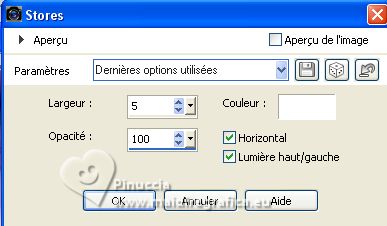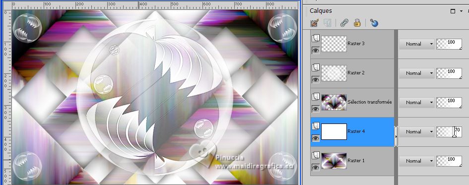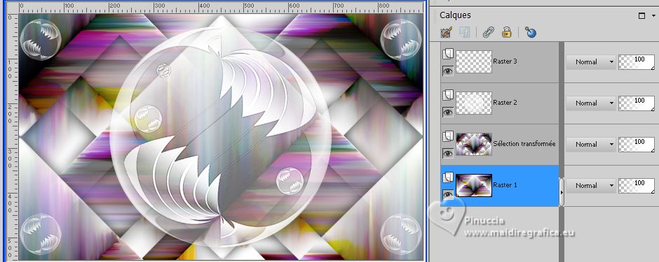 Ce tutoriel a été créé avec CorelX17, mais il peut également être exécuté avec les autres versions. Pour traduire le tutoriel j'ai utilisé CorelX17 pour l'italien et CorelX2 pour le français. Suivant la version utilisée, vous pouvez obtenir des résultats différents. Depuis la version X4, la fonction Image>Miroir a été remplacée par Image>Renverser horizontalement, et Image>Renverser avec Image>Renverser verticalement. Dans les versions X5 et X6, les fonctions ont été améliorées par la mise à disposition du menu Objets. Dans la nouvelle version X7, nous avons à nouveau Miroir/Renverser, mais avec autres différences. Voir plus les détails à ce sujet ici Certaines dénominations ont changées entre les versions de PSP. Les plus frequentes dénominations utilisées: ![]() Traduction en italien ici Vos versions iciNécessaire pour réaliser ce tutoriel: ![]() (les liens des sites des tubeuses ici) ![]() consulter, si nécessaire, ma section de filtre ici Filters Unlimited 2.0 ici Mehdi - Sorting Tiles ici Graphics Plus - Cross Shadow ici Simple - Top Left Mirror ici AAA Frames - Texture Frame ici Adjust - Variations ici Filtres Graphics Plus et Simple peuvent être utilisés seuls ou importés dans Filters Unlimited. voir comment le faire ici). Si un filtre est fourni avec cette icône, ![]() Si vous voulez utiliser vos propres couleurs, n'hésitez pas à changer le mode et l'opacité des calques ![]() Placer la sélection dans le dossier Sélections. 1. Placer en avant plan la couleur #b195e6, et en arrière plan la couleur #ffffff. ![]() 2. Ouvrir une nouvelle image transparente 900 x 550 pixels. ![]() Remplir l'image transparente avec la couleur d'arrière plan #ffffff.3. Sélections>Sélectionner tout. Ouvrir bloem-fantasie.png ![]() Édition>Copier. Minimiser le tube. Revenir sur votre travail et Édition>Coller dans la sélection. Sélections>Désélectionner tout. 4. Effets>Effets d'image>mosaïque sans jointures, par défaut. ![]() 5. Effets>Modules Externes>Mehdi - Sorting Tiles. ![]() 6. Sélections>Charger/Enregistrer une sélection>Charger à partir du disque. Chercher et charger la Sélection les-mb-271-1 ![]() Sélections>Transformer la sélection en calque. Sélections>Désélectionner tout. 7. Effets>Effets d'image>mosaïque sans jointures, comme précédemment. ![]() 8. Effets>Effets 3D>Ombre portée, couleur noire. ![]() 9. Ouvrir deco-271-1.png ![]() Édition>Copier. Revenir sur votre travail et Édition>Coller comme nouveau calque. Il est à sa place. 10. Ouvrir deco-271-2.png ![]() Édition>Copier. Revenir sur votre travail et Édition>Coller comme nouveau calque. 11. Touche K sur le clavier pour activer l'outil Sélecteur ![]() et placer Position horiz.: 2,00 et Position vert.: 11,00. ![]() 12. Effets>Modules Externes>Simple - Top Left Mirror. ![]() 13. Vous positionner sur le calque du bas de la pile - Raster 1. ![]() Calques>Nouveau calque raster. Remplir le calque avec la couleur blanche d'arrière plan #ffffff.Réduire l'opacité de ce calque à 70%. ![]() Calques>Fusionner>Fusionner le calque de dessous. 14. Effets>Effets de textures>Stores - couleur blanche. ![]() 15. Vous positionner sur le calque du haut de la pile. Activer à nouveau le tube bloem-fantasie.png et Édition>Copier. Revenir sur votre travail et Édition>Coller comme nouveau calque. 16. Effets>Effets 3D>Ombre portée, comme précédemment, ou à votre goût. ![]() 17. Image>Ajouter des bordures, 2 pixels, symétrique, couleur foncée. Édition>Copier 18. Sélections>Sélectionner tout. Image>Ajouter des bordures, 50 pixels, symétrique, couleur blanche #ffffff. Sélections>Inverser. Édition>Coller dans la sélection 19. Réglage>Flou>Flou gaussien - rayon 10. ![]() 20. Effets>Modules Externes>Graphics Plus - Cross Shadow. ![]() 21. Sélections>Inverser. Effets>Effets 3D>Ombre portée, comme précédemment. ![]() Sélections>Désélectionner tout. 22. Effets>Modules Externes>AAA Frames - Texture Frame, par défaut. ![]() 23. Image>Ajouter des bordures, 1 pixel, symétrique, couleur noire. 23. Effets>Modules Externes>Adjust - Variation. Un click sur Original pour annuler précédents réglages, un click sur Lighter et ok. ![]() 24. Signer votre travail sur un nouveau calque. Calques>Fusionner>Tous et enregistrer en jpg. Pour les tubes de ces versions merci Nikita ![]() Luz Cristina ![]() Beatriz ![]() ![]() Si vous avez des problèmes, ou des doutes, ou vous trouvez un link modifié, ou seulement pour me dire que ce tutoriel vous a plu, vous pouvez m'écrire. |