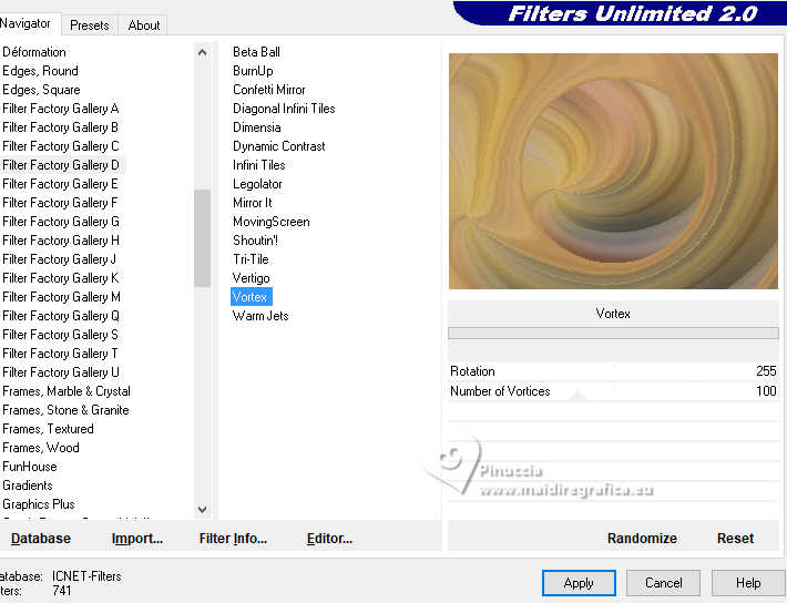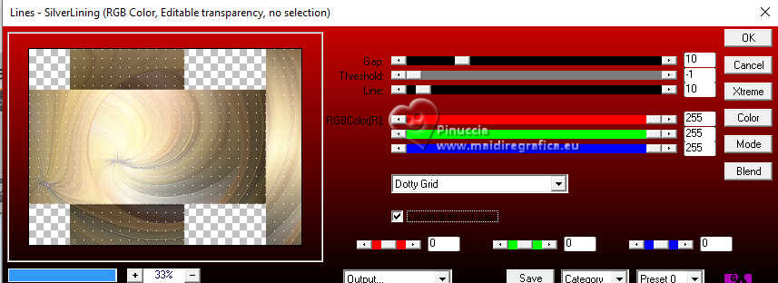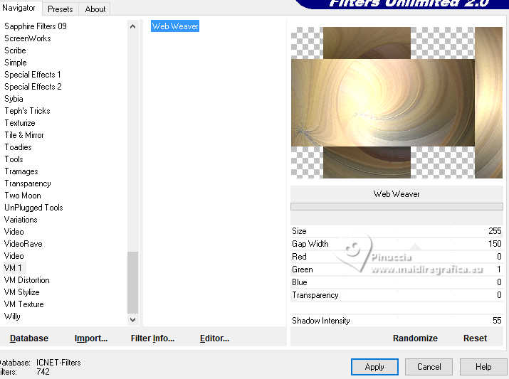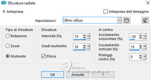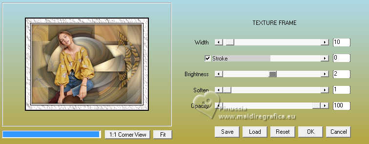 qui puoi trovare qualche risposta ai tuoi dubbi. Se l'argomento che ti interessa non è presente, ti prego di segnalarmelo. Per tradurre il tutorial ho usato PSPX9, ma può essere eseguito con ogni versione di PSP. Dalla versione X4, il comando Immagine>Rifletti è stato sostituito con Immagine>Capovolgi in orizzontale, e il comando Immagine>Capovolgi con Immagine>Capovolgi in verticale. Nelle versioni X5 e X6, le funzioni sono state migliorate rendendo disponibile il menu Oggetti. Con la nuova versione X7, sono tornati Rifletti/Capovolgi, ma con nuove differenze Vedi la scheda sull'argomento qui traduzione in francese qui Le vostre versioni quiOccorrente: ![]() Per la maschera grazie Tine. (in questa pagina trovi i links ai siti dei creatori di tubes) ![]() in caso di dubbi, ricorda di consultare la mia sezione filtri qui Filters Unlimited 2.0 qui Filter Factory Gallery D - Vortex qui VM1 - Web Weaver qui AP 01 [Innovations] - Lines SilverLining qui Flaming Pear - Flexify 2 qui AAA Frames - Texture Frame qui I filtri Factory Gallery si possono usare da soli o importati in Filters Unlimited (come fare vedi qui) Se un filtro fornito appare con questa icona ![]() se stai usando altri colori, sperimenta le modalità di miscelatura e opacità più adatte ai tuoi colori Nelle ultime versioni di PSP non c'é il gradiente di primo piano/sfondo (Corel_06_029) Puoi usare i gradienti delle versioni precedenti. Trovi qui i gradienti Corel X. ![]() 1. Imposta il colore di primo piano con #8d7151, e il colore di sfondo con il colore bianco #ffffff. ![]() Passa il colore di primo piano a Gradiente di primo piano/sfondo, stile Sprazzo di luce. ![]() 2. Apri una nuova immagine trasparente 900 x 650 pixels. ![]() Riempi l'immagine trasparente con il gradiente.3. Selezione>Seleziona tutto. Apri lady-250.png ![]() Modifica>Copia. Torna al tuo lavoro e vai a Modifica>Incolla nella selezione. Selezione>Deseleziona. 4. Regola>Sfocatura>Sfocatura radiale. ![]() Effetti>Effetti di bordo>Aumenta di più. 5. Effetti>Plugins>Filters Unlimited 2.0 - Filter Factory Gallery D - Vortex ![]() Effetti>Effetti di bordo>Aumenta di più. 6. Livelli>Duplica. Effetti>Plugins>Filters Unlimited 2.0 - VM1 - Web Weaver. ![]() 7. Livelli>Duplica. Effetti>Plugins>Flaming Pear - Flexify 2. ![]() 8. Effetti>Effetti 3D>Sfalsa ombra, colore nero. ![]() 9. Oggetti>Allinea>Inferiore. ![]() ![]() 10. Livelli>Duplica. Immagine>Ridimensiona, all'80%, tutti i livelli non selezionato. ![]() 11. Immagine>Rifletti>Rifletti verticalmente (Immagine>Capovolgi). 12. Tasto K sulla tastiera per attivare lo strumento Puntatore ![]() e imposta Posizione X: 53,00 e Posizione Y: 2,00. ![]() ![]() Tasto M per deselezionare lo strumento. 13. Livelli>Unisci>Unisci giù. Attiva il livello sottostante, Copia di Raster 1. 14. Effetti>Plugins>AP 01 [Innovations] - Lines SilverLining. ![]() 15. Modifica>Incolla come nuovo livello (il tube lady-250.png è sempre in memoria). Livelli>Disponi>Porta in alto. Tasto K per attivare lo strumento Puntatore ![]() e imposta Posizione X: 133,00 e Posizione Y: 52,00. ![]() 16. Effetti>Effetti 3D>Sfalsa ombra, colore nero (o a scelta) ![]() 17. Apri deco-25 ![]() Modifica>Copia. Torna al tuo lavoro e vai a Modifica>Incolla come nuovo livello. Imposta Posizione X: 678,00 e Posizione Y: 25,00. ![]() Tasto M per deselezionare lo strumento. 18. Immagine>Aggiungi bordatura, 1 pixel, simmetriche, colore scuro. Immagine>Aggiungi bordatura, 2 pixels, simmetriche, colore chiaro. Immagine>Aggiungi bordatura, 1 pixel, simmetriche, colore scuro. Selezione>Seleziona tutto. Immagine>Aggiungi bordatura, 50 pixels, simmetriche, colore chiaro. Selezione>Inverti. 19. Effetti>Effetti 3D>Sfalsa ombra, colore nero. ![]() 20. Effetti>Plugins>AAA Frames - Texture Frame. ![]() 21. Selezione>Inverti. Effetti>Effetti 3D>Sfalsa ombra, con i settaggi precedenti, o a scelta. ![]() Selezione>Deseleziona. 22. Regola>Correzione fotografica intelligente, con i settaggi standard, o a scelta. 23. Firma il tuo lavoro su un nuovo livello. Livelli>Unisci>Unisci tutto e salva in formato jpg. Per i tubes di questi esempi grazie Beatriz ![]() Maryse ![]() ![]() Se hai problemi o dubbi, o trovi un link non funzionante, o anche soltanto per un saluto, scrivimi. |