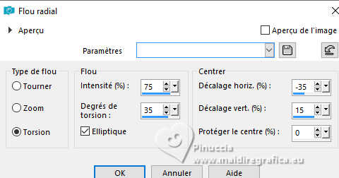 Ce tutoriel a été créé avec CorelX17, mais il peut également être exécuté avec les autres versions. Pour traduire le tutoriel j'ai utilisé CorelX17 pour l'italien et CorelX2 pour le français. Suivant la version utilisée, vous pouvez obtenir des résultats différents. Depuis la version X4, la fonction Image>Miroir a été remplacée par Image>Renverser horizontalement, et Image>Renverser avec Image>Renverser verticalement. Dans les versions X5 et X6, les fonctions ont été améliorées par la mise à disposition du menu Objets. Dans la nouvelle version X7, nous avons à nouveau Miroir/Renverser, mais avec autres différences. Voir plus les détails à ce sujet ici Certaines dénominations ont changées entre les versions de PSP. Les plus frequentes dénominations utilisées: ![]() Traduction en italien ici Vos versions iciNécessaire pour réaliser ce tutoriel: ![]() (les liens des sites des tubeuses ici) ![]() consulter, si nécessaire, ma section de filtre ici Filters Unlimited 2.0 ici Filter Factory Gallery D - Vortex ici VM1 - Web Weaver (à importer dans Unlimited) ici AP 01 [Innovations] - Lines SilverLining ici Flaming Pear - Flexify 2 ici AAA Frames - Texture Frame ici Filtres Factory Gallery peuvent être utilisés seuls ou importés dans Filters Unlimited. voir comment le faire ici). Si un filtre est fourni avec cette icône, ![]() Si vous voulez utiliser vos propres couleurs, n'hésitez pas à changer le mode et l'opacité des calques Dans les plus récentes versions de PSP, vous ne trouvez pas le dégradé d'avant plan/arriére plan ou Corel_06_029. Vous pouvez utiliser le dégradé des versions antérieures. Ici le dossier Dégradés de CorelX. ![]() 1. Placer en avant plan la couleur #8d7151, et en arrière plan la couleur blanche #ffffff. Préparer en avant plan un dégradé de premier plan/arrière plan, style Halo. ![]() 2. Ouvrir une nouvelle image transparente 900 x 650 pixels. ![]() Remplir l'image transparente du dégradé.3. Sélections>Sélectionner tout. Ouvrir lady-250.png ![]() Édition>Copier. Revenir sur votre travail et Édition>Coller dans la sélection. Sélections>Désélectionner tout. 4. Réglage>Flou>Flou radial. ![]() Effets>Effets de bords>Accentuer davantage. 5. Effets>Modules Externes>Filters Unlimited 2.0 - Filter Factory Gallery D - Vortex ![]() Effets>Effets de bords>Accentuer davantage. 6. Calques>Dupliquer. Effets>Modules Externes>Filters Unlimited 2.0 - VM1 - Web Weaver. ![]() 7. Calques>Dupliquer. Effets>Modules Externes>Flaming Pear - Flexify 2. ![]() 8. Effets>Effets 3D>Ombre portée, couleur noire. ![]() 9. Objets>Aligner>Bas ![]() ![]() 10. Calques>Dupliquer. Image>Redimensionner, à 80%, redimensionner tous les calques décoché. ![]() 11. Image>Miroir>Miroir vertical (Image>Renverser). 12. Touche K sur le clavier pour activer l'outil Sélecteur ![]() et placer Position horiz.: 53,00 et Position vert.: 2,00. ![]() Touche M pour désélectionner l'outil. 13. Calques>Fusionner>Fusionner le calque de dessous. Vous positionner sur le calque de dessous, Copie de Raster 1. 14. Effets>Modules Externes>AP 01 [Innovations] - Lines SilverLining. ![]() 15. Édition>Coller comme nouveau calque (le tube lady-250.png est toujours en mémoire). Calques>Agencer>Placer en haut de la pile. Touche K pour activer l'outil Sélecteur ![]() et placer Position horiz.: 133,00 et Position vert.: 52,00. ![]() 16. Effets>Effets 3D>Ombre portée, couleur noire, ou à choix. ![]() 17. Ouvrir deco-25 ![]() Édition>Copier. Revenir sur votre travail et Édition>Coller comme nouveau calque. Placer Position horiz.: 678,00 et Position vert.: 25,00. ![]() Touche M pour désélectionner l'outil. 18. Image>Ajouter des bordures, 1 pixel, symétrique, couleur foncée. Image>Ajouter des bordures, 2 pixels, symétrique, couleur claire. Image>Ajouter des bordures, 1 pixel, symétrique, couleur foncée. Sélections>Sélectionner tout. Image>Ajouter des bordures, 50 pixels, symétrique, couleur claire. Sélections>Inverser. 19. Effets>Effets 3D>Ombre portée, couleur noire. ![]() 20. Effets>Modules Externes>AAA Frames - Texture Frame. ![]() 21. Sélections>Inverser. Effets>Effets 3D>Ombre portée, couleur noire, ou à choix. ![]() Sélections>Désélectionner tout. 22. Réglage>Traitement optimal des photos, par défaut, ou à choix. 23. Signer votre travail sur un nouveau calque. Calques>Fusionner>Tous et enregistrer en jpg. Pour les tubes de ces versions merci Beatriz ![]() Maryse ![]() ![]() Si vous avez des problèmes, ou des doutes, ou vous trouvez un link modifié, ou seulement pour me dire que ce tutoriel vous a plu, vous pouvez m'écrire. |