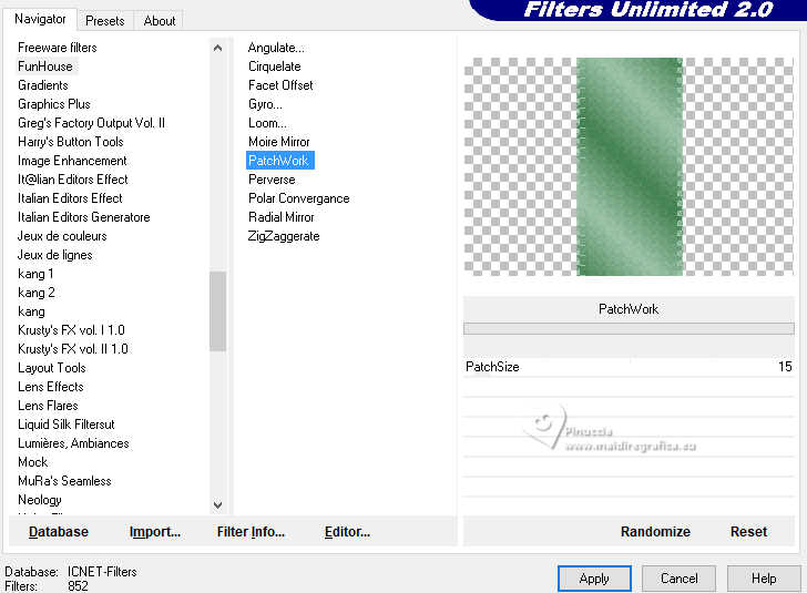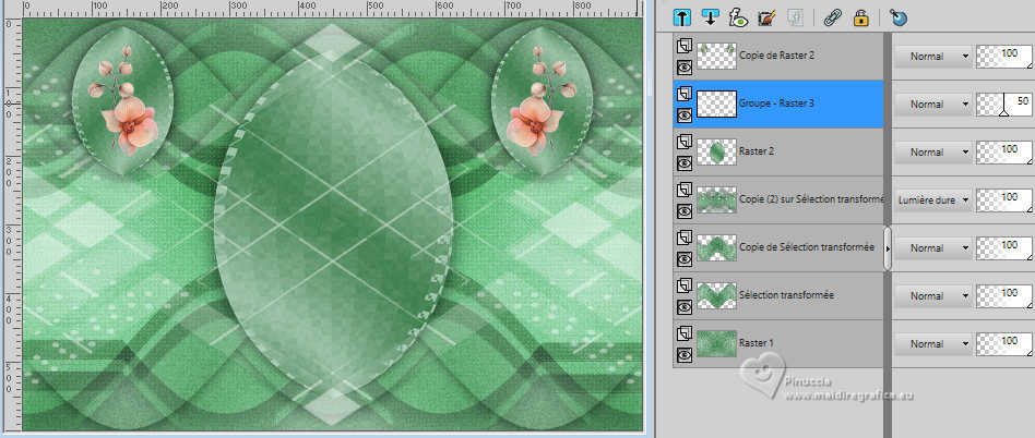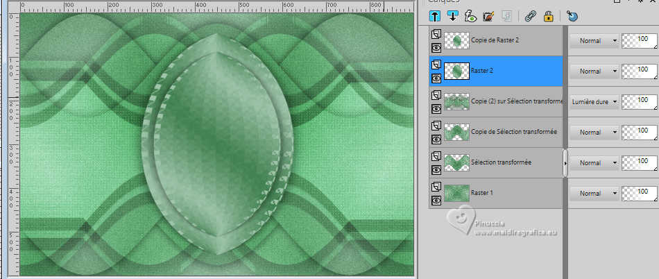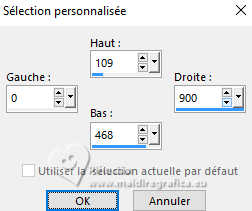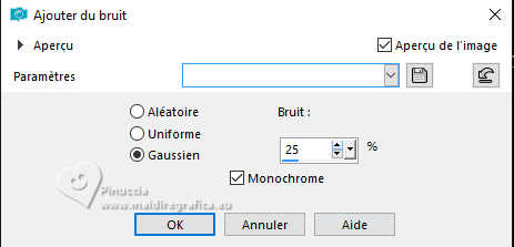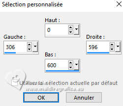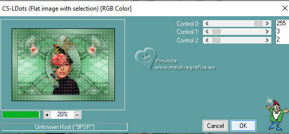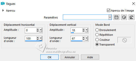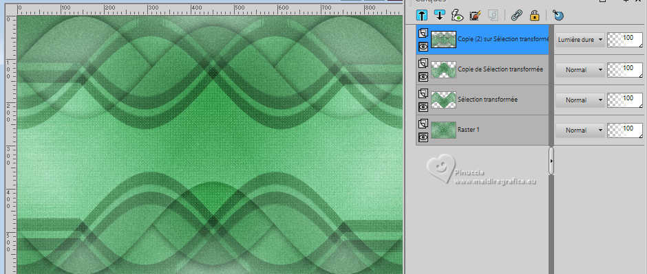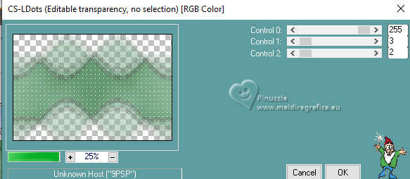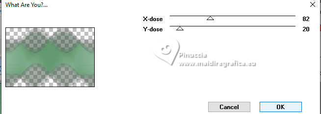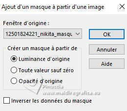 Pour traduire ce tutoriel j'ai utilisé PSPX9, mais il peut également être exécuté avec les autres versions. Suivant la version utilisée, vous pouvez obtenir des résultats différents. Depuis la version X4, la fonction Image>Miroir a été remplacée par Image>Renverser horizontalement, et Image>Renverser avec Image>Renverser verticalement. Dans les versions X5 et X6, les fonctions ont été améliorées par la mise à disposition du menu Objets. Dans la nouvelle version X7, nous avons à nouveau Miroir/Renverser, mais avec autres différences. Voir plus les détails à ce sujet ici Certaines dénominations ont changées entre les versions de PSP. Les plus frequentes dénominations utilisées: ![]() Traduction en italien ici Vos versions iciNécessaire pour réaliser ce tutoriel: ![]() (les liens des sites des tubeuses ici) ![]() consulter, si nécessaire, ma section de filtre ici Filters Unlimited 2.0 ici Funhouse - PatchWork ici Flaming Pear - Flexify ici Carolaine and Sensibility - CS-LDots ici Toadies - What are you ici Filtres Toadies et Funhouse peuvent être utilisés seuls ou importés dans Filters Unlimited. voir comment le faire ici). Si un filtre est fourni avec cette icône, ![]() Si vous voulez utiliser vos propres couleurs, n'hésitez pas à changer le mode et l'opacité des calques Dans les plus récentes versions de PSP, vous ne trouvez pas le dégradé d'avant plan/arriére plan ou Corel_06_029. Vous pouvez utiliser le dégradé des versions antérieures. Ici le dossier Dégradés de CorelX. ![]() Ouvrir le masque dans PSP et le minimiser avec le reste du matériel. 1. Placer en avant plan la couleur #428151, et en arrière plan la couleur #9ec4a9. Préparer en avant plan un dégradé de premier plan/arrière plan, style Linéaire. ![]() 2. Ouvrir une nouvelle image transparente 900 x 600 pixels. ![]() Remplir l'image transparente du dégradé.3. Réglage>Ajouter/Supprimer du bruit>Ajouter du bruit. ![]() 4. Calques>Dupliquer. Image>Miroir>Miroir horizontal (Image>Miroir). 5. Réduire l'opacité de ce calque à 50%. Calques>Fusionner>Fusionner le calque de dessous. 6. Activer l'outil Sélection ![]() (peu importe le type de sélection, parce que avec la sélection personnalisée vous obtenez toujours un rectangle), cliquer sur Sélection personnalisée ![]() et setter ces paramétres. ![]() Sélections>Transformer la sélection en calque. 7. Effets>Effets 3D>Ombre portée, couleur noire. ![]() Sélections>Désélectionner tout. 8. Effets>Effets de distorsion>Vagues. ![]() 9. Calques>Dupliquer. Image>Miroir>Miroir vertical (Image>Renverser). 10. Calques>Dupliquer. Effets>Modules Externes>Toadies - What are you. ![]() 11. Effets>Plugins>Carolaine and Sensibility - CS-LDots. ![]() 12. Effets>Effets 3D>Ombre portée, comme précédemment. ![]() 13. Placer le calque en mode Lumière dure (ou selon vos couleurs). ![]() 14. Calques>Nouveau calque raster. Sélection personnalisée ![]() ![]() Remplir la sélection du dégradé.Sélections>Désélectionner tout. 15. Effets>Modules Externes>Filters Unlimited 2.0 - Funhouse - PatchWork, par défaut. ![]() 16. Effets>Effets 3D>Ombre portée, comme précédemment. ![]() 17. Effets>Modules Externes>Flaming Pear - Flexify 2. ![]() Calques>Dupliquer. 18. Vous positionner sur le calque de dessous, Raster 2. Image>Redimensionner, à 120%, redimensionner tous les calques décoché. ![]() Réglage>Netteté>Netteté. 19. Vous positionner sur le calque du haut, Copie de Raster 2. Image>Redimensionner, à 80%, redimensionner tous les calques décoché. Édition>Répéter Redimensionner. Édition>Répéter Redimensionner. Réglage>Netteté>Netteté. 20. Ouvrir kleine bloem ![]() Édition>Copier. Revenir sur votre travail et Édition>Coller comme nouveau calque. Calques>Fusionner>Fusionner le calque de dessous. 21. Effets>Effets d'image>Décalage. ![]() 22. Effets>Effets 3D>Ombre portée, comme précédemment. ![]() 23. Calques>Dupliquer. Image>Miroir>Miroir horizontal (Image>Miroir). Calques>Fusionner>Fusionner le calque de dessous. 24. Placer en avant plan la couleur blanche #ffffff. Calques>Nouveau calque raster. Remplir le calque avec la couleur blanche.25. Calques>Nouveau calque de masque>A partir d'une image. Ouvrir le menu deroulant sous la fenêtre d'origine et vous verrez la liste des images ouvertes. Sélectionner le masque 12501824221_nikita_masque.jpg ![]() Calques>Dupliquer. Calques>Fusionner>Fusionner le groupe. Réduire l'opacité de ce calque à 50%. Calques>Agencer>Déplacer vers le bas. ![]() 26. Ouvrir deco-1-png ![]() Édition>Copier. Revenir sur votre travail et Édition>Coller comme nouveau calque. Objets>Aligner>Bas. Placer le calque en mode Recouvrement. 27. Ouvrir le tube 12587hjk.png ![]() Édition>Copier. Revenir sur votre travail et Édition>Coller comme nouveau calque. Déplacer le tube un peu plus à droite.![]() 28. Image>Ajouter des bordures, 1 pixel, symétrique, couleur #000000. Image>Ajouter des bordures, 3 pixels, symétrique, couleur d'arrière plan #9ec4a9. Image>Ajouter des bordures, 1 pixel, symétrique, couleur #000000. Sélections>Sélectionner tout. Image>Ajouter des bordures, 50 pixels, symétrique, n'importe quelle couleur. Sélections>Inverser. Placer en avant plan la couleur (#428151) et le dégradé du début. ![]() ![]() Remplir la sélection du dégradé.Effets>Modules Externes>Carolaine and Sensibility - CS-LDots. ![]() Sélections>Inverser. Effets>Effets 3D>Ombre portée, comme précédemment. ![]() Sélections>Désélectionner tout. 29. Image>Ajouter des bordures, 1 pixel, symétrique, couleur #000000. Signer votre travail sur un nouveau calque. Calques>Fusionner>Tous et enregistrer en jpg. Pour les tubes de cette version merci Luz Cristina et Mentali. ![]() ![]() Si vous avez des problèmes, ou des doutes, ou vous trouvez un link modifié, ou seulement pour me dire que ce tutoriel vous a plu, vous pouvez m'écrire. |