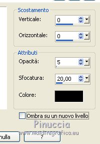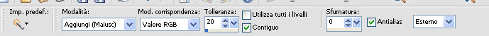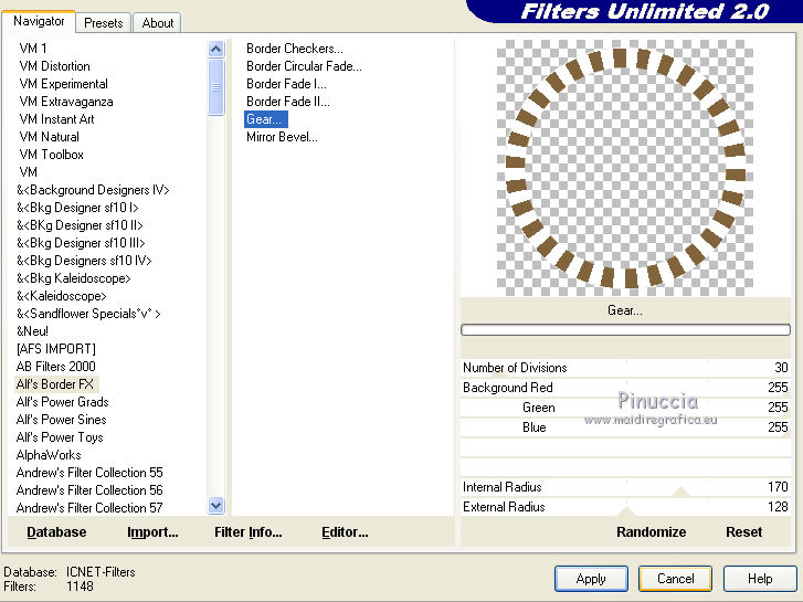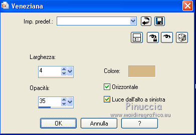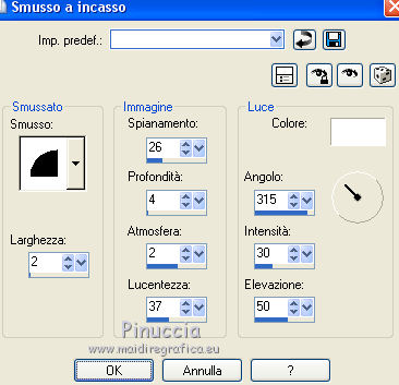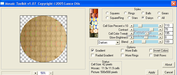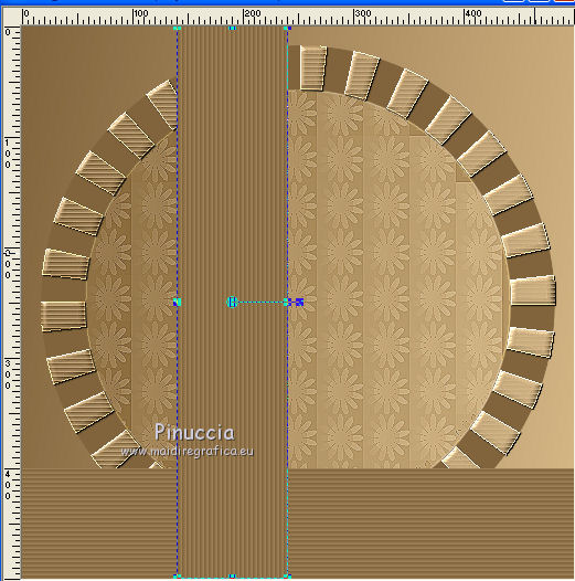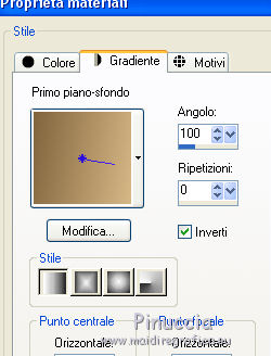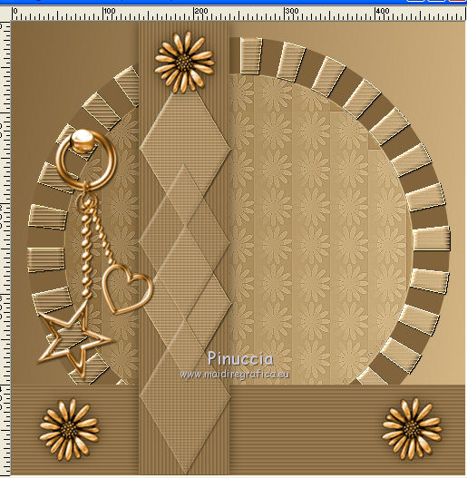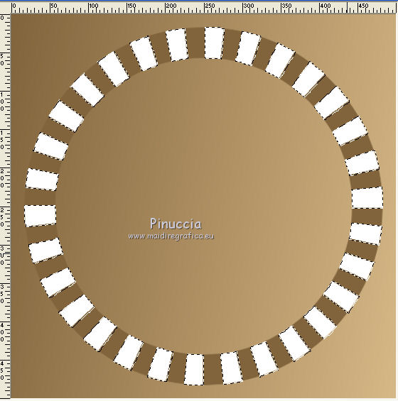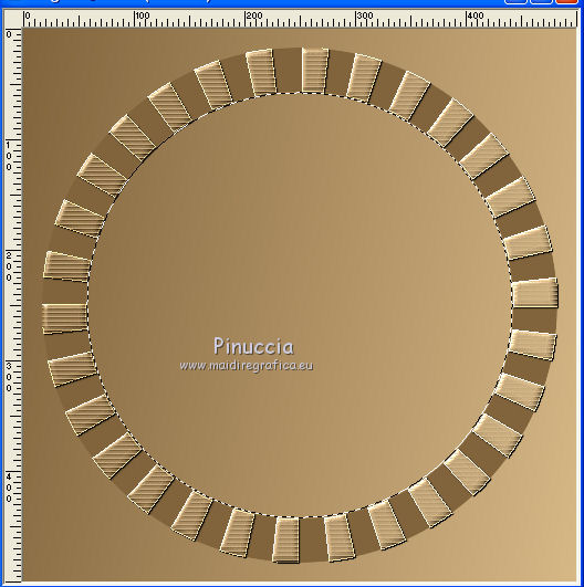 qui puoi trovare qualche risposta ai tuoi dubbi. Se l'argomento che ti interessa non è presente, ti prego di segnalarmelo. Per tradurre il tutorial ho usato Corel X , ma può essere eseguito con ogni versione di PSP. Dalla versione X4, il comando Immagine>Rifletti è stato sostituito con Immagine>Capovolgi in orizzontale, e il comando Immagine>Capovolgi con Immagine>Capovolgi in verticale. Nelle versioni X5 e X6, le funzioni sono state migliorate rendendo disponibile il menu Oggetti. Con la nuova versione X7, sono tornati Rifletti/Capovolgi, ma con nuove differenze Vedi la scheda sull'argomento qui traduzione in francese qui Le vostre versioni quiOccorrente: Materiale qui Per i tubes grazie Dozi e Sdh. (in questa pagina trovi i links ai siti dei creatori di tubes) Filtri: in caso di dubbi, ricorda di consultare la mia sezione filtri qui LOtis - Mosaic Tookit Squares, Rings and Balls qui Alf's Border FX - Gear qui Filters Unlimited 2.0 qui I filtri Alf's Border FX si possono usare da soli o importati in Filters Unlimited (come fare vedi qui) Se un filtro fornito appare con questa icona ![]() se stai usando altri colori, sperimenta le modalità di miscelatura e opacità più adatte ai tuoi colori Nelle più recenti versioni di PSP non c'è il gradiente di primo piano/sfondo (Corel_06_029) Puoi usare i gradienti delle versioni precedenti. Trovi qui i gradienti Corel X. 1. Apri una nuova immagine trasparente 500 x 500 pixels. 2. Imposta il colore di primo piano con #d6b786, e il colore di sfondo con #81643c. ![]() Passa il colore di primo piano a Gradiente di primo piano/sfondo, stile Lineare (la parte scura a sinistra). ![]() Riempi l'immagine trasparente con il gradiente.3. Livelli>Nuovo livello raster. Attiva lo strumento Selezione , cerchio![]() Punta il mouse al centro dell'immagine: 250 x 250 pixels ![]() disegna un cerchio al centro dell'immagine, non troppo vicino ai bordi ![]() Riempi la selezione con il colore scuro di sfondo.4. Selezione>Modifica>Contrai - 40 pixels. Premi sulla tastiera il tasto CANC ![]() Selezione>Inverti. 5. Effetti>Plugins>Filters Unlimited 2.0 - Alf's Border FX - Gear. ![]() Selezione>Deseleziona. 6. Attiva lo strumento Bacchetta magica ![]() ![]() clicca nei quadretti bianchi per selezionarli. ![]() 7. Livelli>Nuovo livello raster. Riempi le selezioni con il gradiente.8. Effetti>Effetti 3D>Smusso a incasso ![]() 9. Effetti>Effetti 3D>Sfalsa ombra, colore nero. ![]() 10. Effetti>Effetti di trama>Veneziana - colore chiaro. ![]() 11. Effetti>Effetti di bordo>Aumenta. Selezione>Deseleziona. 12. Attiva il livello Raster 2. Attiva lo strumento Bacchetta magica , sfumatura e tolleranza 0,e clicca al centro del cerchio per selezionarlo. ![]() Livelli>Nuovo livello raster. Riempi la selezione con il gradiente.13. Effetti>Plugins>Lotis - Mosaic Toolkit 1.07 ![]() 14. Effetti>Effetti di bordo>Aumenta. Abbassa l'opacità di questo livello al 35%. Selezione>Deseleziona. 15. Attiva il livello superiore. Attiva lo strumento Selezione ![]() (non importa il tipo di selezione impostato, perchè con la selezione personalizzata si ottiene sempre un rettangolo) clicca sull'icona Selezione personalizzata ![]() e imposta i seguenti settaggi. ![]() 16. Livelli>Nuovo livello raster. Riempi con il colore scuro.17. Effetti>Effetti di trama>Veneziana, con i settaggi precedenti. Selezione>Deseleziona. 18. Livelli>Duplica. Immagine>Ruota per gradi - 90 gradi a sinistra ![]() Sposta l'immagine contro il bordo superiore,e un po' più a sinistra. ![]() 19. Apri rand MB3 e vai a Modifica>Copia. Torna al tuo lavoro e vai a Modifica>Incolla come nuovo livello. Spostalo sulla striscia.20. Effetti>Effetti 3D>Sfalsa ombra, colore nero. ![]() Livelli>Unisci>Unisci giù. 21. Effetti>Effetti 3D>Sfalsa ombra, colore nero. ![]() 22. Apri il tube del fiore a-dozi's-metal-shapes e vai a Modifica>Copia. Torna al tuo lavoro e vai a Modifica>Incolla come nuovo livello. Spostalo sopra la striscia.23. Effetti>Effetti 3D>Sfalsa ombra, con i settaggi precedenti. Livelli>Duplica - 2 volte. Sposta questi tube in basso, una a destra e uno a sinistra.24. Apri il tube sleutel e vai a Modifica>Copia. Torna al tuo lavoro e vai a Modifica>Incolla come nuovo livello. Spostalo a sinistra.![]() Effetti>Effetti 3D>Sfalsa ombra, con i settaggi precedenti. 25. Apri il tube Harrykewell e vai a Modifica>Copia. Torna al tuo lavoro e vai a Modifica>Incolla come nuovo livello. Effetti>Effetti 3D>Sfalsa ombra, con i settaggi precedenti. 26. Immagine>Aggiungi bordatura, 2 pixels, colore scuro. 27. Firma il tuo lavoro su un nuovo livello. Livelli>Unisci>Unisci tutto e salva in formato jpg. Altra versione con tube fornito nel materiale ![]() ![]() Se hai problemi o dubbi, o trovi un link non funzionante, o anche soltanto per un saluto, scrivimi. 16 Dicembre 2020 |