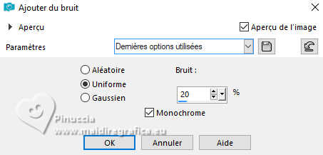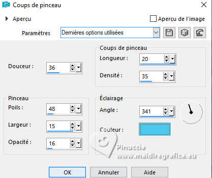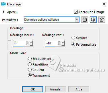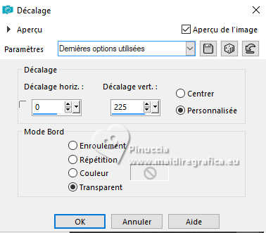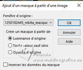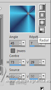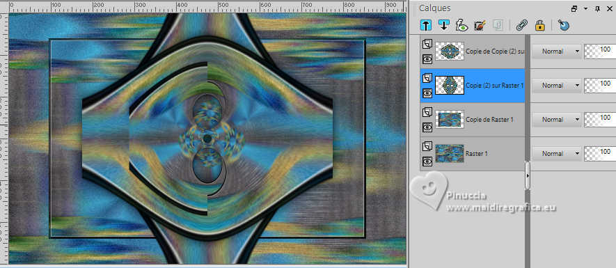 Pour traduire ce tutoriel j'ai utilisé PSPX9, mais il peut également être exécuté avec les autres versions. Suivant la version utilisée, vous pouvez obtenir des résultats différents. Depuis la version X4, la fonction Image>Miroir a été remplacée par Image>Renverser horizontalement, et Image>Renverser avec Image>Renverser verticalement. Dans les versions X5 et X6, les fonctions ont été améliorées par la mise à disposition du menu Objets. Dans la nouvelle version X7, nous avons à nouveau Miroir/Renverser, mais avec autres différences. Voir plus les détails à ce sujet ici Certaines dénominations ont changées entre les versions de PSP. Les plus frequentes dénominations utilisées: ![]() Traduction en italien ici Vos versions iciNécessaire pour réaliser ce tutoriel: ![]() Pour le masque merci Nikita (les liens des sites des tubeuses ici) ![]() consulter, si nécessaire, ma section de filtre ici Flaming Pear - Flexify 2 ici AAA Frames - Foto Frame ici Mura's Meister - Perspective Tiling ici ![]() Si vous voulez utiliser vos propres couleurs, n'hésitez pas à changer le mode et l'opacité des calques Dans les plus récentes versions de PSP, vous ne trouvez pas le dégradé d'avant plan/arriére plan ou Corel_06_029. Vous pouvez utiliser le dégradé des versions antérieures. Ici le dossier Dégradés de CorelX. ![]() Ouvrir le masque dans PSP et le minimiser avec le reste du matériel. 1. Placer en avant plan la couleur #22335d, et en arrière plan la couleur #4bc9ef. ![]() Préparer en avant plan un dégradé de premier plan/arrière plan, style Radial. ![]() 2. Ouvrir une nouvelle image transparente 950 x 600 pixels. ![]() Remplir l'image transparente du dégradé.3. Calques>Dupliquer. Image>Miroir>Miroir horizontal (Image>Miroir). Image>Miroir>Miroir horizontal (Image>Flip) 4. Réduire l'opacité de ce calque à 50%. Calques>Fusionner>Fusionner le calque de dessous. 5. Sélections>Sélectionner tout. Ouvrir deco-19h.png ![]() Édition>Copier. Revenir sur votre travail et Édition>Coller dans la sélection. Sélections>Désélectionner tout. Effets>Effets d'image>Mosaïque sans jointures, par défaut. ![]() 6. Effets>Effets de distorsion>Vent - vers la droite, intensité 100 ![]() Effets>Effets de distorsion>Vent - vers la gauche, intensité 100. ![]() 7. Réglage>Ajouter/Supprimer du bruit>Ajouter du bruit. ![]() 8. Calques>Dupliquer. Effets>Modules Externes>AAA Frames - Foto Frame. ![]() 9. Image>Redimensionner, à 80%, redimensionner tous les calques décoché. 10. Calques>Dupliquer. Effets>Modules Externes>Flaming Pear - Flexify 2. ![]() 11. Calques>Dupliquer. Image>Miroir>Miroir horizontal (Image>Flip). 12. Image>Redimensionner, à 80%, redimensionner tous les calques décoché. Calques>Fusionner>Fusionner le calque de dessous. 13. Effets>Effets de distorsion>Cintrage. ![]() 14. Calques>Dupliquer. Image>Miroir>Miroir horizontal (Image>Flip). Calques>Fusionner>Fusionner le calque de dessous. 15. Calques>Dupliquer. Image>Rotation libre - 90 degrés à droite. ![]() 16. Effets>Effets 3D>Ombre portée, couleur noire. ![]() 17. Vous positionner sur le calque de dessous, Copie 2 de Raster 1. ![]() Effets>Effets 3D>Ombre portée, comme précédemment. ![]() 18. Vous positionner sur le calque du haut de la pile. Édition>Coller comme nouveau calque - le tube deco-19h.png est toujours en mémoire. 19. Objets>Aligner>Gauche. Effets>Effets 3D>Ombre portée, comme précédemment. ![]() 20. Calques>Dupliquer. Image>Miroir>Miroir horizontal (Image>Miroir). 21. Vous positionner sur le calque d'arrière plan, Raster 1. Effets>Effets de traits ou Effets Média Art>Coups de pinceau - couleur claire. ![]() 22. Réglage>Traitement rapide des photos (valuter si utiliser cet effet, en fonction de vos couleurs). 23. Placer en arrière plan la couleur blanche #ffffff. Calques>Nouveau calque raster. Remplir le calque avec la couleur blanche.24. Calques>Nouveau calque de masque>A partir d'une image. Ouvrir le menu deroulant sous la fenêtre d'origine et vous verrez la liste des images ouvertes. Sélectionner le masque 1250182445_nikita_masque ![]() Calques>Fusionner>Fusionner le groupe. Calques>Agencer>Déplacer vers le haut. Réduire l'opacité de ce calque à 80%. 25. Vous positionner sur le calque d'arrière plan, Raster 1. Calques>Dupliquer. Effets>Modules Externes>Mura's Meister - Perspective Tiling. ![]() Calques>Agencer>Placer en haut de la pile. Effets>Effets de réflexion>Miroir rotatif. ![]() Effets>Effets 3D>Ombre portée, comme précédemment. ![]() 26. Image>Ajouter des bordures, 1 pixel, symétrique, couleur foncée. Image>Ajouter des bordures, 2 pixels, symétrique, couleur claire. Image>Ajouter des bordures, 1 pixel, symétrique, couleur foncée. Sélections>Sélectionner tout. Image>Ajouter des bordures, 50 pixels, symétrique, n'importe quelle couleur. Sélections>Inverser. Placer à nouveau en arrière plan la couleur claire #fbc9ef. ![]() Remplir la sélection du dégradé.27. Réglage>Ajouter/Supprimer du bruit>Ajouter du bruit, comme précédemment ![]() 28. Sélections>Inverser. Effets>Effets 3D>Ombre portée, comme précédemment. ![]() Sélections>Désélectionner tout. 29. Ouvrir deco-1 ![]() Édition>Copier. Revenir sur votre travail et Édition>Coller comme nouveau calque. Effets>Effets d'image>Décalage. ![]() 30. Ouvrir hoed-2aa4a.png ![]() Édition>Copier. Revenir sur votre travail et Édition>Coller comme nouveau calque. Effets>Effets d'image>Décalage. ![]() Effets>Effets 3D>Ombre portée, comme précédemment. ![]() Calques>Fusionner>Tous. 32. Effets>Modules Externes>AAA Frames - Foto Frame. ![]() Signer votre travail sur un nouveau calque. Calques>Fusionner>Tous et enregistrer en jpg. Pour le tube de cette version merci Karine ![]() ![]() Si vous avez des problèmes, ou des doutes, ou vous trouvez un link modifié, ou seulement pour me dire que ce tutoriel vous a plu, vous pouvez m'écrire. |