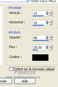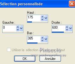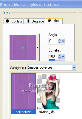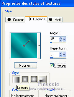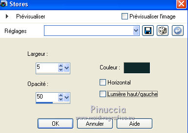 Ce tutoriel a été traduit avec CorelX, mais il peut également être exécuté avec les autres versions. Suivant la version utilisée, vous pouvez obtenir des résultats différents. Depuis la version X4, la fonction Image>Miroir a été remplacée par Image>Renverser horizontalement, et Image>Renverser avec Image>Renverser verticalement. Dans les versions X5 et X6, les fonctions ont été améliorées par la mise à disposition du menu Objets. Dans la nouvelle version X7, nous avons à nouveau Miroir/Renverser, mais avec autres différences. Voir plus les détails à ce sujet ici Certaines dénominations ont changées entre les versions de PSP. Les plus frequentes dénominations utilisées: ![]() Traduction en italien ici Vos versions iciNécessaire pour réaliser ce tutoriel: Matériel qui Pour le tube merci Karine. (les liens des sites des tubeuses ici) Modules Externes consulter, si nécessaire, ma section de filtre ici Alien Skin Eye Candy 5 Impact - Glass ici ![]() Si vous voulez utiliser vos propres couleurs, n'hésitez pas à changer le mode et l'opacité des calques 1. Ouvrir une nouvelle image transparente 600 x 600 pixels. ![]() 2. Choisir deux couleurs du tube. Mes couleur: avant plan #006b75, arrière plan #09bdba. ![]() 3. Préparer en avant plan un dégradé de premier plan/arrière plan/style Linéaire. ![]() 4. Ouvrir le motif patroonMB dans PSP et le minimiser. Place en arrière plan Motif et sélectionner le motif avec ces réglages. ![]() 5. Remplir l'image transparente avec le motif d'arrière plan.Si vous utilisez des autres couleurs, comme dans ce cas, notes les valeurs de Tonalité et Saturation de votre couleur. ![]() Réglage>Tonalité et Saturation>Colorisé et Regola>Tonalità e saturazione>Viraggio et placer lesa valeurs notées dans les respectives cases. J'ai réduire légèrement la saturation ![]() 6. Activer l'outil Sélection ![]() (peu importe le type de sélection, parce que avec la sélection personnalisée vous obtenez toujours un rectangle), cliquer sur Sélection personnalisée ![]() et setter ces paramètres. ![]() 7. Calques>Nouveau calque raster. Placer en arrière plan la Couleur. Remplir le calque avec la couleur claire d'arrière plan.8. Sélections>Modifier>Contracter - 4 pixels. Remplir la sélection du dégradé.Sélections>Désélectionner tout. 9. Effets>Effets 3D>Ombre portée, couleur noire. ![]() 10. Calques>Nouveau calque raster. Sélection personnalisée ![]() ![]() 11. Remplir le calque avec la couleur claire d'arrière plan.Sélections>Modifier>Contracter - 4 pixels. Remplir la sélection du dégradé.Sélections>Désélectionner tout. 12. Effets>Effets 3D>Ombre portée, comme précédemment. ![]() 13. Effets>Effets de distorsion>Miroir déformant. ![]() Déplacer ce calque en haut, contre le bord.![]() 14. Effets>Effets de textures>Stores - couleur noire. ![]() 15. Effets>Effets 3D>Ombre portée, comme précédemment. ![]() 16. Calques>Dupliquer. Image>Renverser. Image>Miroir. 17. Ouvrir le tube rondje Mb - Édition>Copier. Revenir sur votre travail et Édition>Coller comme nouveau calque. Déplacer le tube un peu plus à droite.Si nécessaire, coloriser. 18. Ouvrir le tube k@rine_ dreams _Pretty_Woman_1469_Fevrier_2011 - Édition>Copier. Revenir sur votre travail et Édition>Coller comme nouveau calque. Image>Redimensionner, 2 fois to 80%, redimensionner tous les calques décoché. Déplacer le tube à gauche.19. Effets>Effets 3D>Ombre portée, couleur noire. ![]() Répéter Ombre portée, vertical et horizontal -10. 20. Ouvrir le tube bloem Mb2 - Édition>Copier. Revenir sur votre travail et Édition>Coller comme nouveau calque. Coloriser. 21. Calques>Dupliquer - 2 fois, et positionner les fleurs à votre goût, ou voir mon exemple.![]() 21. Activer l'outil Sélection , rectangle.Calques>Nouveau calque raster. Dessinez des rectangles de différentes tailler à votre goût. ![]() Correspondance sur Aucun ![]() et avec un seule clic remplir les sélections du dégradé.Sélections>Désélectionner tout. 22. Effets>Modules Externes>Alien Skin Eye Candy 5 Impact - Glass. Sélectionner le preset Clear et ok. ![]() Réduire l'opacité de ce calque à 75%. 23. Image>Ajouter des bordures, 4 pixels, symétrique, couleur claire d'arrière plan. 24. Signer votre travail sur un nouveau calque. Enregistrer en jpg. Version avec tube de Luz Cristina ![]() ![]() Si vous avez des problèmes, ou des doutes, ou vous trouvez un link modifié, ou seulement pour me dire que ce tutoriel vous a plu, vous pouvez m'écrire. 16 Juin 2020 |