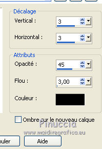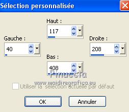 Ce tutoriel a été traduit avec CorelX, mais il peut également être exécuté avec les autres versions. Suivant la version utilisée, vous pouvez obtenir des résultats différents. Depuis la version X4, la fonction Image>Miroir a été remplacée par Image>Renverser horizontalement, et Image>Renverser avec Image>Renverser verticalement. Dans les versions X5 et X6, les fonctions ont été améliorées par la mise à disposition du menu Objets. Dans la nouvelle version X7, nous avons à nouveau Miroir/Renverser, mais avec autres différences. Voir plus les détails à ce sujet ici Certaines dénominations ont changées entre les versions de PSP. Les plus frequentes dénominations utilisées: ![]() Traduction en italien ici Vos versions iciNécessaire pour réaliser ce tutoriel: Un tube à choix. Le reste du matériel qui (les liens des sites des tubeuses ici) ![]() Si vous voulez utiliser vos propres couleurs, n'hésitez pas à changer le mode et l'opacité des calques 1. Ouvrir une nouvelle image 640 x 480 arrière plan blanc ![]() 2. Placer en avant plan la couleur #ffffff, et en arrière plan la couleur #000000. ![]() 3. Ouvrir le tube cirkeltjes - Édition>Copier. Revenir sur votre travail et Édition>Coller comme nouveau calque. 4. Ouvrir rand z-w - Édition>Copier. Revenir sur votre travail et Édition>Coller comme nouveau calque. Déplacer l'image un peu plus en bas.Ou Effets>Effets d'image>Décalage ![]() 5. Activer l'outil Sélection ![]() (peu importe le type de sélection, parce que avec la sélection personnalisée vous obtenez toujours un rectangle), cliquer sur Sélection personnalisée ![]() et setter ces paramètres. ![]() Calques>Nouveau calque raster. Remplir la sélection avec la couleur blanche.6. Sélections>Modifier>Contracter - 1 pixel. Remplir avec la couleur noire.Sélections>Modifier>Contracter - 1 pixels. Remplir avec la couleur blanche.Sélections>Désélectionner tout. 7. Effets>Effets 3D>Ombre portée, couleur noire. ![]() Répéter Ombre portée, vertical et horizontal -3. 8. Ouvrir le tube sierrondje - Édition>Copier. Revenir sur votre travail et Édition>Coller comme nouveau calque. Déplacer le tube dans le cadre en haut.![]() 9. Calques>Dupliquer. Image>Renverser. Déplacer cette image un peu plus en bas.(Pour un déplacement linéaire, utiliser la flèche du clavier). 10. Ouvrir le tube de la femme (j'ai utilisé un tube de Terry et je l'ai ajouté dans le matériel). Édition>Copier. Revenir sur votre travail et Édition>Coller comme nouveau calque. Image>Redimensionner, si nécessaire (pour mon tube 2 fois à 90%), redimensionner tous les calques décoché Positionner bien le tube.11. Effets>Effets 3D>Ombre portée, couleur noire. ![]() 12. Image>Ajouter des bordures, 1 pixel, symétrique, couleur noire. Image>Ajouter des bordures, 20 pixels, symétrique, couleur blanche. Image>Ajouter des bordures, 1 pixel, symétrique, couleur noire. 13. Activer l'outil Sélection cercle,et tracer sur le bord un petit cercle. ![]() Livelli>Nuovo livello raster. Remplir la sélection avec la couleur noire.14. Sélections>Modifier>Contracter - 1 pixel. Presser CANC sur le clavier ![]() Sélections>Désélectionner tout. Réduire l'opacité de ce calque à 32%. 15. Vous positionner sur le calque d'arrière plan. Activer l'outil Baguette magique ![]() et cliquer sur le bord blanc pour le sélectionner. Vous positionner sur le calque du haut du petit cercle. Effecs>Modules Externes>Mura's Meister - Copies - Duplicate et Random et jouer avec les réglages à votre goût. Pour moi. ![]() Sélections>Désélectionner tout. 15. Signer votre travail sur un nouveau calque. Calques>Fusionner>Tous et enregistrer en jpg. Le tube de cette version est de Anna.br. ![]() ![]() Si vous avez des problèmes, ou des doutes, ou vous trouvez un link modifié, ou seulement pour me dire que ce tutoriel vous a plu, vous pouvez m'écrire. 16 Juin 2020 |