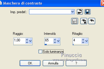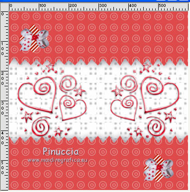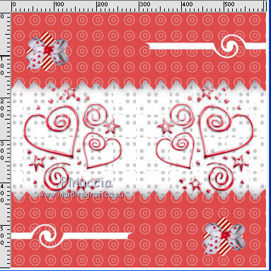 qui puoi trovare qualche risposta ai tuoi dubbi. Se l'argomento che ti interessa non è presente, ti prego di segnalarmelo. Per tradurre il tutorial ho usato Corel X, ma può essere eseguito con ogni versione di PSP. Dalla versione X4, il comando Immagine>Rifletti è stato sostituito con Immagine>Capovolgi in orizzontale, e il comando Immagine>Capovolgi con Immagine>Capovolgi in verticale. Nelle versioni X5 e X6, le funzioni sono state migliorate rendendo disponibile il menu Oggetti. Con la nuova versione X7, sono tornati Rifletti/Capovolgi, ma con nuove differenze Vedi la scheda sull'argomento qui traduzione in francese qui Le vostre versioni quiOccorrente: Materiale qui (in questa pagina trovi i links ai siti dei creatori di tubes) ![]() se stai usando altri colori, sperimenta le modalità di miscelatura e opacità più adatte ai tuoi colori 1. Apri una nuova immagine trasparente 600 x 600 pixels. ![]() 2. Apri Achtergrond 1 e vai a Modifica>Copia. Torna al tuo lavoro e vai a Modifica>Incolla come nuovo livello. 3. Apri il tube rand 1 e vai a Modifica>Copia. Torna al tuo lavoro e vai a Modifica>Incolla come nuovo livello. Spostalo in alto contro il bordo.4. Livelli>Duplica. Immagine>Capovolgi. 5. Apri il tube Hartje e vai a Modifica>Copia. Torna al tuo lavoro e vai a Modifica>Incolla come nuovo livello. Spostalo a destra.6. Livelli>Duplica. Immagine>Rifletti. ![]() 7. Apri il tube hoekje e vai a Modifica>Copia. Torna al tuo lavoro e vai a Modifica>Incolla come nuovo livello. Spostalo in basso a destra.8. Apri il tube strikje e vai a Modifica>Copia. Torna al tuo lavoro e vai a Modifica>Incolla come nuovo livello. Spostalo sopra il tube precedente.![]() 9. Livelli>Unisci>Unisci giù. 10. Livelli>Duplica. Sposta l'immagine in alto a sinistra.![]() 11. Apri il tube sierstrip e vai a Modifica>Copia. Torna al tuo lavoro e vai a Modifica>Incolla come nuovo livello. Spostalo in basso a sinistra.12. Livelli>Duplica. Immagine>Rifletti. Sposta il tube in alto a destra.![]() 13. Apri il tube della donna e vai a Modifica>Copia. Torna al tuo lavoro e vai a Modifica>Incolla come nuovo livello. 14. Imposta il colore di primo piano con un colore chiaro, io ho scelto il colore grigio #c0c0c0. Attiva il livello inferiore, ancora trasparente. ![]() Riempi il livello con il colore di primo piano.se stai usando altri colori, adatta la scelta ai tuoi colori, ma sempre con un colore chiaro 15. Livelli>Unisci>Unisci tutto. 16. Immagine>Aggiungi bordatura, 2 pixels, simmetriche, colore rosso. 18. Regola>Messa a fuoco>Maschera di contrasto (o Regola>Messa a fuoco>Metti a fuoco) ![]() 29. Firma il tuo lavoro su un nuovo livello. Versione con tube di Malkoffee ![]() ![]() Se hai problemi o dubbi, o trovi un link non funzionante, o anche soltanto per un saluto, scrivimi. 16 Giugno 2020 |