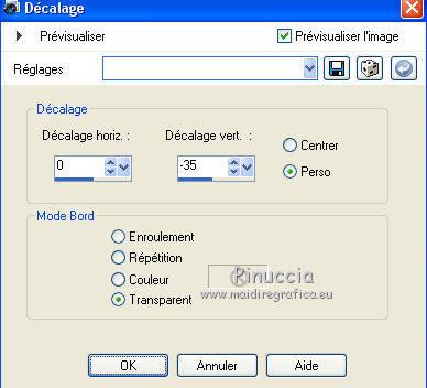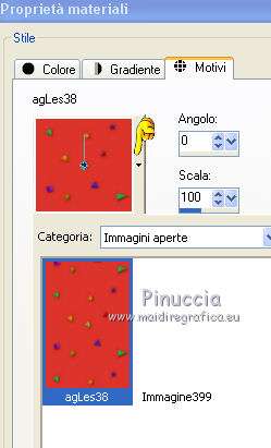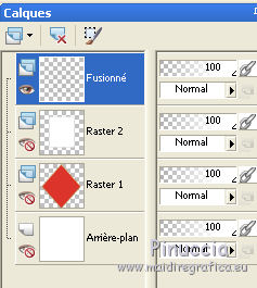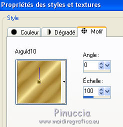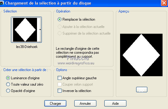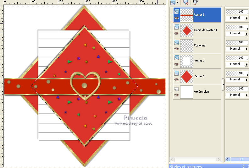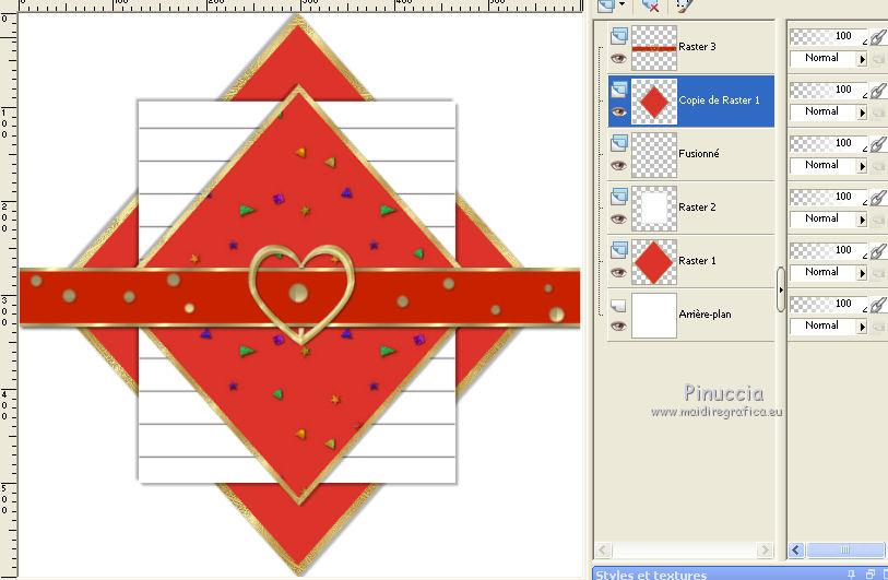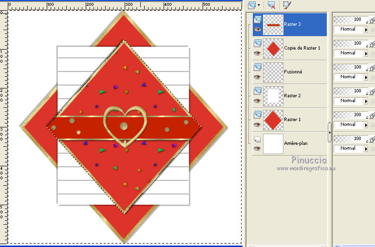 Ce tutoriel a été traduit avec CorelX, mais il peut également être exécuté avec les autres versions. Suivant la version utilisée, vous pouvez obtenir des résultats différents. Depuis la version X4, la fonction Image>Miroir a été remplacée par Image>Renverser horizontalement, et Image>Renverser avec Image>Renverser verticalement. Dans les versions X5 et X6, les fonctions ont été améliorées par la mise à disposition du menu Objets. Dans la nouvelle version X7, nous avons à nouveau Miroir/Renverser, mais avec autres différences. Voir plus les détails à ce sujet ici Certaines dénominations ont changées entre les versions de PSP. Les plus frequentes dénominations utilisées: ![]() Traduction en italien ici Vos versions iciNécessaire pour réaliser ce tutoriel: Matériel qui (les liens des sites des tubeuses ici) ![]() Si vous voulez utiliser vos propres couleurs, n'hésitez pas à changer le mode et l'opacité des calques Placer la sélection dans le dossier Sélections. 1. Ouvrir une nouvelle 600 x 600 arrière plan blanc. ![]() 2. Placer en avant plan la couleur blanche, et en arrière plan une couleur du tube; pour moi #dc342b. ![]() 3. Placer en avant plan Motif et choisir un motif or, avec ces réglages. ![]() 4. Calques>Nouveau calque raster. Sélections>Charger/Enregistrer une sélection>Charger à partir du disque. Chercher et charger la sélection Les 28 Driehoek. ![]() Remplir la sélection avec le motif or.5. Sélections>Modifier>Contracter - 8 pixels. Attention: correspondance de l'outil Pot de peinture sur Aucun ![]() Remplir la sélection avec la couleur rouge d'arrière plan.Sélections>Désélectionner tout. 6. Effets>Effets 3D>Ombre portée, couleur noire. ![]() Répéter Ombre portée, vertical et horizontal -3. 7. Calques>Nouveau calque raster. Activer l'outil Sélection ![]() (peu importe le type de sélection, parce que avec la sélection personnalisée vous obtenez toujours un rectangle), cliquer sur Sélection personnalisée ![]() et setter ces paramètres. ![]() Placer en avant plan la Couleur. Remplir la sélection avec la couleur blanche.Sélections>Désélectionner tout. 8. Effets>Effets 3D>Ombre portée, répéter les réglages en mémoire. ![]() Répéter Ombre portée, horizontal et vertical 3. ![]() 9. Activer l'outil Stylo , créer sur vector,Style de ligne +Plein, largeur 2 pixels ![]() 10. Placer en avant plan la couleur #808080. Tenir enfoncée la touche shift, pour obtenir une ligne parfaitement droite, et tracer une ligne de gauche à droite ![]() Calques>Convertir en calque raster. 11. Calques>Dupliquer. Activer l'outil Déplacement ![]() (c'est importante, autrement les flèches ne fonctionnent pas) et cliquer 35 fois la flèche ver le bas du clavier. ![]() Ou bien, plus rapidement: Effets>Effets d'image>Décalage. ![]() 12. Répéter l'étape 11 (Dupliquer et Décalage) encore 9 fois, pour remplir le cadre blanc avec les lignes. ![]() 13. Fermer les trois calques du bas de la pile. Calques>Fusionner>Calques visibles et les lignes seront sur un seule calque. ![]() Re-ouvrir le calque du bas de la pile et rester positionné sur le calque Fusionné. Activer l'outil Déplacement ![]() et cliquer 7 fois la flèche vers le haut du clavier, et la première et la dernière ligne auront la même distance des bords. ![]() 14. Vous positionner sur le calque Raster 1 (le calque avec le rectangle rouge). Calques>Dupliquer. Calques>Agencer>Placer en haut de la pile. 15. Activer l'outil Baguette magique , sfumatura e tolleranza 0,et cliquer dans la figure pour la sélectionner. ![]() 16. Ouvrir l'image ag.grond les 38 et la minimiser. Placer en avant plan Motif et sélectionner l'image avec ces réglages. ![]() Remplir la sélection avec le motif d'avant plan.Sélections>Désélectionner tout. 17. Image>Redimensionner, à 75%, redimensionner tous les calques décoché. 18. Ouvrir le tube Riem - Édition>Copier. Revenir sur votre travail et Édition>Coller comme nouveau calque. 19. Vous positionner sur le calque Copie de Raster 1. ![]() 20. Sélections>Sélectionner tout. Sélections>Flottante. Sélectins>Statique. Sélections>Inverser. 21. Vous positionner sur le calque de dessus du tube ![]() Presser CANC sur le clavier ![]() ![]() Sélections>Désélectionner tout. 27. Ouvrir le tube paperclip - Édition>Copier. Revenir sur votre travail et Édition>Coller comme nouveau calque. Déplacer le tube en haut à droite sur la zone blanche.Si nécessaire, activer l'outil Sélection au lasso , point à point,pour effacer les parties que vous voulez effacer. 28. Ouvrir le tube Steentje - Édition>Copier. Revenir sur votre travail et Édition>Coller comme nouveau calque. Calques>Dupliquer 3 fois, et positionner les éléments sur les angles.![]() 30. Ouvrir le tube Hartjes-1 - Édition>Copier. Revenir sur votre travail et Édition>Coller comme nouveau calque. Déplacer le tube sur la zone blanche,dans le coin en haut à gauche. 31. Ouvrir le tube vlindertje - Édition>Copier. Revenir sur votre travail et Édition>Coller comme nouveau calque. Ne pas déplacer; il est déjà au centre du coeur. 32. Ouvrir le tube Parfum - Édition>Copier. Revenir sur votre travail et Édition>Coller comme nouveau calque. Déplacer le tube dans le coin en bas à droite.![]() 33. Effets>Effets 3D>Ombre portée, couleur noire. ![]() 34. Ouvrir le tube dame Loly - Édition>Copier. Revenir sur votre travail et Édition>Coller comme nouveau calque. Déplacer le tube en bas à gauche.35. Effets>Effets 3D>Ombre portée, couleur noire. ![]() Si vous voulez ajouter des autres tubes, continuer. Au contraire, contrôler que tout soit à sa place et Calques>Fusionner>Tous. 36. Image>Ajouter des bordures, 1 pixel, symétrique, couleur noire. 37. Signer votre travail sur un nouveau calque. Enregistrer en jpg. Version avec tubes de Malkoffee et Sassy ![]() ![]() Si vous avez des problèmes, ou des doutes, ou vous trouvez un link modifié, ou seulement pour me dire que ce tutoriel vous 