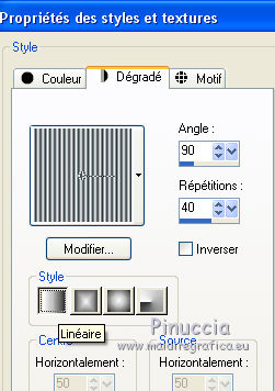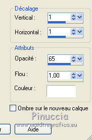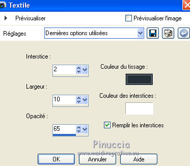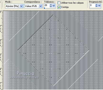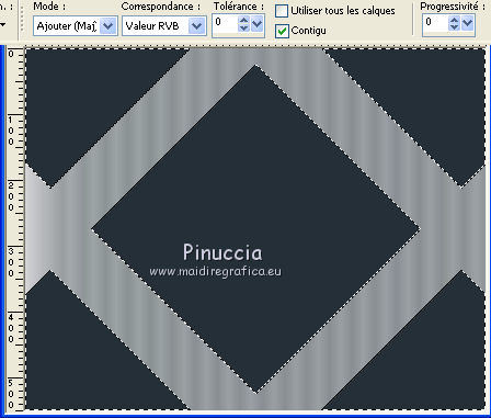 Pour traduire ce tutoriel j'ai utilisé Corel X2, mais il peut également être exécuté avec les autres versions. Suivant la version utilisée, vous pouvez obtenir des résultats différents. Depuis la version X4, la fonction Image>Miroir a été remplacée par Image>Renverser horizontalement, et Image>Renverser avec Image>Renverser verticalement. Dans les versions X5 et X6, les fonctions ont été améliorées par la mise à disposition du menu Objets. Dans la nouvelle version X7, nous avons à nouveau Miroir/Renverser, mais avec autres différences. Voir plus les détails à ce sujet ici Certaines dénominations ont changées entre les versions de PSP. Les plus frequentes dénominations utilisées: ![]() Traduction en italien ici Vos versions ici Nécessaire pour réaliser ce tutoriel: Matériel qui Modules Externes consulter, si nécessaire, ma section de filtre ici Filters Unlimited 2.0 ici Simple ici ECWS - Tile Maker ici AAA Frames - Foto Frame ici Filtres Simple et ECWS peuvent être utilisés seuls ou importés dans Filters Unlimited. voir comment le faire ici). Si un filtre est fourni avec cette icône, ![]() Si vous voulez utiliser vos propres couleurs, n'hésitez pas à changer le mode et l'opacité des calques 1. Placer en avant plan la couleur #ffffff, et en arrière plan la couleur #243037. ![]() Préparer un Dégradé de premier plan/arrière plan, style Linéaire. ![]() 2. Ouvrir une nouvelle image transparente 700 x 550 pixels Remplir l'image du dégradé.3. Effets>Effets de distorsion>Vent - vers la droite, intensité 100. ![]() Répéter l'Effet Vent, cette fois vers la gauche. ![]() 4. Calques>Nouveau calque raster. Remplir avec la couleur foncée d'arrière plan.5. Image>Redimensionner, 80%, redimensionner tous les calques décoché. 6. Effets>Modules Externes>Simple - Diamonds. 7. Activer l'outil Baguette magique tolérance et progressivité 0,et cliquer sur les parties foncées pour les sélectionner. ![]() 8. Effets>Effets de textures>Textile. Couleur du tissage #243038; couleur des interstices #ffffff. ![]() Sélections>Désélectionner tout. 9. Effets>Effets 3D>Ombre portée, couleur blanche. ![]() Répéter Ombre portée, mais vertical et horizontal -1. 10. Placer le calque en mode Éclaircir davantage. 11. Activer l'outil Baguette magique , tolérance 20, progressivité 0,et cliquer sur la forme centrale pour la sélectionner, si nécessaire plusieures fois pour la sélectionner mieux. ![]() 12. Calques>Nouveau calque raster. Remplir avec la couleur d'arrière plan.Réduire l'opacité de ce calque à 50%. Sélections>Désélectionner tout. 13. Activer le tube SS_915_Misted, Édition>Copier. Revenir sur votre travail et Édition>Coller comme nouveau calque. Placer le calque en mode Luminance (héritée). 14. Activer le tube 3-deco-ster, Édition>Copier. Revenir sur votre travail et Édition>Coller comme nouveau calque. Déplacer en haut à gauche, au centre de la forme.![]() 15. Effets>Modules Externes>Simple - Top Left Mirror. 16. Activer le tube deco-4, Édition>Copier. Revenir sur votre travail et Édition>Coller comme nouveau calque. 17. Activer le tube Vogel, Édition>Copier. Revenir sur votre travail et Édition>Coller comme nouveau calque. Image>Miroir. Image>Redimensionner, 2 fois à 80%, redimensionner tous les calques décoché. Déplacer en bas à droite.18. Effets>Effets 3D>Ombre portée, couleur noire. ![]() 19. Calques>Dupliquer. Image>Miroir. Image>Redimensionner, à 80%, redimensionner tous les calques décoché. Déplacer ce tube contre l'original.20. Activer le tube tube "Image", Édition>Copier. Revenir sur votre travail et Édition>Coller comme nouveau calque. Déplacer le tube dans le coin en bas à gauche.![]() 21. Effets>Effets 3D>Ombre portée, couleur noire. ![]() 22. Activer le tube MB06_AB, Édition>Copier. Revenir sur votre travail et Édition>Coller comme nouveau calque. Image>Redimensionner, 3 fois à 80%, redimensionner tous les calques décoché. Image>Miroir. 23. Effets>Effets 3D>Ombre portée, couleur noire. ![]() Placer le calque en mode Luminance (héritée). Positionner bien le tube - voir mon exemple.24. Calques>Dupliquer. Image>Miroir. Image>Redimensionner, 80%, redimensionner tous les calques décoché. Positionner à votre convenance, ou voir mon exemple.![]() 25. Image>Ajouter des bordures, 1 pixel, symétrique, couleur foncée. Image>Ajouter des bordures, 40 pixels, symétrique, couleur blanche. 26. Sélectionner le bord blanc avec la baguette magique ![]() Effets>Modules Externes>Filters Unlimited 2.0 - ECWS - Tile Maker1.0 ![]() Sélections>Désélectionner tout. 27. Effets>Modules Externes>AAA Frames - Foto Frame. ![]() 28. À nouveau Effets>Modules Externes>AAA Frames - Foto Frame. ![]() 29. Signer votre travail sur un nouveau calque. Enregistrer en jpg. ![]() Si vous avez des problèmes, ou des doutes, ou vous trouvez un link modifié, ou seulement pour me dire que ce tutoriel vous a plu, vous pouvez m'écrire. Mon mail est dans le menu en haut de la page. 20 Juin 2015 |