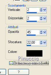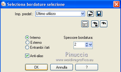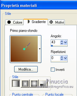 qui puoi trovare qualche risposta ai tuoi dubbi. Se l'argomento che ti interessa non è presente, ti prego di segnalarmelo. Per tradurre questo tutorial ho usato Corel X, ma può essere eseguito con ogni versione di PSP. Dalla versione X4, il comando Immagine>Rifletti è stato sostituito con Immagine>Capovolgi in orizzontale, e il comando Immagine>Capovolgi con Immagine>Capovolgi in verticale. Nelle versioni X5 e X6, le funzioni sono state migliorate rendendo disponibile il menu Oggetti. Con la nuova versione X7, sono tornati Rifletti/Capovolgi, ma con nuove differenze Vedi la scheda sull'argomento qui traduction en français qui Le vostre versioni qui Occorrente: Materiale qui Per i tubes grazie JB e Anna.br. Filtri in caso di dubbi, ricorda di consultare la mia sezione filtri qui Filters Unlimited 2.0 qui Simple qui L&K's - L&K's Palmyre qui I filtri Simple si possono usare da soli o importati in Filters Unlimited (come fare vedi qui) Se un filtro fornito appare con questa icona Secondo il sistema operativo, la versione di PSP e anche la versione di Unlimited che stai usando (circola in rete una versione che non si installa, ma è composta da files in formato 8bf), potresti ottenere dei risultati differenti. ![]() se stai usando altri colori, sperimenta le modalità di miscelatura e opacità più adatte ai tuoi colori Metti la selezione nella cartella Selezioni. 1. Imposta il colore di primo piano con #6f2900, e il colore di sfondo con #c3b67f. ![]() Passa il colore di primo piano a Gradiente di primo piano/sfondo, stile Lineare. ![]() 2. Apri una nuova immagine trasparente 800 x 600 pixels, e riempila con il gradiente.3. Livelli>Nuovo livello raster. Selezione>Seleziona tutto. Apri l'immagine 14887172 jpg, e vai a Modifica>Copia. Torna al tuo lavoro e vai a Modifica>Incolla nella selezione. 4. Cambia la modalità di miscelatura di questo livello in Luce diffusa, e abbassa l'opacità al 50%. Selezione>Deseleziona. 5. Livelli>Unisci>Unisci giù. Su questo livello: Selezione>Carica/Salva selezione>Carica selezione da disco. Cerca e carica la selezione MB-les-104. ![]() Riempi con il colore chiaro di sfondo.6. Selezione>Modifica>Contrai - 2 pixels. Riempi con il gradiente.Selezione>Deseleziona. 7. Livelli>Duplica. Immagine>Ridimensiona, all'80%, tutti i livelli non selezionato. 8. Selezione>Seleziona tutto. Selezione>Mobile. Selezione>Immobilizza. 9. Selezione>Modifica>Seleziona bordature selezione. ![]() Riempi con il colore chiaro di sfondo.Selezione>Deseleziona. 10. Livelli>Duplica. Effetti>Plugins>Simple - Diamonds. 11. Livelli>Disponi>Sposta giù. ![]() 12. Attiva il livello superiore. 13. Immagine>Ridimensiona, all'80%, tutti i livelli non selezionato. 14. Livelli>Duplica. Effetti>Plugins>Simple - Half Wrap. 15. Immagine>Ridimensiona, al 130%, tutti i livelli non selezionato. Sui tre livelli superiori ![]() Effetti>Effetti 3D>Sfalsa ombra, colore nero. ![]() 16. Livelli>Unisci>Unisci tutto. 17. Apri il tube anna.br_charme_27-10-10, e vai a Modifica>Copia. non chiuderlo perchè ti servirà ancora Torna al tuo lavoro e vai a Modifica>Incolla come nuovo livello. 18. Immagine>Ridimensiona, 3 volte all'80%, tutti i livelli non selezionato. Regola>Messa a fuoco>Metti a fuoco. Spostalo a destra.Abbassa l'opacità di questo livello intorno al 50%. 19. Apri il tube anna.br_danse_16-09-10 e vai a Modifica>Copia. Torna al tuo lavoro e vai a Modifica>Incolla come nuovo livello. 20. Immagine>Ridimensiona, 4 volte all'80%, tutti i livelli non selezionato. Spostalo a destra.Livelli>Duplica. Immagine>Rifletti. Sposta questo tube a sinistra.Abbassa l'opacità di questo livello intorno al 50%. ![]() Attiva il livello originale. Regola>Messa a fuoco>Metti a fuoco. Effetti>Effetti 3D>Sfalsa ombra, colore nero. ![]() 21. Attiva nuovamente il livello superiore. Apri il tube anna.br_sexy_12-09-10, e vai a Modifica>Copia. Torna al tuo lavoro e vai a Modifica>Incolla come nuovo livello. 22. Immagine>Ridimensiona, 4 volte all'80%, tutti i livelli non selezionato. Regola>Messa a fuoco>Metti a fuoco. Abbassa l'opacità di questo livello intorno al 50%. 23. Apri il tube JB_bw_shoe_butterfly, e vai a Modifica>Copia. Torna al tuo lavoro e vai a Modifica>Incolla come nuovo livello. Immagine>Ridimensiona, all'80%, tutti i livelli non selezionato. 24. Effetti>Effetti 3D>Sfalsa ombra, colore nero. ![]() 25. Apri il tube JB_bw_shoe_hibiscus, e vai a Modifica>Copia. Torna al tuo lavoro e vai a Modifica>Incolla come nuovo livello. Immagine>Ridimensiona, all'80%, tutti i livelli non selezionato. Effetti>Effetti 3D>Sfalsa ombra, con i settaggi precedenti. 26. Apri il tube JB_shoe_clock, e vai a Modifica>Copia. Torna al tuo lavoro e vai a Modifica>Incolla come nuovo livello. Effetti>Effetti 3D>Sfalsa ombra, con i settaggi precedenti. 27. Apri il tube JB_High-Heel_Shoe©Prada, e vai a Modifica>Copia. Torna al tuo lavoro e vai a Modifica>Incolla come nuovo livello. Effetti>Effetti 3D>Sfalsa ombra, con i settaggi precedenti. 28. Apri il tube JER_The-Purrfect-Fit-I-Marilyn-Robertson-392037, e vai a Modifica>Copia. Torna al tuo lavoro e vai a Modifica>Incolla come nuovo livello. Effetti>Effetti 3D>Sfalsa ombra, con i settaggi precedenti. 29. Apri il tube JB_dolce_and_gabbana, e vai a Modifica>Copia. Torna al tuo lavoro e vai a Modifica>Incolla come nuovo livello. Effetti>Effetti 3D>Sfalsa ombra, con i settaggi precedenti. Posiziona le scarpe come preferisci,o vedi il mio esempio. ![]() 30. Attiva nuovamente il tube anna.br_charme_27-10-10, e vai a Modifica>Copia. Torna al tuo lavoro e vai a Modifica>Incolla come nuovo livello. Immagine>Ridimensiona, 4 volte all'80%, tutti i livelli non selezionato. Immagine>Rifletti. Regola>Messa a fuoco>Metti a fuoco. Spostalo a sinistra.Effetti>Effetti 3D>Sfalsa ombra, colore nero. ![]() 31. Apri il tube bloempje, e vai a Modifica>Copia. Torna al tuo lavoro e vai a Modifica>Incolla come nuovo livello. Livelli>Duplica - 2 volte, e posiziona i fiori a tuo piacimento, o vedi il mio esempio.![]()