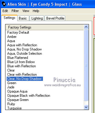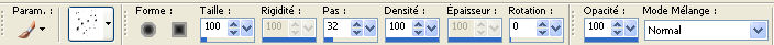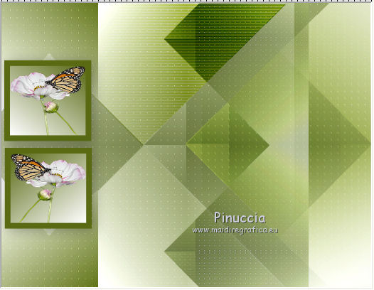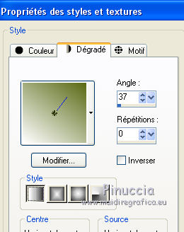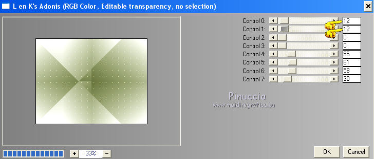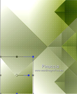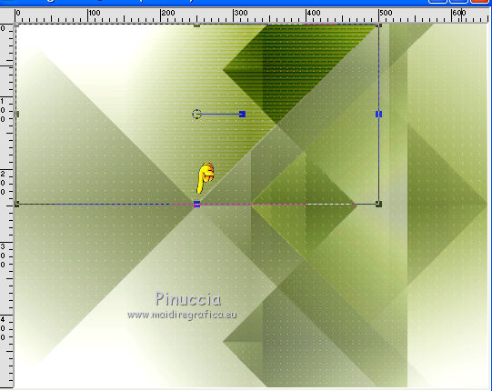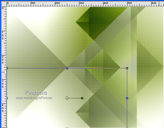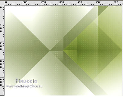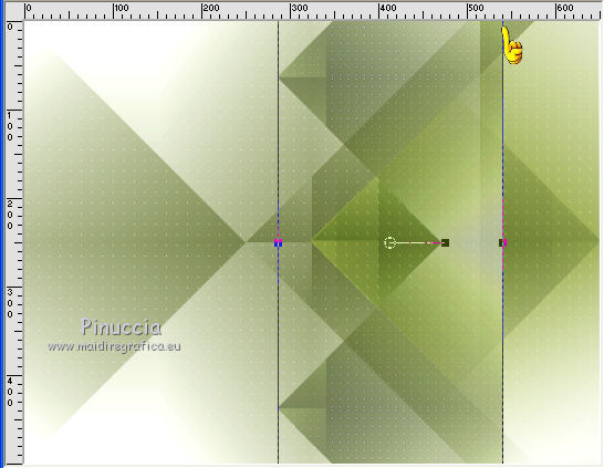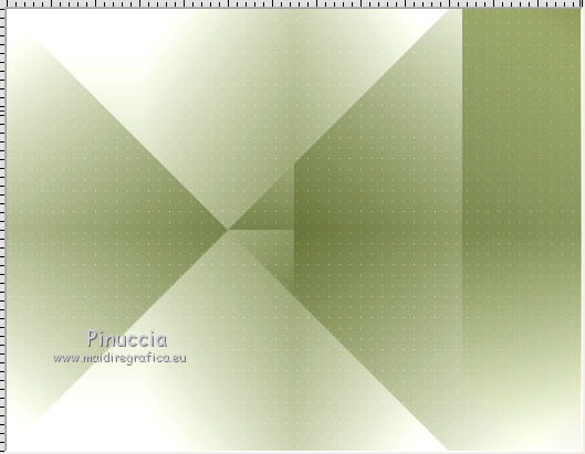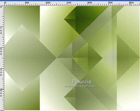 Pour traduire ce tutoriel j'ai utilisé Corel X2, mais il peut également être exécuté avec les autres versions. Suivant la version utilisée, vous pouves obtenir des résultats différents. Depuis la version X4, la fonction Image>Miroir a été remplacée par Image>Renverser horizontalement, et Image>Renverser avec Image>Renverser verticalement. Dans les versions X5 et X6, les fonctions ont été améliorées par la mise à disposition du menu Objets. Dans la nouvelle version X7, nous avons à nouveau Miroir/Renverser, mais avec autres différences. Voir plus les détails à ce sujet ici Certaines dénominations ont changées entre les versions de PSP. Les plus frequentes dénominations utilisées: ![]() Traduction en italien ici Vos versions ici Nécessaire pour réaliser ce tutoriel: Matériel qui Modules Externes consulter, si nécessaire, ma section de filtre ici Filters Unlimited 2.0 ici Simple ici Adjust - Variations qui L&K's - L&K's - Adonis qui Alien Skin Eye Candy 5 Impact - Glass qui Filtres Simple peuvent être utilisés seuls ou importés dans Filters Unlimited. voir comment le faire ici). Si un filtre est fourni avec cette icône, Suivant le s.o., la version de PSP et aussi la version d'Unlimited utilisés (est en circulation une version d'Unlimited qui n'a pas besoin d'installation et est composée de file en format .8bf) vous pourrez obtenir des résultats différents. ![]() Si vous voulez utiliser vos propres couleurs, n'hésitez pas à changer le mode et l'opacité des calques Placer le pinceau dans le dossier Pinceaux. Attention, le pinceau se compose de deux files qui on ne doit séparer. Consulter, si vous voulez, les notes sur les pinceaux ici 1. Placer en avant plan la couleur #ffffff, et en arrière plan la couleur #596a15. ![]() Préparer un dégradé de premier plan/arrière plan, style Linéaire. ![]() 2. Ouvrir une nouvelle image transparente 650 x 500 pixels Remplir l'image du dégradé.3. Calques>Dupliquer. Effets>Modules Externes>Simple - Pizza Slice Mirror. 4. Effets>Modules Externes>Adjust - Variations. Un clic sur Original pour anuler eventuelles précédentes règlages mémorisées par le filtre, 4 clic sur Darker et ok. 5. Effets>Modules Externes>L&K's - L&K's Adonis. ![]() 6. Activer le tube Rand-rechts, Édition>Copier. Revenir sur votre travail et Édition>Coller comme nouveau calque. Déplacer contre le bord à droite.Placer le calque en mode Multiplier, et réduire l'opacité à 72%. ![]() 8. Activer le tube punt-1, Édition>Copier. Revenir sur votre travail et Édition>Coller comme nouveau calque. Déplacer contre le bord à droite.Placer le calque en mode Lumière dure et réduire l'opacité à 78%. 9. Activer le tube Punt 2, Édition>Copier. Revenir sur votre travail et Édition>Coller comme nouveau calque. Placer le calque en mode Multiplier, et réduire l'opacité à 20%. Déplacer avec la pointe contre le bord à droite.![]() 10. Activer le tube Punt3, Édition>Copier. Revenir sur votre travail et Édition>Coller comme nouveau calque. Réduire l'opacité de ce calque à 50%. Déplacer à droite environ à 525/540 pixels,comme ci-dessous. ![]() 11. Activer le tube Punt 6, Édition>Copier. Revenir sur votre travail et Édition>Coller comme nouveau calque. Déplacer en haut à gauche.Placer le calque en mode Assombrir. ![]() 12. Activer le tube punt 7, Édition>Copier. Revenir sur votre travail et Édition>Coller comme nouveau calque. Mode Assombrir, opacité 21. Déplacer en bas à gauche.![]() 13. Activer le tube punt 8, Édition>Copier. Revenir sur votre travail et Édition>Coller comme nouveau calque. Déplacer en bas à gauche.![]() 14. Calques>Dupliquer. Image>Renverser. Le tube est à sa place. ![]() 15. Activer l'outil Sélection ![]() (peu importe le type de sélection, parce que avec la sélection personnalisée vous obtenez toujours un rectangle), cliquer sur Sélection personnalisée ![]() et setter ces paramètres. ![]() 16. Calques>Nouveau calque raster. Remplir avec la couleur foncée.Sélections>Modifier>Contracter - 10 pixels. Presser CANC sur le clavier
