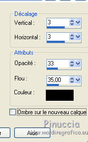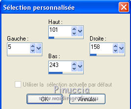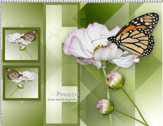Remplir du dégradé.17. Calques>Nouveau calque raster. Activer le tube bloemen-5, Édition>Copier. Revenir sur votre travail et Édition>Coller dans la sélection. Réglage>Netteté>Netteté. Calques>Fusionner>Fusionner le calque de dessous. Sélections>Désélectionner tout. 18. Calques>Dupliquer. Image>Miroir. Déplacer ce cadre sous l'original.![]() 19. Sélection personnalisée ![]() ![]() 20. Calques>Nouveau calque raster. Remplir avec la couleur foncée.Sélections>Modifier>Contracter - 10 pixels. Presser CANC sur le clavier. 21. Remplir du dégradé.Garder sélectionné. 22. Effets>Modules Externes>Simple - Pizza Slice Mirror. Édition>Répéter Pizza Slice Mirror. 23. Effets>Modules Externes>Simple - Zoom out and Flip. 24. Effets>Modules Externes>L&K's - L&K's Adonis, comme précédemment. 25. Réduire l'opacité de ce calque à 75%. Sélections>Désélectionner tout. 26. À nouveau activer le tube bloemen 5, Édition>Copier. Revenir sur votre travail et Édition>Coller comme nouveau calque. Déplacer le tube à droite.27. Activer le tube bloemknop, Édition>Copier. Revenir sur votre travail et Édition>Coller comme nouveau calque. Positionner ce tube comme ci-dessous.![]() 28. Calques>Fusionner>Fusionner le calque de dessous. 29. Effets>Effets 3D>Ombre portée, couleur noire. ![]() Répéter Ombre portée sur les calques des petits cadres. 30. Assurez-vous que tout soit correctement positionné. Lorsque le mouvement est difficile, touche M pour activer l'outil Déplacer ![]() et utilisez les flèches du clavier. ici est expliqué comment utiliser les flèches combinées avec l'outil Déplacer. 31. Image>Ajouter des bordures, 2 pixels, symétrique, couleur foncée. Immagine>Aggiung bordatura, 35 pixels, symétrique, couleur blanche. Image>Ajouter des bordures, 2 pixels, symétrique, couleur foncée. 32. Activer l'outil Baguette magique , tolérance et progressivité 0,et cliquer sur le bord blanc pour le sélectionner. Effets>Modules Externes>Alien Skin Eye Candy 5 Impac - Glass. Sélectionner le preset Clear No drop shadow et ok. ![]() Garder sélectionné. 33. Calques>Nouveau calque raster. Activer l'outil Pinceau ![]() Chercher et sélectionner le pinceau Druppeltjes, taille 100, ![]() appliquer sur le bord, en cliquant plusieurs fois avec la touche droite de la souris, pour utiliser la couleur foncée d'arrière plan. Sélections>Désélectionner tout. 34. Signer votre travail sur un nouveau calque. Calques>Fusionner>Tous et enregistrer en jpg. ![]() Si vous avez des problèmes, ou des doutes, ou vous trouvez un link modifié, ou seulement pour me dire que ce tutoriel vous a plu, vous pouvez m'écrire. 3 Juin 2015 |