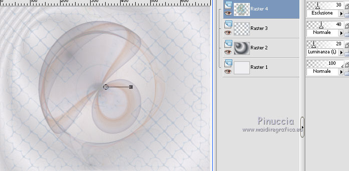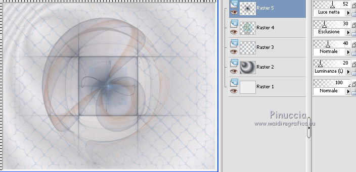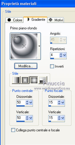 qui puoi trovare qualche risposta ai tuoi dubbi. Se l'argomento che ti interessa non è presente, ti prego di segnalarmelo. Il tutorial può essere eseguito con ogni versione di PSP. Dalla versione X4, il comando Immagine>Rifletti è stato sostituito con Immagine>Capovolgi in orizzontale, e il comando Immagine>Capovolgi con Immagine>Capovolgi in verticale. Nelle versioni X5 e X6, le funzioni sono state migliorate rendendo disponibile il menu Oggetti. Vedi la scheda sull'argomento qui Per tradurre questo tutorial ho usato PSP X. traduction en français qui Le vostre versioni qui Occorrente: Materiale qui I tubes sono di DBK e Gina Filtri: consulta, se necessario, la mia sezione filtri qui FM Tile Tools - Blend Emboss qui ![]() se stai usando altri colori, sperimenta le modalità di miscelatura e opacità più adatte ai tuoi colori 1. Imposta il colore di primo piano con #efedf0, e il colore di sfondo con il colore #454a50. ![]() 2. Apri una nuova immagine trasparente 700 x 550 pixels, e riempila con il colore chiaro di primo piano #efedf0.3. Passa il colore di primo piano a Gradiente di primo piano/sfondo, stile Sprazzo di luce. ![]() 4. Livelli>Nuovo livello raster. Riempi con il gradiente.Cambia la modalità di miscelatura di questo livello in Luminanza (esistente), e abbassa l'opacità al 20%. 5. Effetti>Effetti di bordo>Aumenta di più - 2 volte. 6. Apri il tube ag-hekwerk e vai a Modifica>Copia. Torna al tuo lavoro e vai a Modifica>Incolla come nuovo livello. Abbassa l'opacità di questo livello al 40%. ![]() 7. Effetti>Plugins>FM Tile Tools - Blend Emboss, con i settaggi standard. ![]() 8. Apri Apophysis-100728-3, e vai a Modifica>Copia. Torna al tuo lavoro e vai a Modifica>Incolla come nuovo livello. 9. Premi il tasto K per attivare lo strumento Puntatore ![]() se stai usando PSP 9 il tasto D (valido per tutte le versioni) per attivare lo strumento Deformazione ![]() in modalità Scala, spingi i nodi centrali a destra, sinistra, in alto e in basso ![]() fino ai bordi relativi. ![]() 10. Cambia la modalità di miscelatura di questo livello in Esclusione, e abbassa l'opacità al 30% (o secondo i tuoi colori). ![]() Regola>Messa a fuoco>Metti a fuoco. 11. Apri pueppi-geli167, e vai a Modifica>Copia. Torna al tuo lavoro e vai a Modifica>Incolla come nuovo livello. Cambia la modalità di miscelatura di questo livello in Luce netta, e abbassa l'opacità al 52%. ![]() 12. Apri il tube 100712-107_2, e vai a Modifica>Copia. Torna al tuo lavoro e vai a Modifica>Incolla come nuovo livello. Cambia la modalità di miscelatura di questo livello in Luminanza (esistente) e abbassa l'opacità al 40%. ![]() 13. Apri Rand 12, e vai a Modifica>Copia. Torna al tuo lavoro e vai a Modifica>Incolla come nuovo livello. Spostalo contro il bordo a destra.14. Livelli>Duplica. Immagine>Rifletti. Posiziona correttamente il duplicato.![]() 15. Apri il tube DBK AA Mod-Cel-2762, e vai a Modifica>Copia. Torna al tuo lavoro e vai a Modifica>Incolla come nuovo livello. Immagine>Rifletti. Immagine>Ridimensiona, all'80%, tutti i livelli non selezionato. Modifica>Ripeti Ridimensiona - 5 volte. Sposta il tube a sinistra.16. Effetti>Effetti 3D>Sfalsa ombra, colore nero. ![]() 17. Apri il tube GINATUBES FEMME1586, e vai a Modifica>Copia. Torna al tuo lavoro e vai a Modifica>Incolla come nuovo livello. Immagine>Ridimensiona, all'80%, tutti i livelli non selezionato. Spostalo a destra.18. Effetti>Effetti 3D>Sfalsa ombra, colore nero. ![]() 19. Apri il tube labby@sara e vai a Modifica>Copia. Torna al tuo lavoro e vai a Modifica>Incolla come nuovo livello. Immagine>Ridimensiona, 3 volte all'80%, e una volta al 90%, tutti i livelli non selezionato. Posiziona correttamente il tube.20. Apri Rand 13, e vai a Modifica>Copia. Torna al tuo lavoro e vai a Modifica>Incolla come nuovo livello. Posiziona l'elemento in modo che copra le zampe del cane.![]() 21. Immagine>Aggiungi bordatura, 2 pixels, simmetriche, con il colore scuro. Immagine>Aggiungi bordatura, 25 pixels, simmetriche, con il colore chiaro. 22. Attiva lo strumento Bacchetta magica , sfumatura e tolleranza 0,e clicca nel bordo da 25 pixels per selezionarlo. Livelli>Nuovo livello raster. Riempi con il gradiente.Selezione>Deseleziona. 23. Livelli>Duplica. Immagine>Rifletti. Immagine>Capovolgi. Abbassa l'opacità di questo livello al 50%. 24. Firma il tuo lavoro su un nuovo livello. 25. Livelli>Unisci>Unisci tutto e salva in formato jpg. ![]() Se hai problemi o dubbi, o trovi un link non funzionante, o anche soltanto per un saluto, scrivimi. 3 Giugno 2014 |