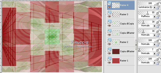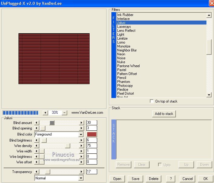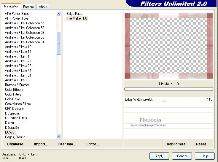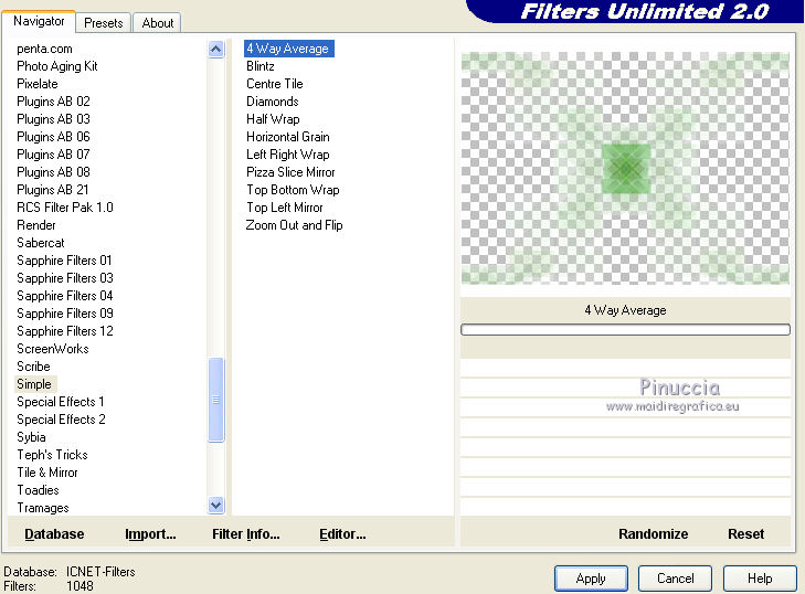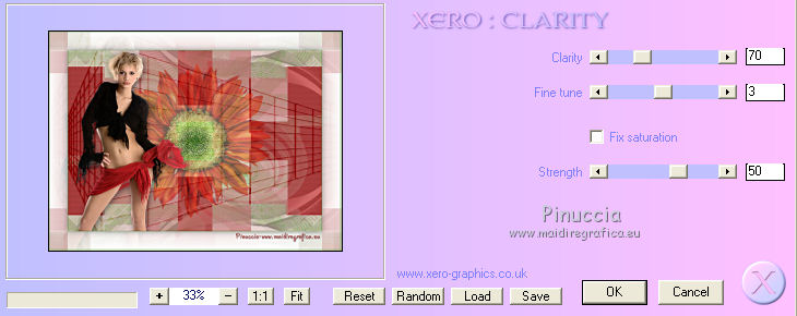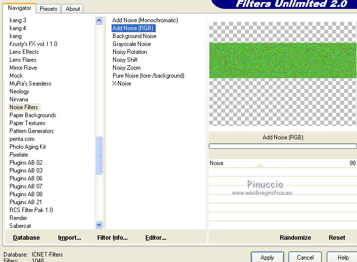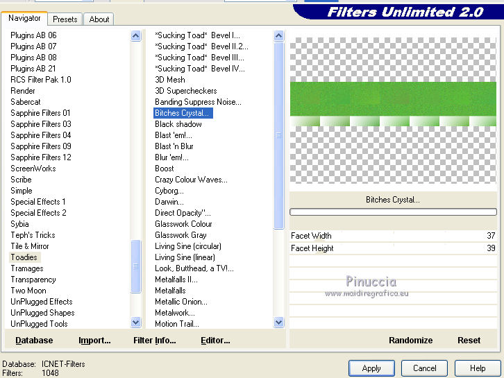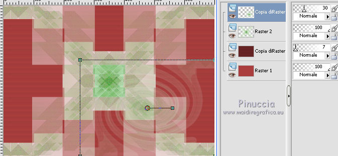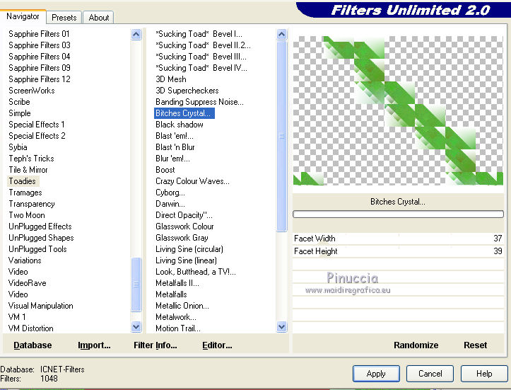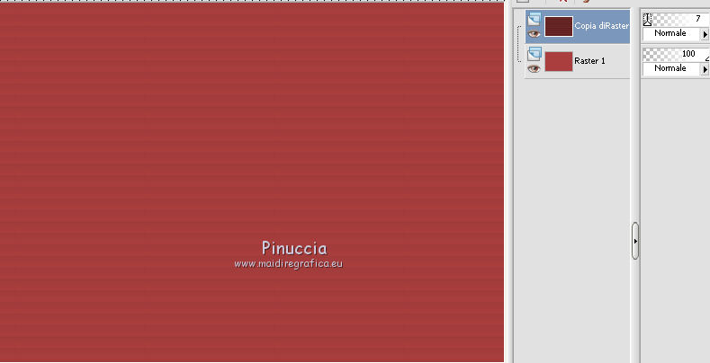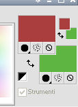 qui puoi trovare qualche risposta ai tuoi dubbi. Se l'argomento che ti interessa non è presente, ti prego di segnalarmelo. Il tutorial può essere eseguito con ogni versione di PSP. Dalla versione X4, il comando Immagine>Rifletti è stato sostituito con Immagine>Capovolgi in orizzontale, e il comando Immagine>Capovolgi con Immagine>Capovolgi in verticale. Nelle versioni X5 e X6, le funzioni sono state migliorate rendendo disponibile il menu Oggetti. Vedi la scheda sull'argomento qui Per tradurre questo tutorial ho usato PSP X. traduction en français qui Le vostre versioni qui Occorrente: Materiale qui Per il tube grazie Anna.br. Filtri: consulta, se necessario, la mia sezione filtri qui Filters Unlimited 2.0 qui Simple - Diamonds, 4Way average qui Toadies - Bitches Crystal qui ECWS - Tile Maker 1.0 qui Xero - Clarity qui VanDerLee - Unplugged-X qui I filtri Simple, Toadies e ECWS si possono usare da soli o importati in Filters Unlimited (come fare vedi qui) Se un filtro fornito appare con questa icona ![]() se stai usando altri colori, sperimenta le modalità di miscelatura e opacità più adatte ai tuoi colori Attenzione, a volte i filtri hanno risultati differenti se usati soli o in Unlimited. Inoltre circola in rete una versione di Unlimited che non si installa ed è composta da files in formato 8bf. Anche in questo caso le due versioni possono dare risultati differenti. Questo è uno dei casi. Per tradurre questo tutorial e ottenere lo stesso risultato del tutorial originale, ho usato la versione di Unlimited in formato 8bf, che trovi qui. (scompatta in una cartella e aggiungi questa cartella ai Percorsi Files, dopo aver rimosso il filtro esistente nei Percorsi. Quando hai finito, puoi sempre rimuovere la cartella in file 8bf dai Percorsi File e aggiungere nuovamente il filtro in formato software). 1. Imposta il colore di primo piano con #aa3f3e, e il colore di sfondo con il colore #5eb541. ![]() Apri una nuova immagine trasparente 700 x 500 pixels, e riempila con il colore di primo piano.2. Livelli>Duplica. Effetti>Plugins>VanDerLee - Unplugged-x - Jalusi. ![]() Abbassa l'opacità di questo livello al 7%. ![]() 3. Attiva lo strumento Selezione ![]() clicca sull'icona Selezione personalizzata ![]() e imposta i seguenti settaggi. ![]() 4. Livelli>Nuovo livello raster. Riempi con il colore di sfondo.Selezione>Deseleziona. 5. Effetti>Plugins>Filters Unlimited 2.0 - Noise Filters - Add Noise RGB. ![]() 6. Effetti>Plugins>Filters Unlimited 2.0 - Toadies - Bitches Crystal. ![]() 7. Effetti>Plugins>Filters Unlimited 2.0 - Simple - Diamonds. ![]() 8. Di nuovo Effetti>Plugins>Filters Unlimited 2.0 - Toadies - Bitches Crystal. ![]() 9. Effetti>Effetti di bordo>Aumenta. 10. Effetti>Plugins>Filters Unlimited 2.0 - Simple - 4Way average. ![]() 11. Livelli>Duplica. Livelli>Unisci>Unisci giù. 12. Livelli>Duplica. Effetti>Effetti di distorsione>Mulinello. ![]() 13. Immagine>Ridimensiona, all'80%, tutti i livelli non selezionato. Modifica>Ripeti Ridimensiona. 14. Sposta il livello in basso a destra.Abbassa l'opacità di questo livello al 30%. ![]() 15. Livelli>Duplica. Immagine>Rifletti. Immagine>Capovolgi. 16. Apri il tube hekwerk e vai a Modifica>Copia. Torna al tuo lavoro e vai a Modifica>Incolla come nuovo livello. Cambia la modalità di miscelatura di questo livello in Rafforza, e abbassa l'opacità al 55%. ![]() 17. Apri il tube deco10 e vai a Modifica>Copia. Torna al tuo lavoro e vai a Modifica>Incolla come nuovo livello. Spostalo in alto a destra.18. Livelli>Duplica. Immagine>Capovolgi. Livelli>Unisci>Unisci giù. Cambia la modalità di miscelatura di questo livello in Luminanza (esistente). ![]() 19. Apri il tube Sunflower-2 e vai a Modifica>Copia. Torna al tuo lavoro e vai a Modifica>Incolla come nuovo livello. Cambia la modalità di miscelatura di questo livello in Luce netta e abbassa l'opacità al 50%. 20. Apri il tube anna.br.franges-et-volants e vai a Modifica>Copia. Torna al tuo lavoro e vai a Modifica>Incolla come nuovo livello. Immagine>Ridimensiona, 3 volte al 90%, tutti i livelli non selezionato. Immagine>Rifletti. Sposta il tube a sinistra.21. Effetti>Effetti 3D>Sfalsa ombra, colore nero. ![]() 22. Livelli>Unisci>Unisci tutto. 23. Modifica>Copia. 24. Immagine>Aggiung bordatura, 1 pixel, simmetriche, con il colore di sfondo. Immagine>Aggiungi bordatura, 50 pixels, simmetriche, con il colore bianco. Immagine>Aggiungi bordatura, 1 pixel, simmetriche, con il colore di sfondo. 25. Attiva lo strumento Bacchetta magica ![]() e clicca nel bordo bianco per selezionarlo. 26. Livelli>Nuovo livello raster. Modifica>Incolla nella selezione. Abbassa l'opacità di questo livello al 50%. 27. Effetti>Plugins>Filters Unlimited 2.0 - ECWS - Tile Maker 1.0. ![]() 28. Selezione>Seleziona tutto. Selezione>Modifica>Contrai - 52 pixels. 29. Effetti>Effetti 3D>Sfalsa ombra, colore nero. ![]() Ripeti l'Effetto Sfalsa ombra, cambiando verticale e orizzontale con -3. Selezione>Deseleziona. 30. Immagine>Ridimensiona, al 90%, tutti i livelli selezionato. 31. Firma il tuo lavoro su un nuovo livello. 32. Livelli>Unisci>Unisci tutto. 33. Effetti>Plugins>Xero - Clarity. ![]() Salva in formato jpg. ![]() Se hai problemi o dubbi, o trovi un link non funzionante, o anche soltanto per un saluto, scrivimi. 5 Maggio 2014 |