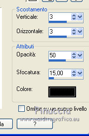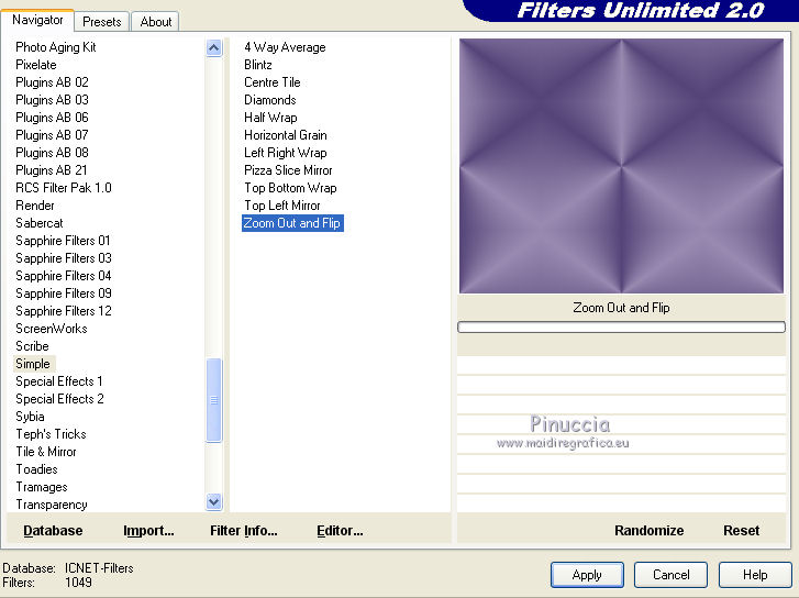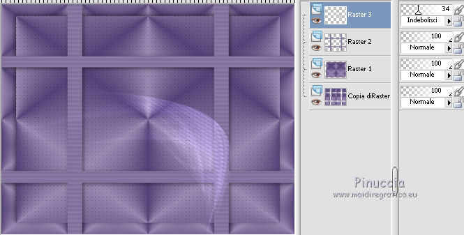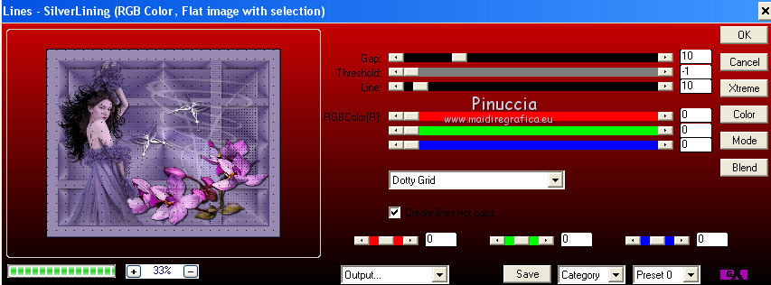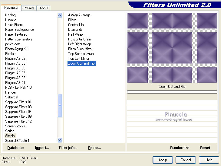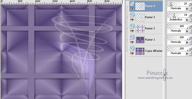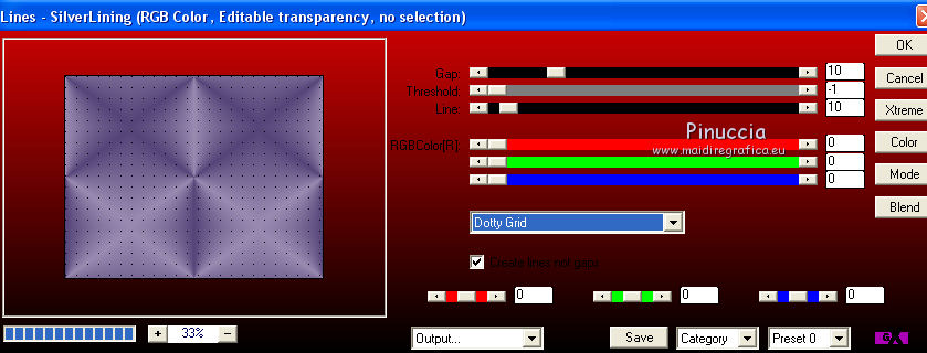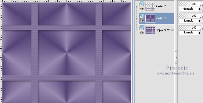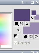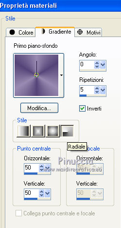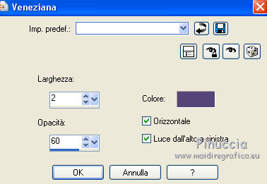 qui puoi trovare qualche risposta ai tuoi dubbi. Se l'argomento che ti interessa non è presente, ti prego di segnalarmelo. Il tutorial può essere eseguito con ogni versione di PSP. Dalla versione X4, il comando Immagine>Rifletti è stato sostituito con Immagine>Capovolgi in orizzontale, e il comando Immagine>Capovolgi con Immagine>Capovolgi in verticale. Nelle versioni X5 e X6, le funzioni sono state migliorate rendendo disponibile il menu Oggetti. Vedi la scheda sull'argomento qui Per tradurre questo tutorial ho usato PSP X. traduction en français qui Le vostre versioni qui Occorrente: Materiale qui Per i tubes grazie ClaudiaViza e Guta Melo. Filtri: consulta, se necessario, la mia sezione filtri qui Filters Unlimited 2.0 qui Simple - Diamonds, 4Way average qui AP 01 Innovations - Lines SilverLining qui I filtri Simple si possono usare da soli o importati in Filters Unlimited (come fare vedi qui) Se un filtro fornito appare con questa icona ![]() se stai usando altri colori, sperimenta le modalità di miscelatura e opacità più adatte ai tuoi colori 1. Imposta il colore di primo piano con #554478, e il colore di sfondo con il colore #998ab1. ![]() Passa il colore di primo piano a Gradiente di primo piano/sfondo, stile Radiale. nelle versioni più recenti di PSP il gradiente ha assunto la denominazione Corel_06-029. ![]() Apri una nuova immagine trasparente 700 x 550 pixels, e riempila con il gradiente.2. Effetti>Plugins>Filters Unlimited 2.0 - Simple - Zoom out and flip. ![]() 3. Livelli>Duplica. Immagine>Ridimensiona, al 90%, tutti i livelli non selezionato. 4. Effetti>Plugins>Filters Unlimited 2.0 - Simple - Zoom out and flip. ![]() 5. Attiva lo strumento Bacchetta magica , sfumatura e tolleranza 0e clicca nel bordo per selezionarlo. ![]() 6. Livelli>Nuovo livello raster. Riempi con il colore di sfondo.7. Effetti>Effetti di trama>Veneziana - colore scuro. ![]() Selezione>Deseleziona. 8. Effetti>Effetti 3D>Sfalsa ombra, colore nero. ![]() 9. Attiva il livello inferiore. Livelli>Disponi>Sposta su. ![]() 10. Rimani posizionato sul livello Raster 1. Effetti>Plugins>AP 01 Innovations - Lines SilverLining. ![]() 11. Immagine>Ridimensiona, al 90%, tutti i livelli non selezionato. 12. Effetti>Effetti 3D>Sfalsa ombra, con i settaggi precedenti. ![]() Ripeti l'Effetto Sfalsa ombra, cambiando verticale e orizzontale con -3. 13. Attiva il livello superiore. 14. Apri il tube nummer-88 e vai a Modifica>Copia. Torna al tuo lavoro e vai a Modifica>Incolla come nuovo livello. 15. Immagine>Ruota per gradi - 30 gradi a destra. ![]() Sposta il tube in basso a destra.La modalità di miscelatura e l'opacità di questo livello sono impostati in Indebolisci e 34%. ![]() 16. Apri il tube nummer-48 e vai a Modifica>Copia. Torna al tuo lavoro e vai a Modifica>Incolla come nuovo livello. Spostalo a destra.L'opacità del livello è impostata al 20%. ![]() 17. Apri il tube orggm.psp e vai a Modifica>Copia. Torna al tuo lavoro e vai a Modifica>Incolla come nuovo livello. Cambia la modalità di miscelatura di questo livello in Luce netta. 18. Effetti>Effetti 3D>Sfalsa ombra, colore nero. ![]() Sposta il tube a destra.19. Apri il tube Vlinder e vai a Modifica>Copia. Torna al tuo lavoro e vai a Modifica>Incolla come nuovo livello. Effetti>Effetti 3D>Sfalsa ombra, con i settaggi precedenti. 20. Immagine>Ridimensiona, 2 volte all'80%, tutti i livelli non selezionato. Immagine>Ruota per gradi - 30 gradi a destra. ![]() Livelli>Duplica due volte. Immagine>Rifletti e/o ruota a tuo piacimento, e posiziona le farfalle come preferisci.21. Apri il tube claudiaviza e vai a Modifica>Copia. Torna al tuo lavoro e vai a Modifica>Incolla come nuovo livello. Immagine>Ridimensiona, 1 volta all'80% e una volta al 90%, tutti i livelli non selezionato. Sposta il tube a sinistra.22. Effetti>Effetti 3D>Sfalsa ombra, con i settaggi precedenti. 23. Immagine>Aggiungi bordatura, 2 pixels, simmetriche, con il colore scuro. Imagine>Aggiungi bordatura, 35 pixels, simmetriche, con il colore chiaro. Immagine>Aggiungi bordatura, 2 pixels, simmetriche, con il colore scuro. 24. Attiva lo strumento Bacchetta magica ![]() e clicca nel bordo da 35 pixels per selezionarlo. 25. Effetti>Plugins>AP 01 Innovations - Lines SilverLining. ![]() 26. Selezione>Inverti. Effetti>Effetti 3D>Sfalsa ombra, con i settaggi precedenti. Selezione>Deseleziona. 27. Firma il tuo lavoro su un nuovo livello. Livelli>Unisci>Unisci tutto. Salva in formato jpg. ![]() Se hai problemi o dubbi, o trovi un link non funzionante, o anche soltanto per un saluto, scrivimi. 5 Maggio 2014 |