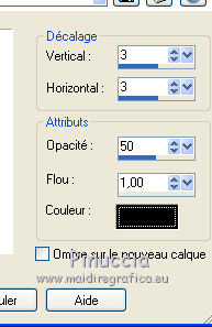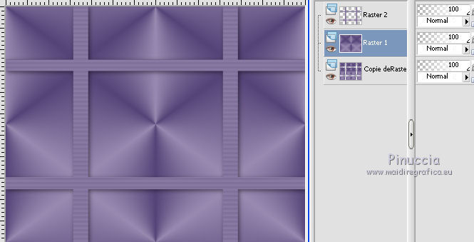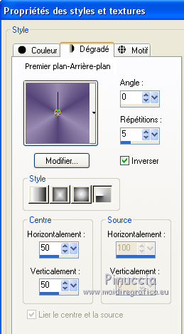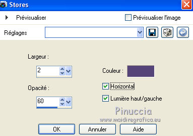 J'ai traduit ce tutoriel avec CorelX12, mais il peut également être exécuté avec les autres versions. Suivant la version utilisée, vous pouvez obtenir des résultats différents. Depuis la version X4, la fonction Image>Miroir a été remplacée par Image>Renverser horizontalement, et Image>Renverser avec Image>Renverser verticalement . Dans les versions X5 et X6, les fonctions ont été améliorées par la mise à disposition du menu Objets. Avec la nouvelle version X7, nous avons encore Image>Miroir et Image>Renverser/Retourner, mais avec nouvelles différences. Voir les détails à ce sujet ici Certaines dénominations ont changées entre les versions de PSP. Les plus frequentes dénominations utilisées: ![]() Traduction en italien ici Vos versions ici Nécessaire pour réaliser ce tutoriel: Matériel qui Pour les tubes utilisés merci ClaudiaViza e Guta Melo. Modules Externes: consulter, si nécessaire, ma section des filtres ici Filters Unlimited 2.0 qui Simple - Diamonds, 4Way average qui AP 01 Innovations - Lines SilverLining qui Filtres Simple peuvent être utilisés seuls ou importés dans Filters Unlimited. voir comment le faire ici). Si un filtre est fourni avec cette icône, ![]() Si vous voulez utiliser vos propres couleurs, n'hésitez pas à changer le mode et l'opacité des calques 1. Placer en avant plan la couleur #554478, et en arrière plan la couleur #998ab1. ![]() Préparer un dégradé d'avant plan/arrière plan, style Radial. (dans les versions plus recentes de PSP le dégradé d'avant plan/arrière plan est nommé Corel_06_029) ![]() 2. Ouvrir une nouvelle image transparente 700 x 550 pixels. Remplir l'image transparente avec le dégradé.2. Effets>Modules Externes>Filters Unlimited 2.0 - Simple - Zoom out and flip. ![]() 3. Calques>Dupliquer. Image>Redimensionner - à 90%, redimensionner tous les calques décoché. 4. Effets>Modules Externes>Filters Unlimited 2.0 - Simple - Zoom out and flip. ![]() 5. Activer l'Outil Baguette magique , tolérance et progressivité 0,et cliquer sur le bord pour le sélectionner. ![]() 6. Calques>Nouveau calque raster. Remplir avec la couleur d'arrière plan.7. Effets>Effets de textures>Stores - couleur foncée. ![]() Sélections>Désélectionner tout. 8. Effets>Effets 3D>Ombre portée, couleur noire. ![]() 9. Vous positionner sur le calque du bas de la pile. Calques>Agencer>Déplacer vers le haut. ![]() 10. Rester positionner sur le calque Raster 1. Effets>Modules Externes>AP 01 Innovations - Lines SilverLining. ![]() 11. Image>Redimensionner, à 90%, redimensionner tous les calques décoché. 12. Effets>Effets 3D>Ombre portée, comme précédemment. ![]() Répéter Ombre portée, mais vertical e hotizontal à -3. 13. Vous positionner sur le calque du haut de la pile. 14. Activer le tube nummer-88 - Édition>Copier. Revenir sur votre travail et Édition>Coller comme nouveau calque. 15. Image>Rotation libre - 30 degrés à droite. ![]() Déplacer le tube en bas à droite.Le tube est setter en mode Éclaircir, opacité 34. ![]() 16. Activer le tube nummer-48 - Édition>Copier. Revenir sur votre travail et Édition>Coller comme nouveau calque. Déplacer le tube à droite.L'opacité de ce tube est settée à 20%. ![]() 17. Activer le tube orggm.psp - Édition>Copier. Revenir sur votre travail et Édition>Coller comme nouveau calque. Placer le calque en mode Lumière dure. 18. Effets>Effets 3D>Ombre portée, couleur noire. ![]() Déplacer le tube à droite.19. Activer le tube Vlinder - Édition>Copier. Revenir sur votre travail et Édition>Coller comme nouveau calque. Effets>Effets 3D>Ombre portée, comme précédemment. Image>Redimensionner, 2 fois à 80%, redimensionner tous les calques décoché. Image>Rotation libre - 30 degrés à droite. ![]() Calques>Dupliquer - 2 fois. Image>Miroir e/o Rotation libre à votre convenance et positionner les papillons comme vous préferez.21. Activer le tube claudiaviza - Édition>Copier. Revenir sur votre travail et Édition>Coller comme nouveau calque. Image>Redimensionner, 1 fois à 80% et une fois à 90%, redimensionner tous les calques décoché. Déplacer le tube à gauche.22. Effets>Effets 3D>Ombre portée, comme précédemment. 23. Image>Ajouter des bordures, 2 pixels, symétrique, couleur foncée. Image>Ajouter des bordures, 35 pixels, symétrique, couleur claire. Image>Ajouter des bordures, 2 pixels, symétrique, couleur foncée. 24. Activer l'Outil Baguette magique , tolérance et progressivité 0,et cliquer sur le bord de 35 pixels, pour le sélectionner. 25. Effets>Modules Externes>AP 01 Innovations - Lines SilverLining. ![]() 26. Sélectons>Inverser. Effets>Effets 3D>Ombre portée, comme précédemment. Sélections>Désélectionner tout. 27. Signer votre travail sur un nouveau calque. Calques>Fusionner>Tous et enregistrer en jpg. ![]() Si vous avez des problèmes, ou des doutes, ou vous trouvez un link modifié, ou seulement pour me dire que ce tutoriel vous a plu, vous pouvez m'écrire. 10 Mai 2014 |