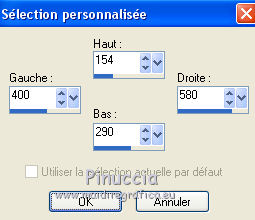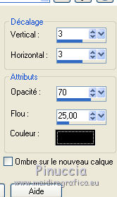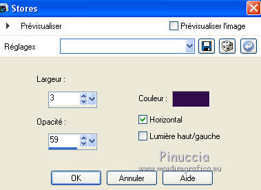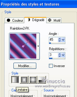 J'ai traduit ce tutoriel avec CorelX12, mais il peut également être exécuté avec les autres versions. Suivant la version utilisée, vous pouvez obtenir des résultats différents. Depuis la version X4, la fonction Image>Miroir a été remplacée par Image>Renverser horizontalement, et Image>Renverser avec Image>Renverser verticalement . Dans les versions X5 et X6, les fonctions ont été améliorées par la mise à disposition du menu Objets. Avec la nouvelle version X7, nous avons encore Image>Miroir et Image>Renverser/Retourner, mais avec nouvelles différences. Voir les détails à ce sujet ici Certaines dénominations ont changées entre les versions de PSP. Les plus frequentes dénominations utilisées: ![]() Traduction en italien ici Vos versions ici Nécessaire pour réaliser ce tutoriel: Matériel qui Pour le tube utilisé merci Sara. Modules Externes: consulter, si nécessaire, ma section des filtres ici Filters Unlimited 2.0 qui VM Extravaganza - Picture in picture qui VM Stylize - Zoom blur qui VM Toolbox - MirrororriM qui Mura's Meister - Copies qui Filtres VM Extravaganza, VM Stylize et VM Toolbox peuvent être utilisés seuls ou importés dans Filters Unlimited. voir comment le faire ici). Si un filtre est fourni avec cette icône, ![]() Si vous voulez utiliser vos propres couleurs, n'hésitez pas à changer le mode et l'opacité des calques Placer le tube à images dans le dossier Tubes à images. Placer le dégradé dans le dossier Dégradé. 1. Placer en avant plan le Dégradé Rainbow2 FK, style Linéaire. ![]() Placer en arrière plan la couleur #320d4e. ![]() 2. Ouvrir une nouvelle image transparente 750 x 550 pixels. Remplir l'image transparente avec le dégradé.3. Réglage>Flou>Flou gaussien - rayon 40. ![]() 4. Effets>Modules Externes>Filters Unlimited 2.0 - VM Extravaganza - Picture in picture. ![]() 5. Effets>Modules Externes>Filters Unlimited 2.0 - VM Toolbox - MirrororriM, par défaut. ![]() 6. Calques>Dupliquer. Image>Miroir. Image>Renverser. Réduire l'opacité de ce calque à 50%. Calques>Fusionner>Fusionner le calque de dessous. 7. Calques>Nouveau calque raster. Sélections>Sélectionner tout. Activer le tube TubeFlower-88613 - Édition>Copier. minimiser le tube, parce que vous l'utiliserez encore Revenir sur votre travail et Édition>Coller dans la sélection 8. Effets>Modules Externes>Filters Unlimited 2.0 - VM Stylize - Zoom blur, par défaut. ![]() Sélections>Désélectionner tout. Réduire l'opacité de ce calque à 18%. Effets>Effets de bords>Accentuer davantage. 9. Activez l'outil Sélection ,cliquez sur l'icone Sélection personnalisée ![]() avec ces settages: ![]() 10. Calques>Nouveau calque raster. Remplir la sélection avec le dégradé.11. Sélections>Modifier>Contracter - 5 pixels. Calques>Nouveau calque raster. Remplir avec la couleur d'arrière plan.Garder sélectionné. 12. Calques>Nouveau calque raster. Édition>Coller dans la sélection (le tube de la fleur est toujours en mémoire). 13. Réglage>Netteté>Netteté. Sélections>Désélectionner tout. 14. Calques>Fusionner>Fusionner le calque de dessous - 2 fois. 15. Effets>Modules Externes>Mura's Meister - Copies. ![]() Réduire l'opacité de ce calque à 24%. 16. Activer le tube Deco 3 - Édition>Copier. Revenir sur votre travail et Édition>Coller comme nouveau calque. Image>Redimensionner - à 80%, redimensionner tous les calque décoché. Placer le calque en mode Luminance (héritée), et réduire l'opacité à 60%. 17. Image>Rotation libre - 30 degrés à droite. ![]() Positionner le tube dans le coin en haut à gauche,dans la partie centrale. ![]() 18. Calques>Dupliquer. Image>Renverser. Résultat. ![]() 19. Activer le tube Hoek 2 - Édition>Copier. Revenir sur votre travail et Édition>Coller comme nouveau calque. Positionner le tube en bas à gauche, dans la partie centrale.![]() 20. Placer le calque en mode Lumière douce. Effets>Effets 3D>Ombre portée, couleur noire. ![]() 21. Calques>Nouveau calque raster. Sélection personnalisée ![]() ![]() Remplir la sélection avec le dégradé.22. Sélections>Modifier>Contracter - 5 pixels. Presser CANC sur le clavier ![]() 23. Sélections>Inverser. Vous positionner sur le calque du bas de la pile. Effets>Effets de textures>Stores, avec la couleur foncée. ![]() 24. Sélections>Inverser. Vous positionner sur le calque du haut de la pile. Sélections>Modifier>Agrandir - 5 pixels. 25. Effets>Effets 3D>Ombre portée, couleur noire. ![]() Répéter Ombre portée, mais avec vertical et horizontal à -3. Sélections>Désélectionner tout. Résultat. ![]() 26. Activer à nouveau le tube Flower-886139 - Édition>Copier. Revenir sur votre travail et Édition>Coller comme nouveau calque. Image>Redimensionner - 3 fois à 80%, redimensionner tous les calque décoché. Positionner le tube en bas à droite.![]() 27. Effets>Effets 3D>Ombre portée, couleur noire. ![]() 28. Calques>Dupliquer. Image>Redimensionner, à 80%, redimensionner tous les calques décoché. Déplacer ce tube en peu plus en haut à gauche.Réduire l'opacité de ce calque à 40%. Calques>Agencer>Déplacer vers le bas. ![]() 29. Image>Ajouter des bordures, 2 pixels, symétrique, avec la couleur d'arrière plan. 30. Calques>Nouvea calque raster. Activer l'Outil Tube à images ![]() chercher et sélectionner le tube à images Échelle 100. ![]() applique le tube sur l'image. Placer le calque en mode Luminance (héritée). 31. Effets>Effets 3D>Ombre portée, couleur noire. ![]() Calques>Dupliquer, 2 fois. Image>Miroir e/o Rotation libre, à votre convenance, et positionner les tubes comme vous préferez.32. Signer votre travail sur un nouveau calque. Calques>Fusionner>Tous, et enregistrer en jpg. ![]() Si vous avez des problèmes, ou des doutes, ou vous trouvez un link modifié, ou seulement pour me dire que ce tutoriel vous a plu, vous pouvez m'écrire. 10 Mai 2014 |