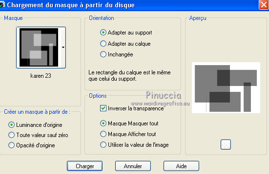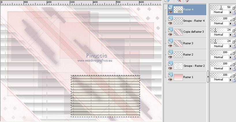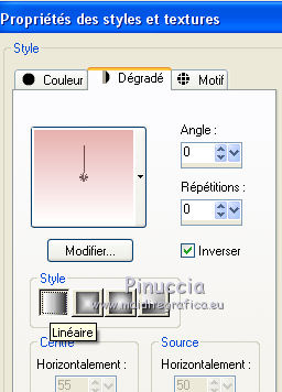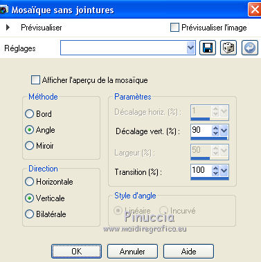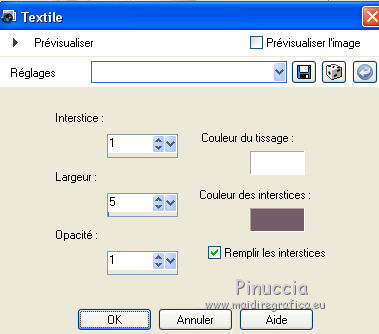 J'ai traduit ce tutoriel avec CorelX12, mais il peut également être exécuté avec les autres versions. Suivant la version utilisée, vous pouvez obtenir des résultats différents. Depuis la version X4, la fonction Image>Miroir a été remplacée par Image>Renverser horizontalement, et Image>Renverser avec Image>Renverser verticalement . Dans les versions X5 et X6, les fonctions ont été améliorées par la mise à disposition du menu Objets. Avec la nouvelle version X7, nous avons encore Image>Miroir et Image>Renverser/Retourner, mais avec nouvelles différences. Voir les détails à ce sujet ici Certaines dénominations ont changées entre les versions de PSP. Les plus frequentes dénominations utilisées: ![]() Traduction en italien ici Vos versions ici Nécessaire pour réaliser ce tutoriel: Matériel qui Pour le tube utilisé merci K@rine. Modules Externes: consulter, si nécessaire, ma section des filtres ici VanDerLee - Unplugged-X qui ![]() Si vous voulez utiliser vos propres couleurs, n'hésitez pas à changer le mode et l'opacité des calques Placer les masques dans le dossier Masques. 1. Placer en avant plan la couleur #e6b1af, et en arrière plan la couleur blanche #ffffff. ![]() Préparer en avant plan un dégradé d'avant plan/arrière plan, style Linéaire. ![]() 2. Ouvrir une nouvelle image transparente 700 x 500 pixels. Remplir avec le dégradé.3. Calques>Nouveau calque raster. Remplir avec la couleur d'arrière plan.4. Calques>Charger/Enregistrer un masque>Charger à partir du disque. Chercher et charger le masque karen 23, avec ces settages. ![]() Calques>Fusionner>Fusionner le groupe. Effets>Effets de bords>Accentuer. 5. Activer le tube ag-mb-les-115 - Édition>Copier. Revenir sur votre travail et Édition>Coller comme nouveau calque. Réduire l'opacité de ce calque à 24%. ![]() Effets>Effets de bords>Accentuer. 6. Calques>Dupliquer. Effets>Effets d'image>Mosaïque sans jointures. ![]() 7. Placer en avant plan la couleur #745d69. ![]() Calques>Nouveau calque raster. Remplir avec la nouvelle couleur d'avant plan.8. Calques>Charger/Enregistrer un masque>Charger à partir du disque. Chercher et charger le masque MaskerMB-79, avec ces settages. ![]() Calques>Fusionner>Fusionner le groupe. Effets>Effets de bords>Accentuer. 9. Calques>Dupliquer. Placer le calque en mode Assombrir. ![]() Calques>Fusionner>Fusionner le calque de dessous. 10. Calques>Nouveau calque raster. Activez l'outil Sélection ,cliquez sur l'icone Sélection personnalisée ![]() avec ces settages: ![]() 11. Effets>Modules Externes>VanDerLee - Unplugged-X. ![]() Réduire l'opacité de ce calque à 50%. ![]() Sélections>Désélectionner tout. 12. Activer le tube Tak-les-115 - Édition>Copier. Revenir sur votre travail et Édition>Coller comme nouveau calque. Déplacer le tube en bas à droite.![]() 13. Effets>Effets 3D>Ombre portée, couleur noire. ![]() 14. Activer le tube k@rine_ dreams _Pretty_Woman_1318_Novembre_2010, - Édition>Copier. Revenir sur votre travail et Édition>Coller comme nouveau calque. Image>Redimensionner, 2 fois à 80% et 1 fois à 85%, redimensionner tous les calques décoché. Positionner le tube à gauche.15. Effets>Effets 3D>Ombre portée, couleur noire. ![]() 16. Image>Ajouter des bordures, 1 pixel, symétrique, avec la nouvelle couleur d'avant plan #745d69. Ouvrir le menu déroulant de la palette Styles et Textures, et placer Dégradé. ![]() 17. Image>Ajouter des bordures, 40 pixels, symétrique, couleur blanche. Activer l'Outil Baguette magique , tolérance et progressivité 0,et cliquer sur le bord blanc pour le sélectionner. Remplir la sélection avec le dégradé.18. Sélections>Inverser. Effets>Effets 3D>Ombre portée, couleur noire. ![]() Répéter Ombre portée, mais vertical et horizontal à -5. 19. Sélections>Inverser. Effets>Effets de textures>Textile. Couleur du tissage: blanc - couleur des interstices: couleur d'avant plan #745d69. ![]() 20. Sélections>Transformer la sélection en calque. Sélections>Désélectionner tout. 21. Image>Miroir. Image>Renverser. Réduire l'opacité de ce calque à 50%. 22. Image>Ajouter des bordures, 1 pixel, symétrique, couleur d'avant plan #745d69. 23. Signer votre travail sur un nouveau calque. Calques>Fusionner>Tous et enregistrer en jpg. ![]() Si vous avez des problèmes, ou des doutes, ou vous trouvez un link modifié, ou seulement pour me dire que ce tutoriel vous a plu, vous pouvez m'écrire. 10 Mai 2014 |