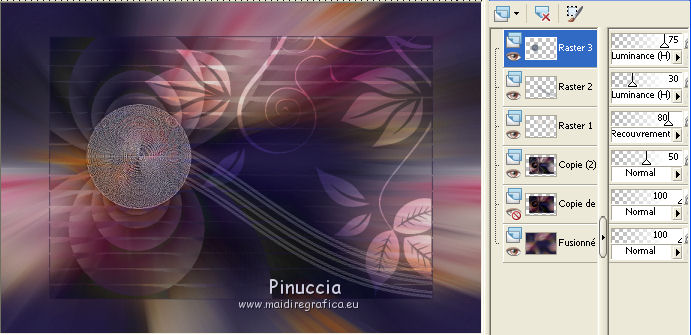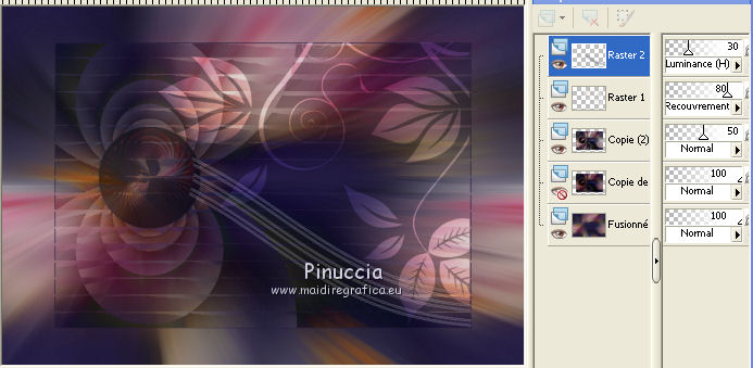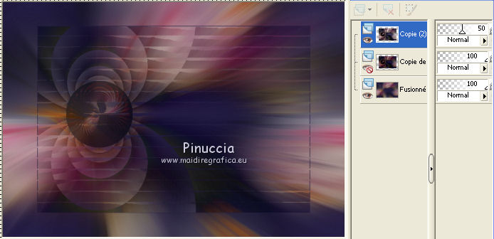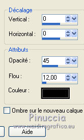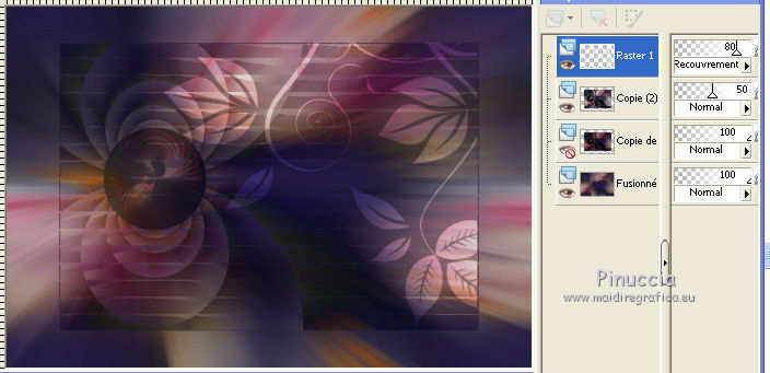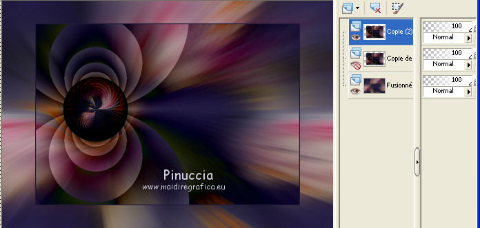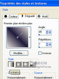J'ai traduit ce tutoriel avec CorelX12, mais il peut également être exécuté avec les autres versions. Suivant la version utilisée, vous pouvez obtenir des résultats différents. Depuis la version X4, la fonction Image>Miroir a été remplacée par Image>Renverser horizontalement, et Image>Renverser avec Image>Renverser verticalement. Dans les versions X5 et X6, les fonctions ont été améliorées par la mise à disposition du menu Objets. Dans la nouvelle version X7, nous avons à nouveau Miroir et Renverser, mais avec nouvelles différences. Voir le details à ce sujet ici Certaines dénominations ont changées entre les versions de PSP. Les plus frequentes dénominations utilisées: ![]() Traduction en italien ici Vos versions ici Nécessaire pour réaliser ce tutoriel: Matériel qui Pour le tube merci Maryse. Modules Externes: consulter, si nécessaire, ma section des filtres ici Filters Unlimited 2.0 qui Filter Factory Gallery Q qui Toadies - Rasterline qui Alien Skin Eye Candy 5 Impact - Perspective Shadow qui i filtri Factory Gallery e Toadies si possono usare da soli o importati in Filters Unlimited (come fare vedi qui) Se un filtro fornito si presenta con questa icona ![]() Si vous voulez utiliser vos propres couleurs, n'hésitez pas à changer le mode et l'opacité des calques Placer la sélection dans le dossier Sélections. 1. Placer en avant plan la couleur #e3ddd8, et en arrière plan la couleur #1f1a3a. ![]() Préparer un dégradé d'avant plan/arrière plan, style Linéaire. ![]() 2. Ouvrir une nouvelle image transparente 800 x 550 pixels. Sélections>Sélectionnet tout. Activer le tube MR_Rainbow Hair - Édition>Copier. Revenir sur votre travail et Édition>Coller dans la sélection. Sélections>Désélectionner tout. 3. Effets>Effets d'image>Mosaïque sans jointures. ![]() 4. Réglage>Flou>Flou radial. ![]() 5. Calques>Nouveau calque raster. Remplir le calque du dégradé.Calques>Agencer>Placer en bas de la pile. Calques>Fusionner>Calques visibles. Effets>Effets de bords>Accentuer. 6. Calques>Dupliquer. Effets>Modules Externes>Filters Unlimited 2.0 - Filter Factory Gallery Q - Gravity Blossom. ![]() selon vos versions, vous pourriez avoir ce-ci. ![]() 7. Image>Redimensionner - à 80%, redimensionner tous les calques décoché. 8. Sélections>Sélectionner tout. Sélections>Flottante. Sélections>Statique. 9. Calques>Nouveau calque raster. Remplir avec la couleur d'arrière plan.Sélections>Modifier>Contracter - 2 pixels. Presser CANC sur le clavier ![]() Sélections>Désélectionner tout. 10. Calques>Fusionner>Fusionner le calque de dessous. Calques>Dupliquer. 11. Fermer le calque original et rester positionner sur le calque du haut de la pile. ![]() Effetti>Plugins>Filters Unlimited 2.0 - Toadies - Rasterline. ![]() selon vos versions vous pourriez avoir ce-ci. ![]() Réduire l'opacité de ce calque à 50%. ![]() 12. Calques>Nouveau calque raster. Sélections>Charger/Enregistrer une sélections>Charger à partir du disque. Chercher et charger la sélection claire_baby_feuilles. ![]() Placer à nouveau la Couleur en avant plan. Remplir la sélection avec la couleur d'avant plan.Placer le calque en mode Recouvrement et réduire l'opacité à 80%. Sélections>Désélectionner tout. ![]() 13. Activer slinger-122 - Édition>Copier. Revenir sur votre travail et Édition>Coller comme nouveau calque. Déplacer le tube dans le cadre, en bas à droite.Placer le calque en mode Luminance (héritée) et réduire l'opacité à 30%. ![]() 14. Activer sierbal-122 - Édition>Copier. Revenir sur votre travail et Édition>Coller comme nouveau calque. Déplacer ce tube à gauche.![]() Garder le calque en mode Luminance (héritée) et réduire l'opacité à 75%. ![]() 15. Reouvrir et vous positionner sur le calque fermé. ![]() Effets>Effets 3D>Ombre portée, couleur noire. ![]() 16. Vous positionner sur le calque du haut de la pile. Activer à nouveau le tube MR_Rainbow Hair - Édition>Copier. Revenir sur votre travail et Édition>Coller comme nouveau calque. Image>Redimensionner, un fois à 80% et un fois à 85%, redimensionner tous les calques décoché. Déplacer le tube un peu plus à droite.17. Effets>Modules Externes>Alien Skin Eye Candy 5 Impact - Perspective Shadow. Sélectionner le preset Drop Shadow Blurry et ok. ![]() 18. Image>Ajouter des bordures, 3 pixels, symétrique, couleur d'arrière plan. Signer votre travail et enregistrer en jpg. Tubes utilisés: Annelies ![]() Guismo ![]() ![]() Si vous avez des problèmes, ou des doutes, ou vous trouvez un link modifié, ou seulement pour me dire que ce tutoriel vous a plu, vous pouvez m'écrire. 10 Aôut 2014 |