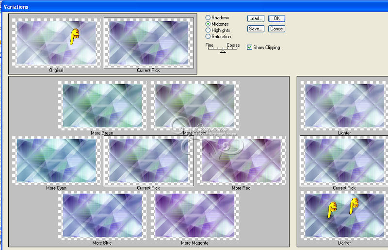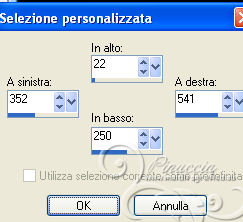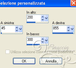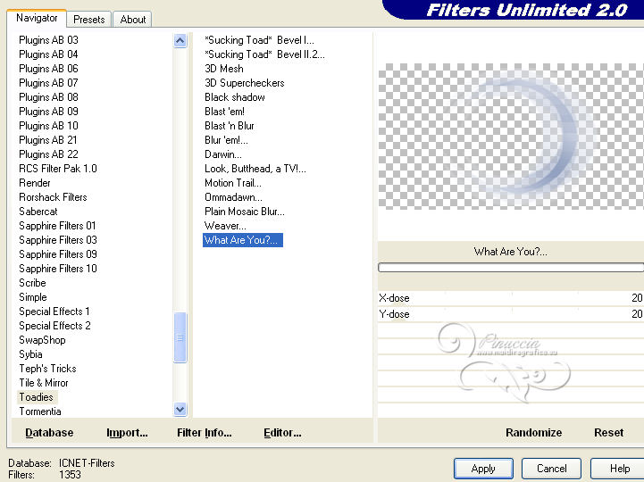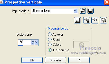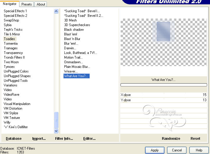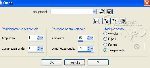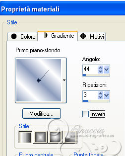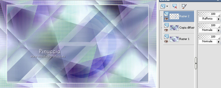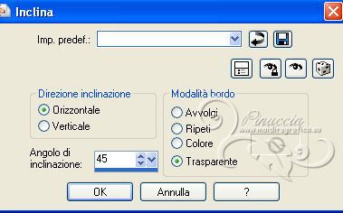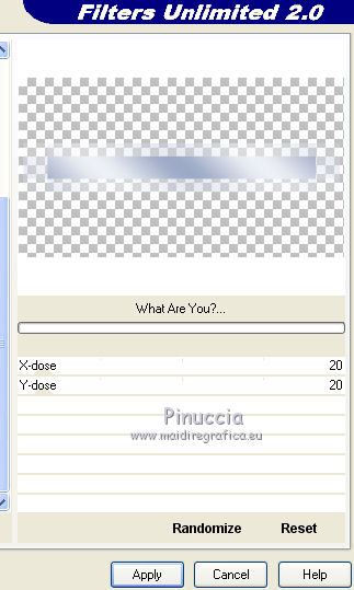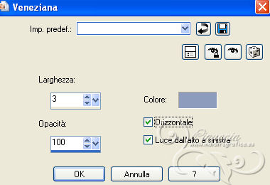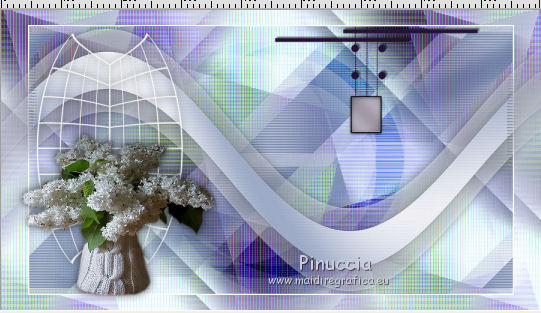 qui puoi trovare qualche risposta ai tuoi dubbi. Se l'argomento che ti interessa non è presente, ti prego di segnalarmelo. Dalla versione X4, il comando Immagine>Rifletti è stato sostituito con Immagine>Capovolgi in orizzontale, e il comando Immagine>Capovolgi con Immagine>Capovolgi in verticale. Nelle versioni X5 e X6, le funzioni sono state migliorate rendendo disponibile il menu Oggetti. Vedi la scheda sull'argomento qui Traduzione francese qui Le vostre versioni qui Occorrente: Materiale qui I tubes sono di GifCenneti e Sara. Filtri: consulta, se necessario, la mia sezione filtri qui Simple qui Adjust - Variations qui Filters Unlimited 2.0 qui Plugins AB 21 qui Toadies qui i filtri Plugins AB, Toadies e Simple si possono usare da soli o importati in Filters Unlimited (come fare vedi qui) Se un filtro fornito si presenta con questa icona ![]() se stai usando altri colori, sperimenta le modalità di miscelatura e opacità più adatte ai tuoi colori Metti la selezione nella cartella Selezioni. 1. Imposta il colore di primo piano con #8d9cbd, e il colore di sfondo con il colore bianco #ffffff. ![]() Passa il colore di primo piano a Gradiente, stile Lineare. ![]() 2. Apri una nuova immagine trasparente 900 x 500 pixels, e riempila con il gradiente.3. Effetti>Plugins>Simple - 4Way Average. 4. Effetti>Plugins>Simple - Blintz. 5. Livelli>Duplica. Immagine>Capovolgi. Abbassa l'opacità di questo livello al 50%. Livelli>Unisci>Unisci giù. 6. Effetti>Plugins>Simple - Diamonds. 7. Effetti>Plugins>Filters Unlimited 2.0 - Plugins AB 21 - Cheep Video Trick, con i settaggi standard. ![]() 8. Livelli>Duplica. Livelli>Nuovo livello raster. Attiva lo strumento Selezione ![]() clicca sull'icona Selezione personalizzata ![]() e imposta i seguenti settaggi. ![]() Riempi la selezione con il gradiente.8. Effetti>Effetti di trama>Veneziana - colore di primo piano #8d9cbd. ![]() Selezione>Deseleziona. 9. Effetti>Plugins>Filters Unlimited 2.0 - Toadies - What are you. questo effetto, per diversi motivi (versione di PSP, versione del filtro, colori...) può dare risultati differenti ![]() 10. Livelli>Duplica. Immagine>Capovolgi. Livelli>Unisci>Unisci giù. 11. Effetti>Effetti geometrici>Inclina. ![]() 12. Effetti>Effetti di immagine>Motivo unico. ![]() 13. Livelli>Unisci>Unisci giù. Immagine>Ridimensiona, al 90%, tutti i livelli non selezionato. 14. Selezione>Seleziona tutto. Selezione>Mobile. Selezione>Immobilizza. 15. Livelli>Nuovo livello raster. Riempi con il colore bianco.16. Selezione>Modifica>Contrai - 2 pixels. Premi sulla tastiera il tasto CANC ![]() Livelli>Unisci>Unisci giù. Selezione>Deseleziona. 16. Effetti>Plugins>Adjust - Variations. Un clic su Original per annullare eventuali precedenti settaggi memorizzati dal filtro. Due clic su Darker e ok. ![]() 17. Selezione>Carica/Salva selezione>Carica selezione da disco. Cerca e carica la selezione MB les 123. ![]() 18. Livelli>Nuovo livello raster. Riempi con il gradiente.19. Effetti>Effetti di trama>Veneziana, con i settaggi precedenti. ![]() Selezione>Deseleziona. 20. Effetti>Plugins>Filters Unlimited 2.0 - Toadies - What are you, con i settaggi standard. ![]() Cambia la modalità di miscelatura di questo livello in Rafforza. ![]() Livelli>Duplica. 21. Livelli>Nuovo livello raster. Attiva lo strumento Selezione ,clicca sull'icona Selezione personalizzata ![]() e imposta i seguenti settaggi: ![]() Riempi la selezione con il gradiente.Selezione>Deseleziona. 22. Effetti>Plugins>Filters Unlimited 2.0 - Toadies - What are you, con i settaggi standard. ![]() 23. Regola>Messa a fuoco>Metti a fuoco. 24. Premi il tasto K per attivare lo strumento Puntatore ![]() se stai usando PSP 9 il tasto D (valido per tutte le versioni) per attivare lo strumento Deformazione ![]() In modalità Scala spingi i nodi centrali a destra e a sinistra, ![]() fino a raggiungere il bordo bianco. ![]() Premi sulla tastiera il tasto M per deselezionare lo strumento. 25. Effetti>Effetti di distorsione>Onda. ![]() 26. Effetti>Effetti 3D>Sfalsa ombra, con il colore nero. ![]() 27. Apri Hekwerk. L'immagine è composta da 2 livelli. Attiva il livello Raster 2 e vai a Modifica>Copia. Torna al tuo lavoro e vai a Modifica>Incolla come nuovo livello. *** Se vuoi realizzare la figura da solo, non copiare il livello Raster 2, ma copia e incolla il livello Raster 1 ![]() e segui i punti 28-29. (Se hai incollato il livello Raster 2, passa al punto 30). 28. Effetti>Effetti geometrici>Prospettiva verticale. ![]() Sposta la figura in basso contro il bordo.![]() Livelli>Duplica. immagine>Capovolgi. Posiziona le due figure una contro l'altra.![]() Livelli>Unisci>Unisci giù. 29. Immagine>Ruota per gradi - 90 gradi a sinistra. ![]() Effetti>Effetti geometrici>Cerchio. ![]() Immagine>Ridimensiona, al 90%, tutti i livelli non selezionato. *** 30. Sposta la figura a sinistra.![]() 31. Effetti>Effetti 3D>Sfalsa ombra, con i settaggi precedenti. 31. Apri il tube Flower_886677 e vai a Modifica>Copia. Torna al tuo lavoro e vai a Modifica>Incolla come nuovo livello. Immagine>Ridimensiona, 3 volte all'80%, e una volta al 90%, tutti i livelli non selezionato. Sposta il tube in basso a sinistra.32. Effetti>Effetti 3D>Sfalsa ombra, con i settaggi precedenti. 33. Apri il tube deco-123-2 e vai a Modifica>Copia. Torna al tuo lavoro e vai a Modifica>Incolla come nuovo livello. Sposta il tube in alto a destra.![]() 34. Apri vierkantje e vai a Modifica>Copia. Torna al tuo lavoro e vai a Modifica>Incolla come nuovo livello. Livelli>Duplica - 8 o 9 volte, e posiziona i piccoli blocchi sulla griglia,e sul tube in alto a destra. ![]() 35. Apri il tube Woman tubes 68-HaZaL e vai a Modifica>Copia. Torna al tuo lavoro e vai a Modifica>Incolla come nuovo livello. Immagine>Ridimensiona, 1 volta all'80%, e una volta al 90%, tutti i livelli non selezionato. Sposta il tube in basso a destra.36. Effetti>Effetti 3D>Sfalsa ombra, con i settaggi precedenti. 37. Attiva il livello inferiore. Effetti>Effetti di immagine>Motivo unico, 