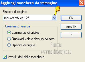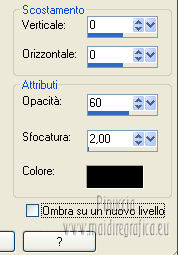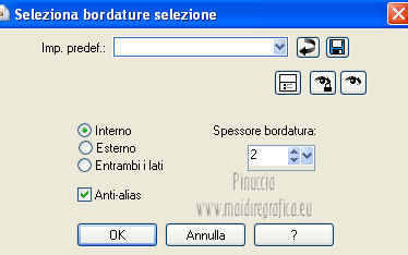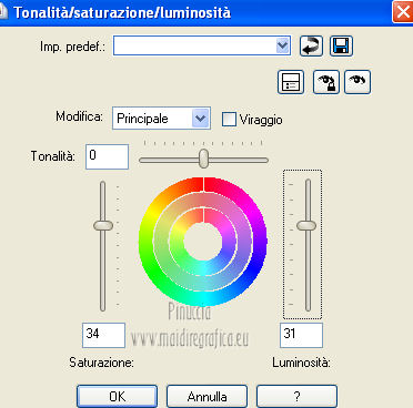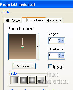 qui puoi trovare qualche risposta ai tuoi dubbi. Se l'argomento che ti interessa non è presente, ti prego di segnalarmelo. Per tradurre questo tutorial ho usato Corel X, ma può essere eseguito con ogni versione di PSP. Dalla versione X4, il comando Immagine>Rifletti è stato sostituito con Immagine>Capovolgi in orizzontale, e il comando Immagine>Capovolgi con Immagine>Capovolgi in verticale. Nelle versioni X5 e X6, le funzioni sono state migliorate rendendo disponibile il menu Oggetti. Con la nuova versione X7, sono tornati Rifletti/Capovolgi, ma con nuove differenze Vedi la scheda sull'argomento qui Le vostre versioni/Vos versions qui Occorrente: Materiale qui Filtri: consulta, se necessario, la mia sezione filtri qui Filters Unlimited 2.0 qui Simple - Diamonds qui Alien Skin Eye Candy 5 Impact - Perspective Shadow qui I filtri Simple si possono usare da soli o importati in Filters Unlimited ![]() Apri la maschera in PSP e minimizzala con il resto del materiale. Imposta il colore di primo piano con #bb9d7d, e il colore di sfondo con #38291e. ![]() Passa il colore di primo piano a Gradiente, stile Lineare. ![]() 1. Apri una nuova immagine trasparente 800 x 600 pixels, e riempila con il gradiente.2. Effetti>Plugins>Simple - Diamonds. 3. Livelli>Nuovo livello raster. Riempi il livello con il colore scuro.4. Livelli>Nuovo livello maschera>Da immagine. Apri il menu sotto la finestra di origine e vedrai la lista dei files aperti. Seleziona la maschera masker-mb-les-125, con i seguenti settaggi: ![]() Livelli>Unisci>Unisci gruppo. 5. Attiva il livello inferiore. Regola>Tonalità e saturazione>Tonalità/Saturazione/Luminosità. ![]() puoi regolare i settaggi se stai usando altri colori 6. Livelli>Unisci>Unisci visibile. 7. Livelli>Duplica. Immagine>Ridimensiona, al 90%, tutti i livelli non selezionato. 8. Selezione>Seleziona tutto. Selezione>Mobile. Selezione>Immobilizza. 9. Selezione>Modifica>Seleziona bordature selezione. ![]() 10. Riempi la selezione con il colore di sfondoModalità di corrispondenza dello strumento Riempimento impostata in Nessuno. ![]() Selezione>Deseleziona. 11. Effetti>Effetti 3D>Sfalsa ombra, con il colore nero. ![]() 12. Apri il tube decovase_2_exclusif_bycrealinemars 2012. Il tube contiene una selezione attiva ![]() Mantieni selezionato, Modifica>Copia e minimizza il tube che ti servirà ancora. Torna al tuo lavoro e via a Modifica>Incolla come nuovo livello. 13. Immagine>Ridimensiona, all'80%, tutti i livelli non selezionato. Regola>Messa a fuoco>Metti a fuoco. Sposta il ramo in alto a sinistra nel quadrato.14. Livelli>Duplica. Immagine>Ridimensiona, all'80%, tutti i livelli non selezionato. Regola>Messa a fuoco>Metti a fuoco. Spostalo nel secondo quadrato.15. Livelli>Duplica. Immagine>Ridimensiona, all'80%, tutti i livelli non selezionato. Spostalo nel terzo quadrato.![]() 16. Attiva nuovamente il tube decovase_2_exclusifbycrealinemars2012. Selezione>Deseleziona. Modifica>Copia. 17. Torna al tuo lavoro e via a Modifica>Incolla come nuovo livello. Sposta il tube in basso a destra.18. Effetti>Plugins>Alien Skin Eye Candy 5 Impact - Perspective Shadow. Seleziona il preset Drop Shadow Blurry e, sotto Basic, imposta Overall Opacity a 69. ![]() 19. Apri il tube e3bb4e31.psp e vai a Modifica>Copia. Torna al tuo lavoro e via a Modifica>Incolla come nuovo livello. Immagine>Ridimensiona, 4 volte all'80%, tutti i livelli non selezionato. 20. Effetti>Plugins>Alien Skin Eye Candy 5 Impact - Perspective Shadow, con i settaggi precedenti. 21. Attiva il livello inferiore. Effetti>Plugins>Simple - Diamonds. 22. Regola>Tonalità e saturazione>Viraggio>Tonalità/Saturazione>Luminosità, con i settaggi precedenti. ![]() per il mio esempio non ho applicato questo effetto perchè schiariva troppo il bordo. 23. Immagine>Aggiungi bordatura, 2 pixels, simmetriche, con il colore scuro. 24. Aggiungi il tuo nome e/o il tuo watermark su un nuovo livello. 25. Livelli>Unisci>Unisci tutto e salva in formato jpg. ![]() Se hai problemi o dubbi, o trovi un link non funzionante, o anche soltanto per un saluto, scrivimi. 3 Aprile 2013 |