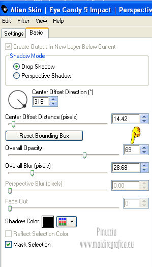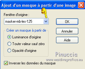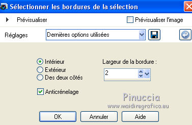 Pour traduire ce tutoriel j'ai utilisé Corel X2, mais il peut également être exécuté avec les autres versions. Suivant la version utilisée, vous pouvez obtenir des résultats différents. Depuis la version X4, la fonction Image>Miroir a été remplacée par Image>Renverser horizontalement, et Image>Renverser avec Image>Renverser verticalement. Dans les versions X5 et X6, les fonctions ont été améliorées par la mise à disposition du menu Objets. Dans la nouvelle version X7, nous avons à nouveau Miroir/Renverser, mais avec autres différences. Voir plus les détails à ce sujet ici Certaines dénominations ont changées entre les versions de PSP. Les plus frequentes dénominations utilisées: ![]() Traduction en italien ici Vos versions ici Nécessaire pour réaliser ce tutoriel: Matériel qui Modules Externes consulter, si nécessaire, ma section de filtre ici Filters Unlimited 2.0 ici Simple - Diamonds ici Alien Skin Eye Candy 5 Impact - Perspective Shadow qui Filtres Simple peuvent être utilisés seuls ou importés dans Filters Unlimited. voir comment le faire ici). Si un filtre est fourni avec cette icône, Suivant le s.o., la version de PSP et aussi la version d'Unlimited utilisés (est en circulation une version d'Unlimited qui n'a pas besoin d'installation et est composée de file en format .8bf) vous pourrez obtenir des résultats différents. ![]() Si vous voulez utiliser vos propres couleurs, n'hésitez pas à changer le mode et l'opacité des calques Ouvrir le masque dans PSP et le minimiser avec le reste du matériel. 1. Placer en avant plan la couleur #bb9d7d, et en arrière plan la couleur #38291e. ![]() Préparer un dégradé de premier plan/arrière plan, style Linéaire. ![]() Ouvrir une nouvelle image transparente 800 x 600 pixels Remplir l'image du dégradé.2. Effets>Modules Externes>Simple - Diamonds. 3. Calques>Nouveau calque raster. Remplir le calque avec la couleur foncée.4. Calques>Nouveau calque de masque>A partir d'une image. Ouvrir le menu deroulant sous la fenêtre d'origine et vous verrez la liste des images ouverts. Sélectionner le masque masker-mb-les-125. ![]() Calques>Fusionner>Fusionner le groupe. 5. Vous positionner sur le calque du bas de la pile. Réglage>Teinte et Saturation>Teinte/Saturation/Luminosité. ![]() vous pouvez règler les paramètres en fonction de vos couleurs 6. Calques>Fusionner>Calques visibles. 7. Calques>Dupliquer. Image>Redimensionner, 90%, redimensionner tous les calques décoché. 8. Sélections>Sélectionner tout. Sélections>Flottante. Sélections>Statique. 9. Sélections>Modifier>Sélectionner les bordures de la sélection. ![]() 10. Remplir la sélection avec la couleur d'arrière plan.Mode de correspondance de l'outil Pot de peinture sur Aucun. ![]() Sélections>Désélectionner tout. 11. Effets>Effets 3D>Ombre portée, couleur noire. ![]() 12. Activer le tube decovase_2_exclusif_bycrealinemars 2012. Le tube a une sélection active. ![]() Garder sélectionné et Édition>Copier, et minimiser le tube: on va s'en servir plus tard. Revenir sur votre travail et Édition>Coller comme nouveau calque. 13. Image>Redimensionner, à 80%, redimensionner tous les calques décoché. Réglage>Netteté>Netteté. Déplacer la branche en haut à gauche dans le cadre.14. Calques>Dupliquer. Image>Redimensionner, à 80%, redimensionner tous les calques décoché. Réglage>Netteté>Netteté. Déplacer dans le deuxière cadre.15. Calques>Dupliquer. Image>Redimensionner, à 80%, redimensionner tous les calques décoché. Déplacer dans le troisième cadre.![]() 16. À nouveau activer le tube decovase_2_exclusifbycrealinemars2012. Sélections>Désélectionner tout. Édition>Copier. 17. Revenir sur votre travail et Édition>Coller comme nouveau calque. Déplacer le tube en bas à droite.18. Effets>Modules Externes>Alien Skin Eye Candy 5 Impact - Perspective Shadow. Sélectionner le preset Drop Shadow Blurry et, sous Basic, placer Overall Opacity à 69. ![]() 19. Activer le tube e3bb4e31.psp - Édition>Copier. Revenir sur votre travail et Édition>Coller comme nouveau calque. Image>Redimensionner, 4 fois à 80%, redimensionner tous les calques décoché. 20. Effets>Modules Externes>Alien Skin Eye Candy 5 Impact - Perspective Shadow, comme précédemment. 21. Vous positionner sur le calque du bas de la pile. Effets>Modules Externes>Simple - Diamonds. 22. Réglage>Teinte et Saturation>Teinte/Saturation/Luminosité, comme précédemment. ![]() pour mon exemple je n'ai pas appliqué cet effet, parce que faisait pâlir trop le bord 23. Image>Ajouter des bordures, 2 pixels, symétrique, couleur foncée. 24. Signer votre travail sur un nouveau calque. 25. Calques>Fusionner>Tous et enregistrer en jpg. ![]() Si vous avez des problèmes, ou des doutes, ou vous trouvez un link modifié, ou seulement pour me dire que ce tutoriel vous a plu, vous pouvez m'écrire. 3 Juin 2015 |