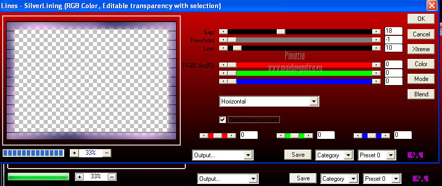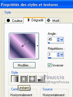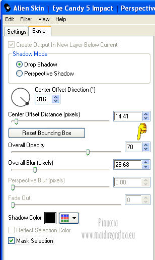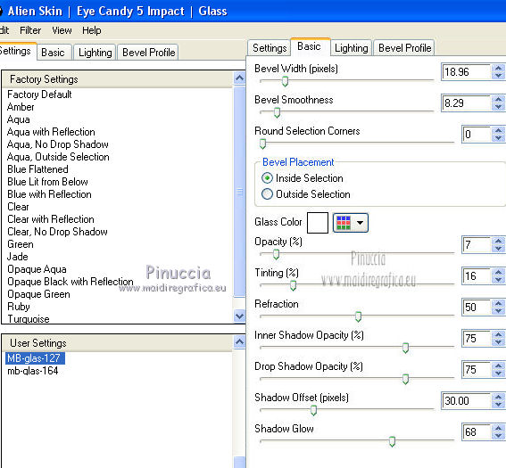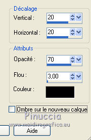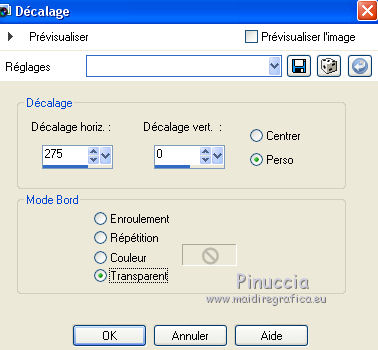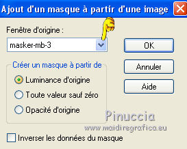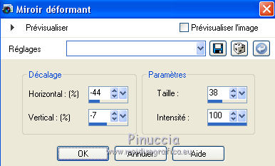 Pour traduire ce tutoriel j'ai utilisé Corel X2, mais il peut également être exécuté avec les autres versions. Suivant la version utilisée, vous pouvez obtenir des résultats différents. Depuis la version X4, la fonction Image>Miroir a été remplacée par Image>Renverser horizontalement, et Image>Renverser avec Image>Renverser verticalement. Dans les versions X5 et X6, les fonctions ont été améliorées par la mise à disposition du menu Objets. Dans la nouvelle version X7, nous avons à nouveau Miroir/Renverser, mais avec autres différences. Voir plus les détails à ce sujet ici Certaines dénominations ont changées entre les versions de PSP. Les plus frequentes dénominations utilisées: ![]() Traduction en italien ici Vos versions ici Nécessaire pour réaliser ce tutoriel: Matériel qui Modules Externes consulter, si nécessaire, ma section de filtre ici L&K's Landsiteofwonders - Zitah ici AP 01 [Innovations] - Lines SilverLining ici &<Bkg Designer sf10II> (da importare in Unlimited) ici Alien Skin Eye Candy 5 Impact - Glass, Perspective Shadow ici ![]() Si vous voulez utiliser vos propres couleurs, n'hésitez pas à changer le mode et l'opacité des calques Placer le preset En cliquant sur le preset une ou deux fois (selon vos réglages) automatiquement il se placera directement dans le dossier Settings de Alien Skin Eye Candy. pourquoi un ou deux clic voir ici Ouvrir le masque dans PSP et le minimiser avec le reste du matériel. 1. Placer en avant plan la couleur #323260, et en arrière plan la couleur #f9c6fa. ![]() Préparer un dégradé de premier plan/arrière plan, style Linéaire. ![]() Ouvrir une nouvelle image transparente 900 x 600 pixels Remplir l'image du dégradé.2. Réglage>Flou>Flou gaussien - rayon 20. ![]() 3. Calques>Nouveau calque raster. Remplir le calque avec la couleur d'arrière plan.4. Calques>Nouveau calque de masque>A partir d'une image. Ouvrir le menu deroulant sous la fenêtre d'origine et vous verrez la liste des images ouverts. Sélectionner le masque masker-mb-3. ![]() Calques>Fusionner>Fusionner le groupe. Placer le calque en mode Lumière douce, ou en fonction de vos couleurs. 5. Calques>Nouveau calque raster. Activer l'outil Sélection ![]() (peu importe le type de sélection, parce que avec la sélection personnalisée vous obtenez toujours un rectangle), cliquer sur Sélection personnalisée ![]() et setter ces paramètres. ![]() Remplir la sélection avec la couleur claire d'arrière plan.6. Sélections>Modifier>Contracter - 15 pixels. Remplir avec la couleur d'avant plan.Sélections>Désélectionner tout. 7. Image>Redimensionner, 2 fois à 80%, redimensionner tous les calques décoché. 8. Effets>Effets de distorsion>Miroir déformant. ![]() 9. Effets>Effets d'image>Décalage. ![]() 10. Calques>Dupliquer. Image>Redimensionner, 80%, redimensionner tous les calques décoché. 11. Effets>Effets d'image>Décalage. ![]() 12. Calques>Fusionner>Fusionner le calque de dessous. 13. Effets>Modules Externes>L & K's landsiteofwonders - L&K Zitah. ![]() Placer le calque en mode Recouvrement et réduire l'opacité à 75%. 14. Calques>Dupliquer. Image>Miroir. 15. Sélection personnalisée ![]() ![]() 16. Calques>Nouveau calque raster. Remplir la sélection avec la couleur d'arrière plan.Sélections>Désélectionner tout. 17. Effets>Modules Externes>Alien Skin Eye Candy 5 Impact - Glass. Sélectionner le preset MB-glas-127 et ok. En cas de problèmes avec le preset, copier les règlages ci-dessous. ![]() 18. Calques>Dupliquer. Effets>Effets d'image>Décalage. ![]() Calques>Fusionner>Fusionner le calque de dessous. 19. Calques>Dupliquer. Image>Miroir. Calques>Fusionner>Fusionner le calque de dessous. 20. Calques>Dupliquer. Image>Renverser. 21. Image>Ajouter des bordures, 1 pixel, symétrique, couleur foncée d'avant plan. Édition>Copier. 21. Image>Ajouter des bordures, 45 pixels, symétrique, couleur d'arrière plan. Activer l'outil Baguette magique , tolérance et progressivité 0,et cliquer dans le bord pour le sélectionner. 22. Calques>Nouveau calque raster. Édition>Coller dans la sélection. 23. Réglage>Flou>Flou gaussien - rayon 20. ![]() 24. Effets>Modules Externes>AP Lines - Lines SilverLining. ![]() 25. Sélections>Inverser. Effets>Effets 3D>Ombre portée, avec la couleur d'avant plan. ![]() Répéter Ombre portée, mais vertical et horizontal -20. Sélections>Désélectionner tout. 26. Activer le tube 2c46b096 - Édition>Copier. Revenir sur votre travail et Édition>Coller comme nouveau calque. 27. Effets>Modules Externes>Alien Skin Eye Candy 5 Impact - Perspective Shadow. Sélectionner le preset Drop Shadow Blurry et changer Overall Opacity à 70. ![]() 28. Image>Ajouter des bordures, 1 pixel, symétrique, couleur foncée d'avant plan. 29. Image>Redimensionner, 80%, ou à votre convenance, redimensionner tous les calques décoché. 30. Signer votre travail sur un nouveau calque. 31. Calques>Fusionner>Tous et enregistrer en jpg. ![]() Si vous avez des problèmes, ou des doutes, ou vous trouvez un link modifié, ou seulement pour me dire que ce tutoriel vous a plu, vous pouvez m'écrire. 3 Juin 2015 |